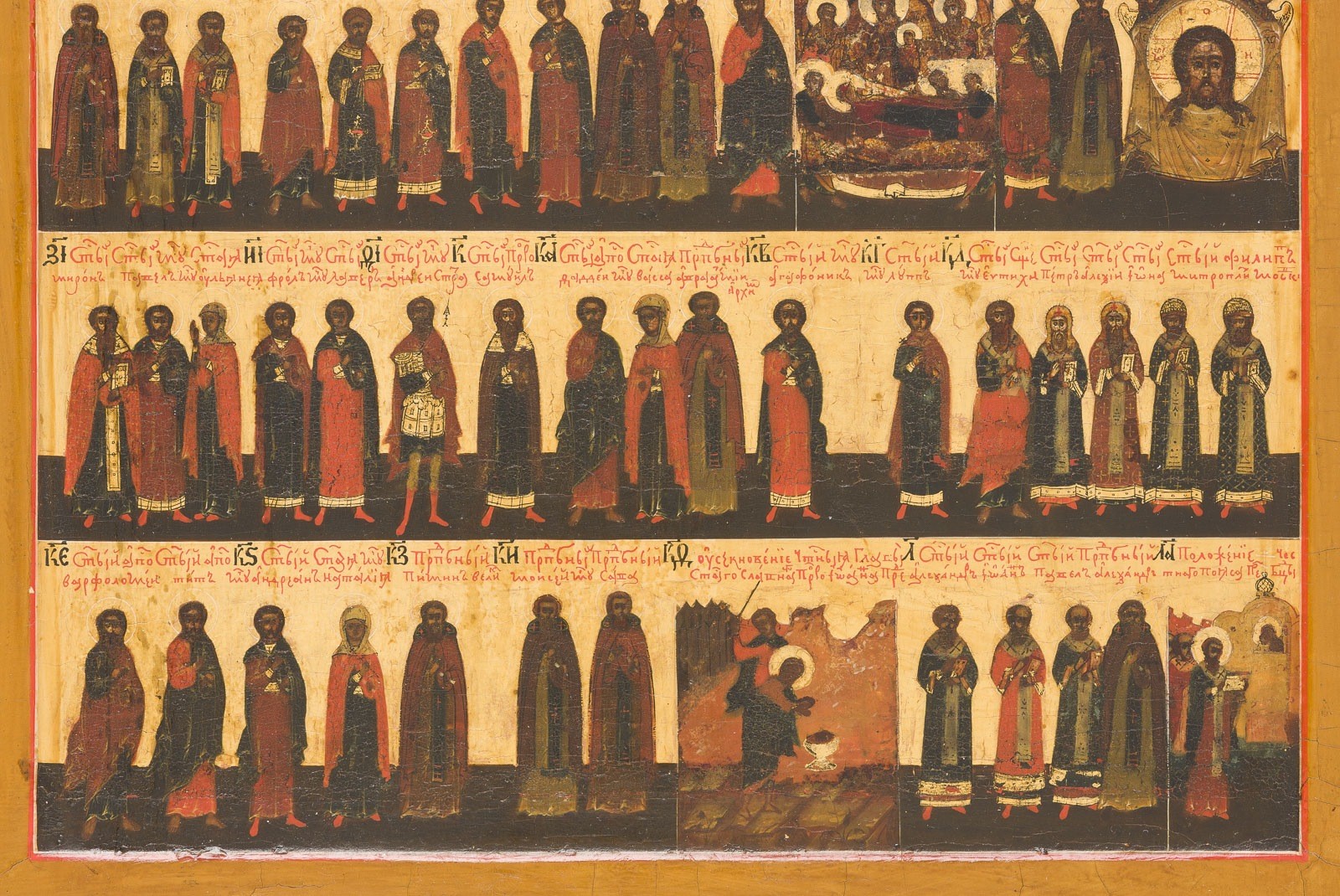 A VERY FINE MENOLOGICAL ICON FOR THE MONTH OF AUGUST Russian, Moscow or Solvychegodsk, Stroganov School, first third of the 17th century Tempera on wood panel with double kovcheg, gold ground. Set into a later panel (vrezka), minor retouching. 30.8 x 26.4 cm.