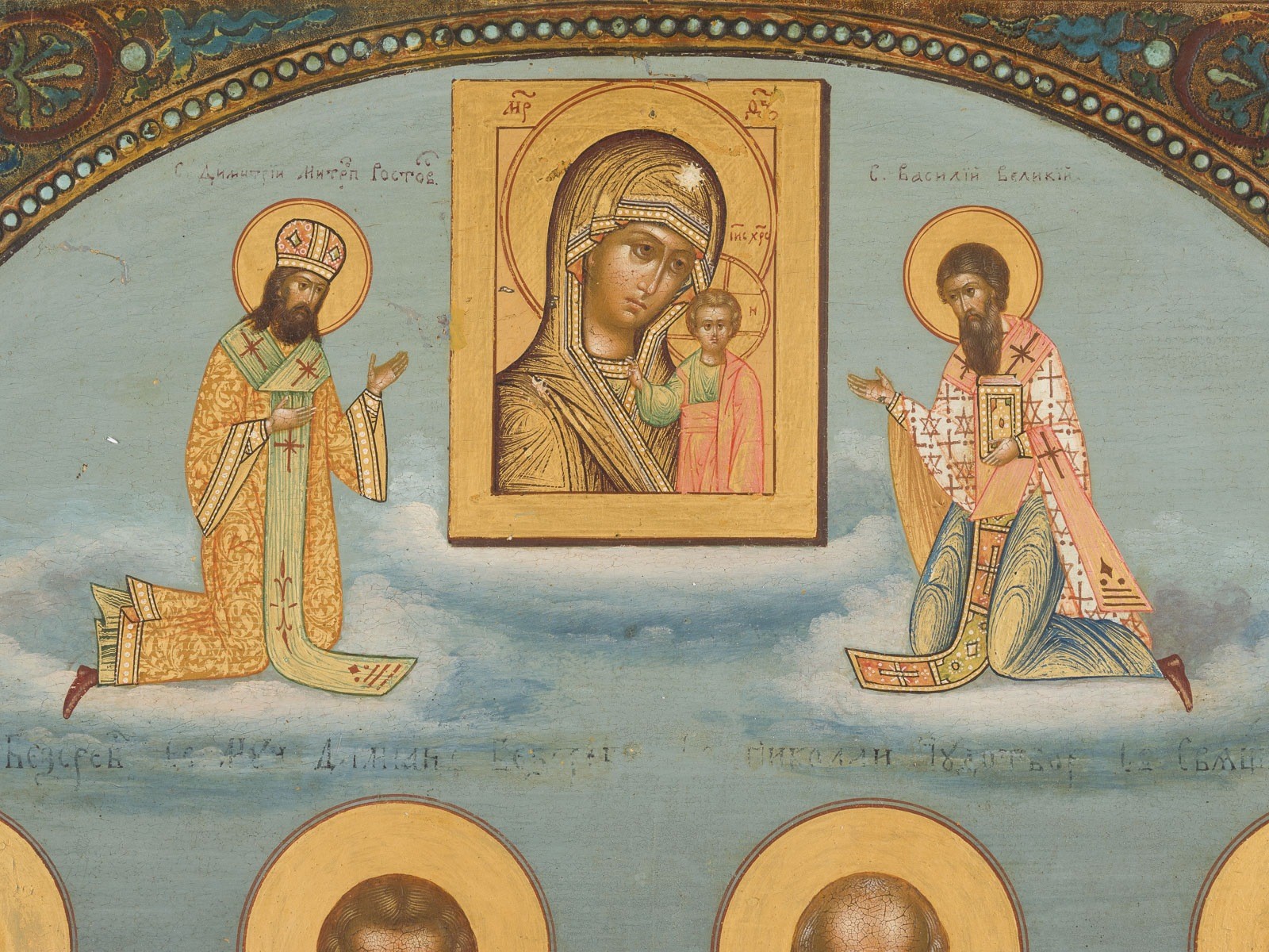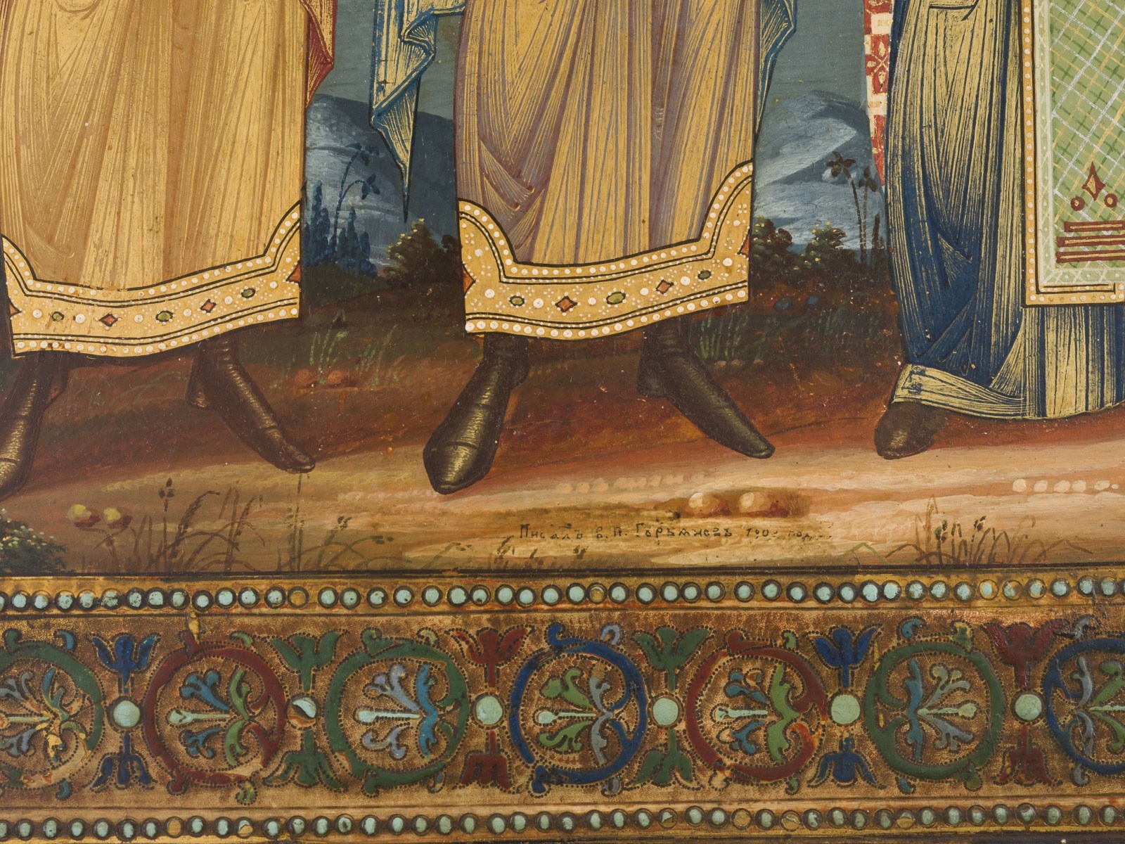 VASSILY PAVLOVICH GURYANOV 1867-1920 A VERY FINE SIGNED AND DATED ICON DEPICTING SAINTS COSMAS, DAMIAN, NICHOLAS OF MYRA AND ATHENOGENES Russia, Moscow, dated 1902 Heavy cypress wood panel with two inserted splines on the reverse. Egg tempera on chalk ground, haloes gilded, drapery highlighted in chrysography. Cyrillic signature and date along the lower border: "Painted by V. P. Guryanov, 1902". The saints rendered frontally and full-length. Above them appear Saints Basil the Great and Demetrius, Metropolitan of Rostov, venerating the Icon of the Mother of God of Kazan. 35.5 × 30.7 cm. The reverse with applied plaque bearing a Cyrillic dedicatory inscription: "1867-1902. Presented to His Reverence Father Nikolai Pavlovich Zakharov by the parish community in grateful recognition, in commemoration of his holy priestly service in the village of Karas, 16 July 1902." Exhibited: Lebendige Zeugen: Datierte und signierte Ikonen in Russland um 1900, Katalog zur Ausstellung im Ikonen-Museum Frankfurt 2005, cat. 16.