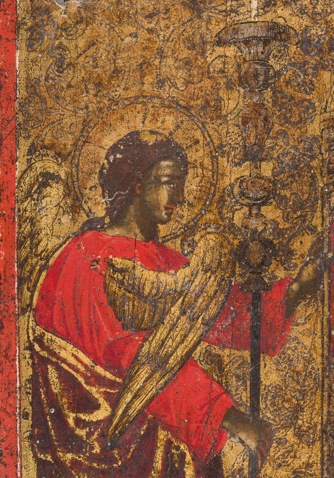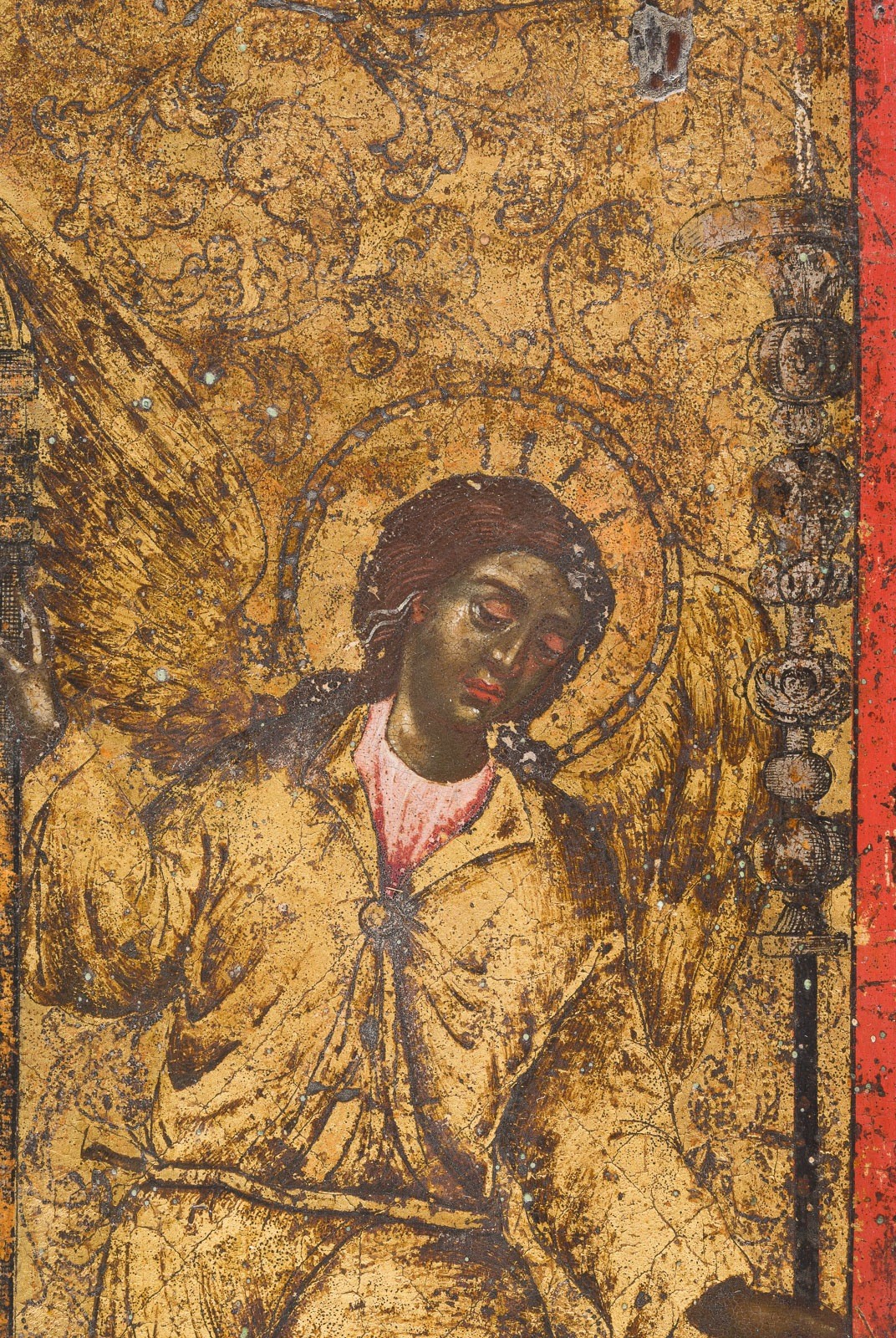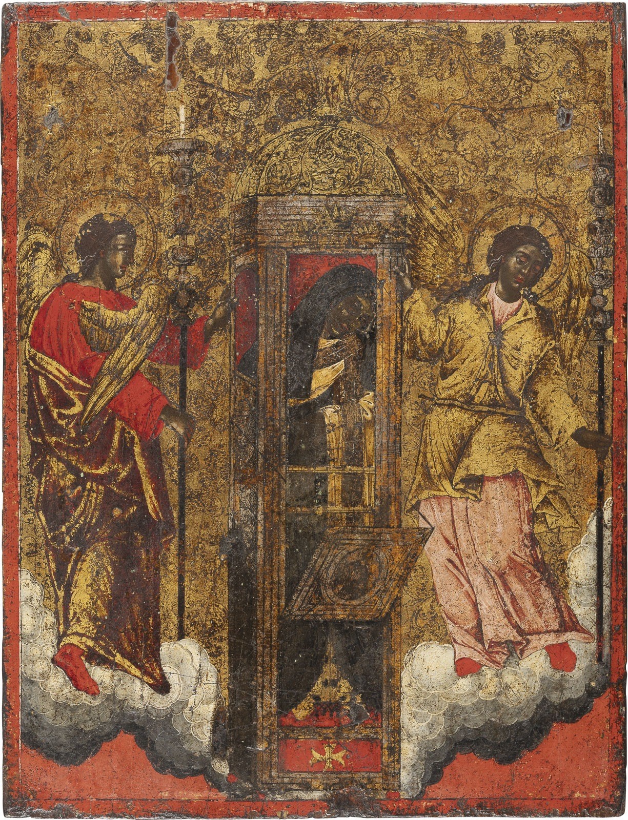 A VERY FINE AND LARGE ICON SHOWING ST. SPIRIDON OF CORFU Greek, 17th century Tempera on wood panel. Finely executed on a gold ground. The saint depicted within his elaborate reliquary flanked by two angels. Minor paint losses. 39.3 x 30 cm.