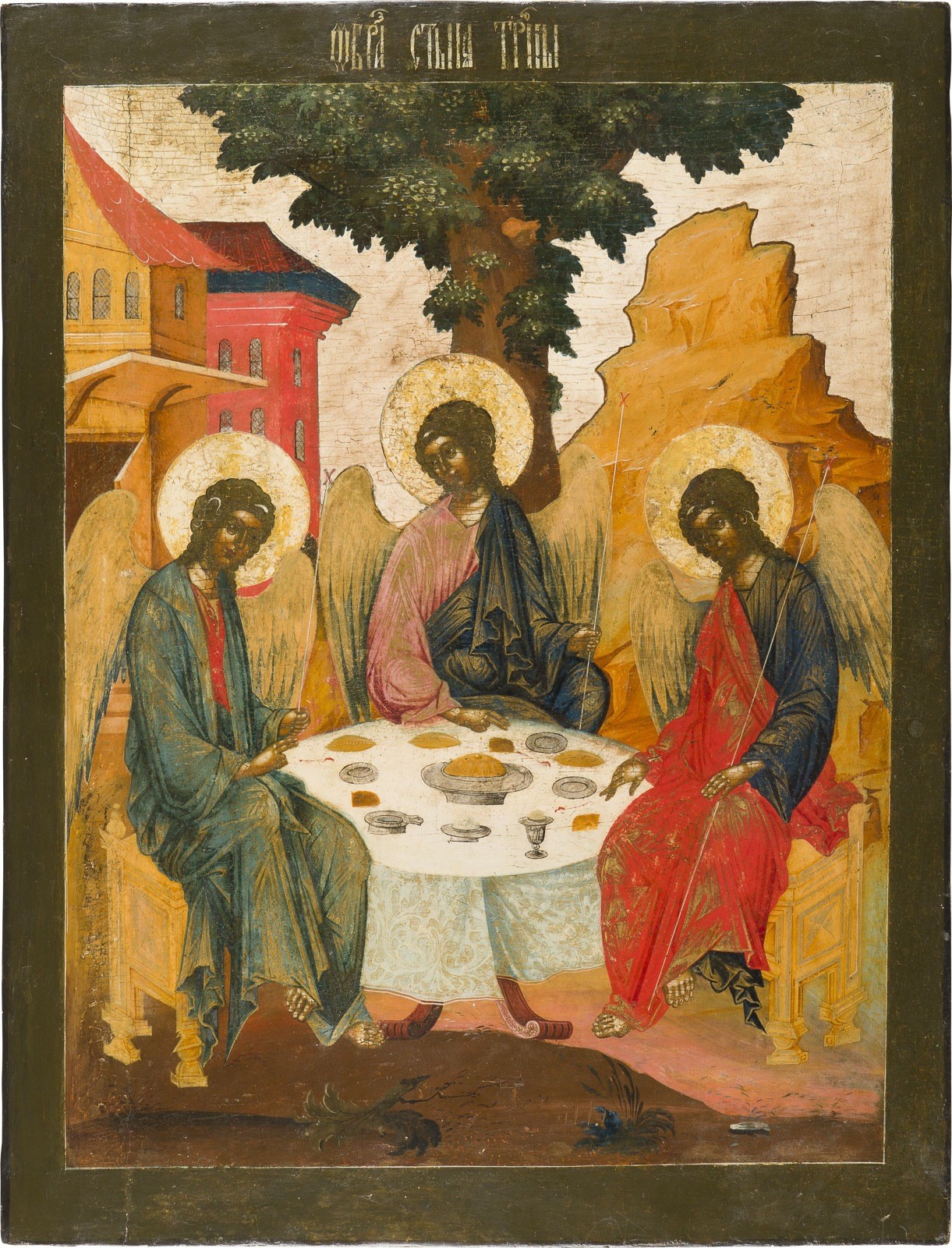 SEHR FEINE UND GROSSFORMATIGE IKONE MIT DER ALTTESTAMENTLICHEN DREIFALTIGKEIT