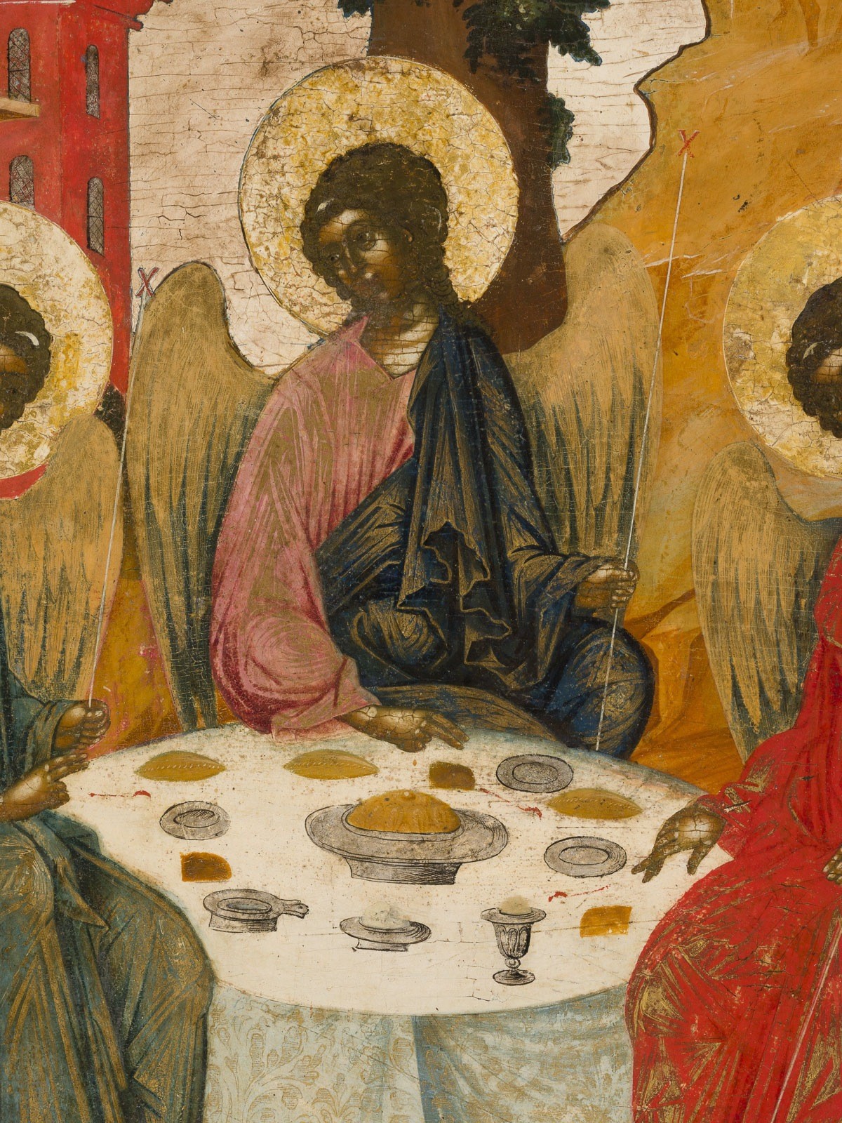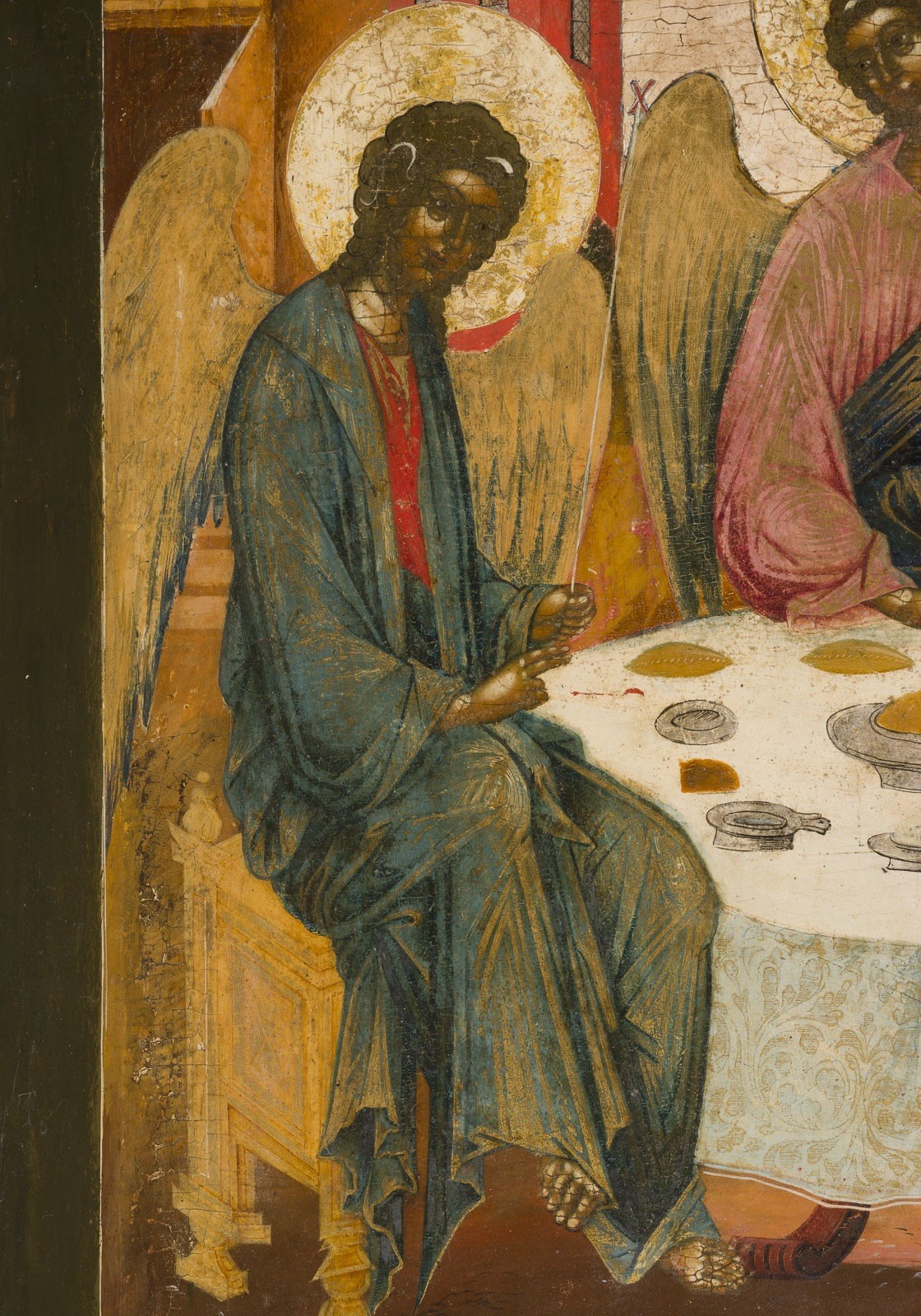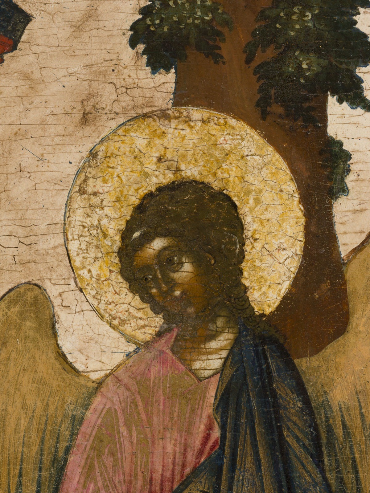 A VERY FINE AND LARGE ICON SHOWING THE OLD TESTAMENT TRINITY Russian, Moscow, circle of the Armoury Chamber, circa 1700 Tempera on wood panel. The haloes made of gold. The figures of the angel bending slightly forward with a diadem on the curly hair. Refined face executed in brown and modelled with the use of red and green shades. The background stripped to the levkas. 54.2 x 42.4 cm.