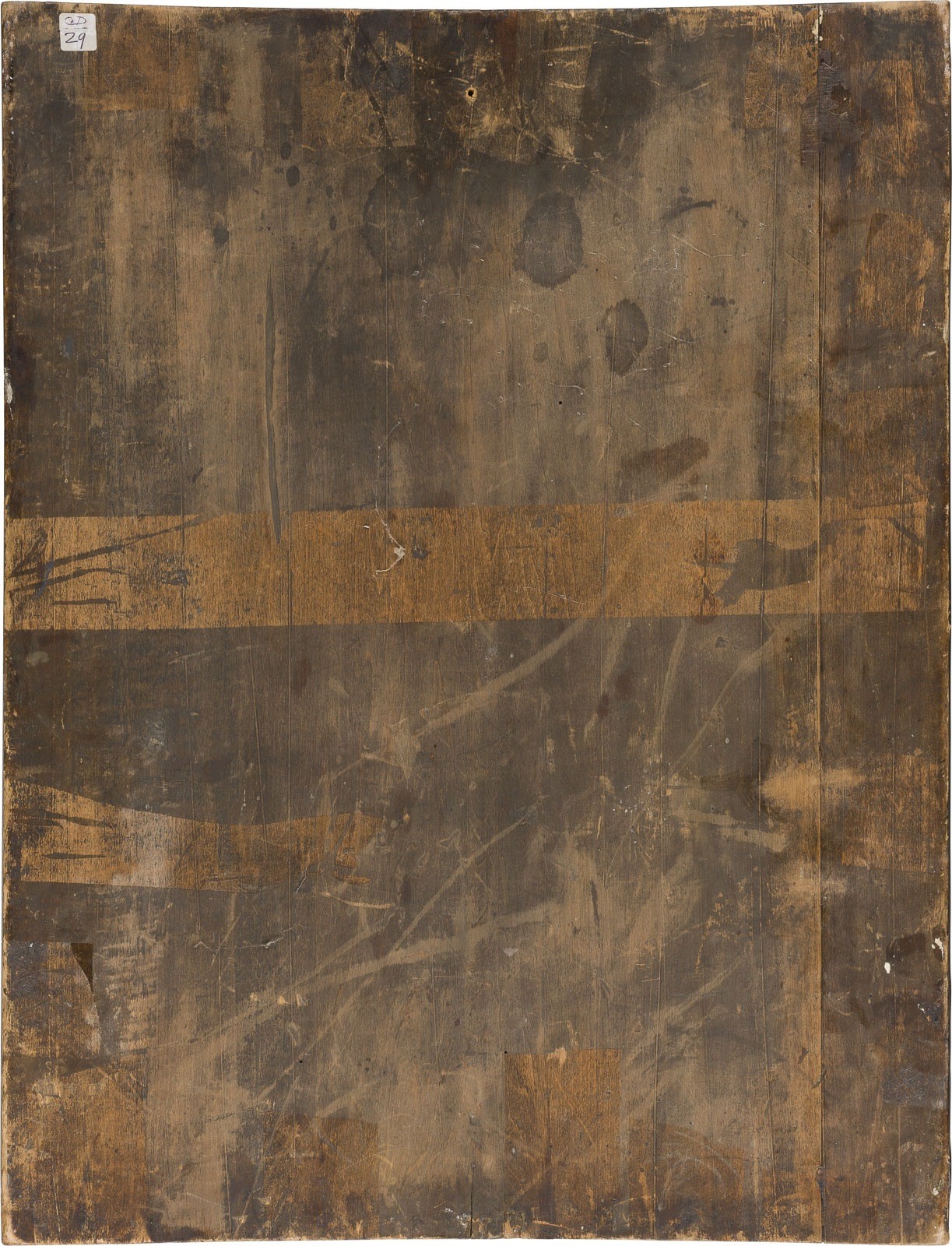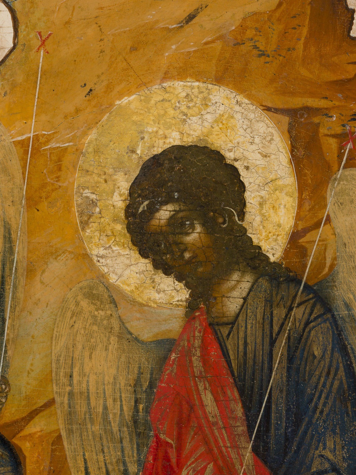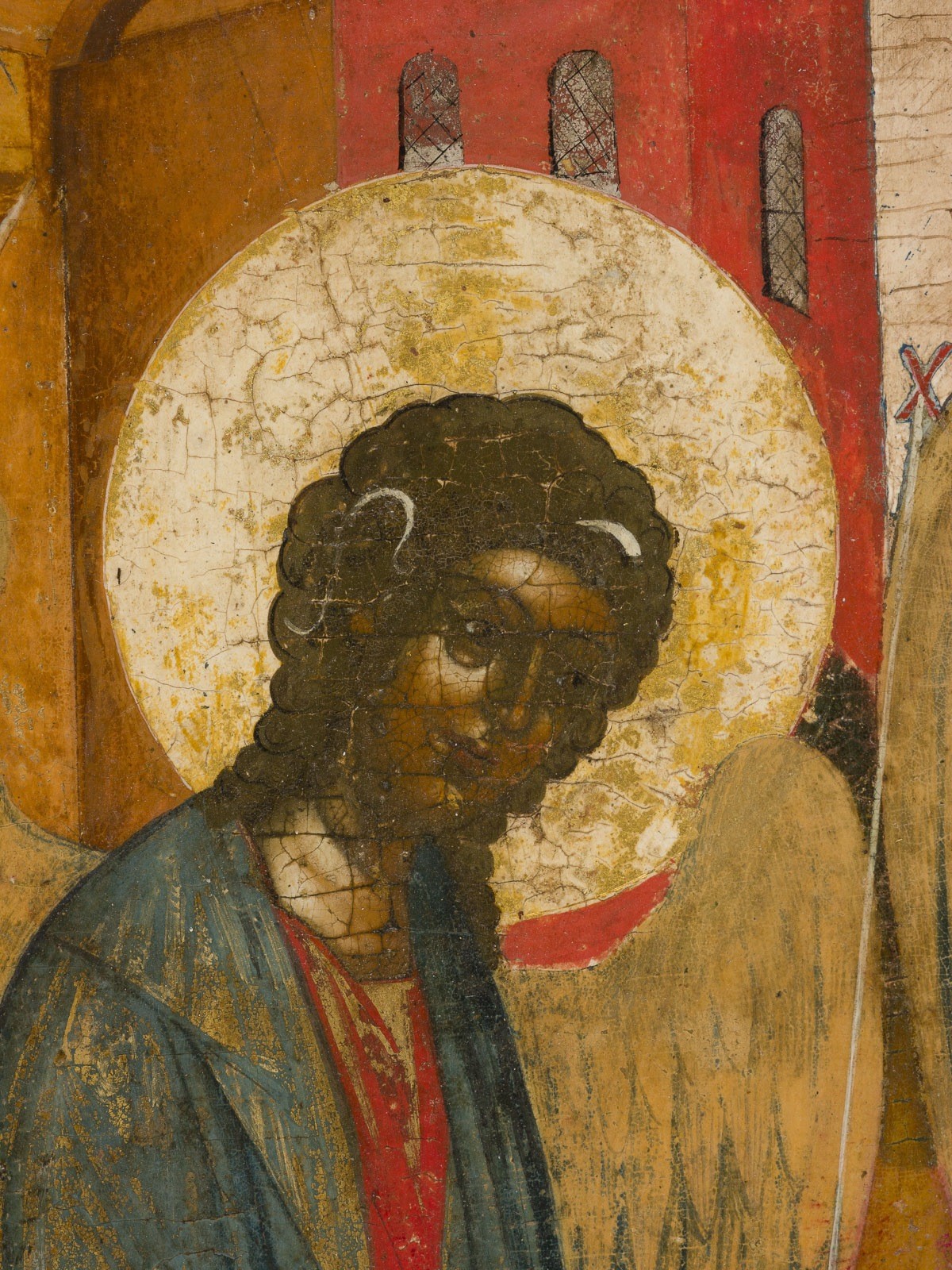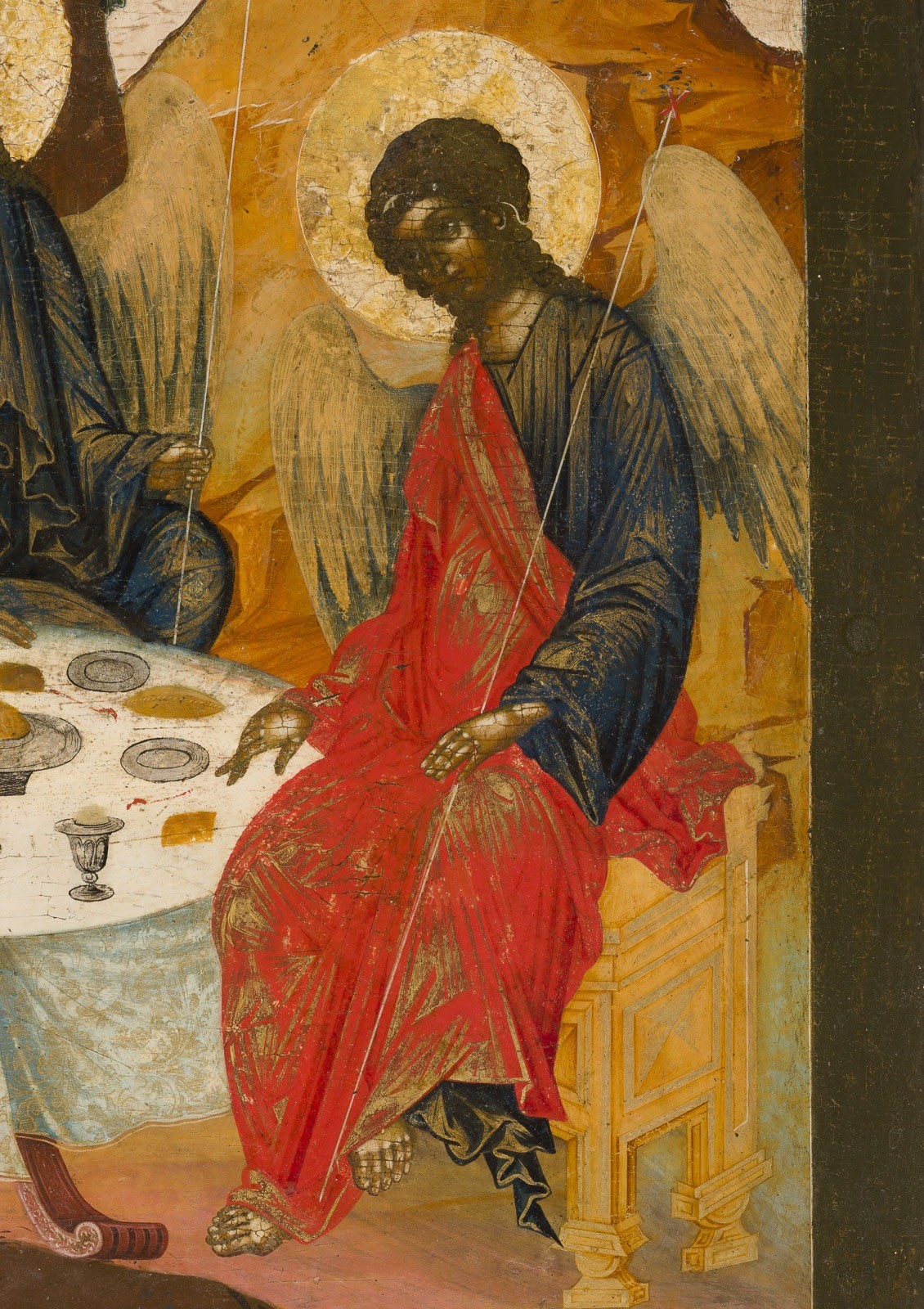 A VERY FINE AND LARGE ICON SHOWING THE OLD TESTAMENT TRINITY Russian, Moscow, circle of the Armoury Chamber, circa 1700 Tempera on wood panel. The haloes made of gold. The figures of the angel bending slightly forward with a diadem on the curly hair. Refined face executed in brown and modelled with the use of red and green shades. The background stripped to the levkas. 54.2 x 42.4 cm.