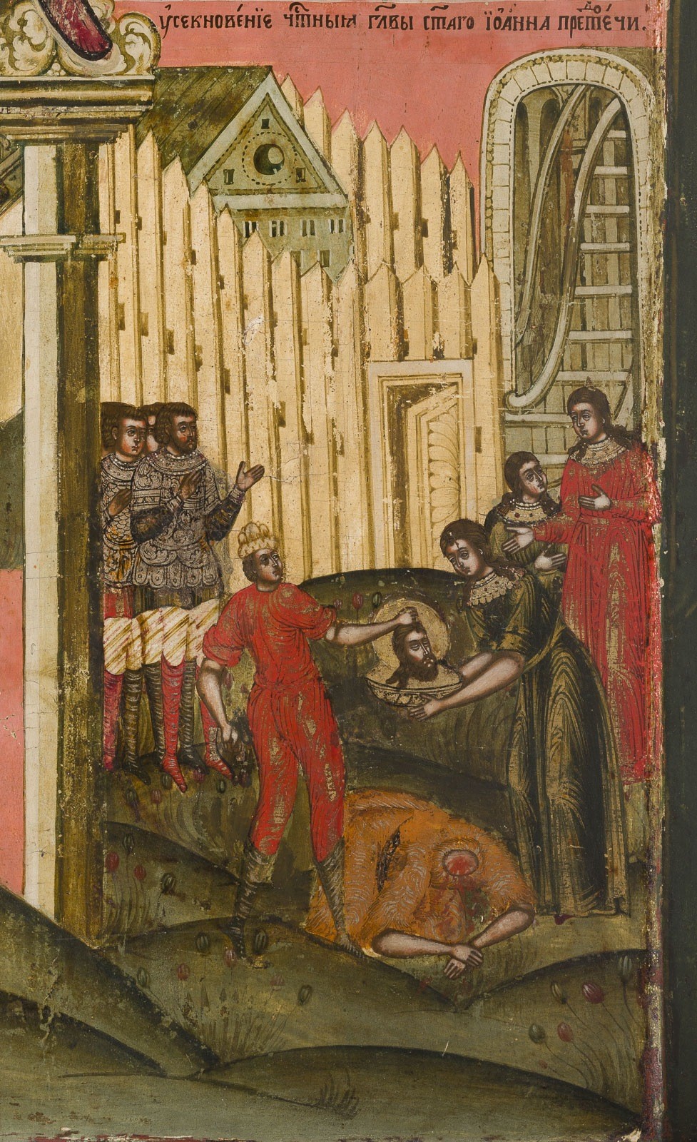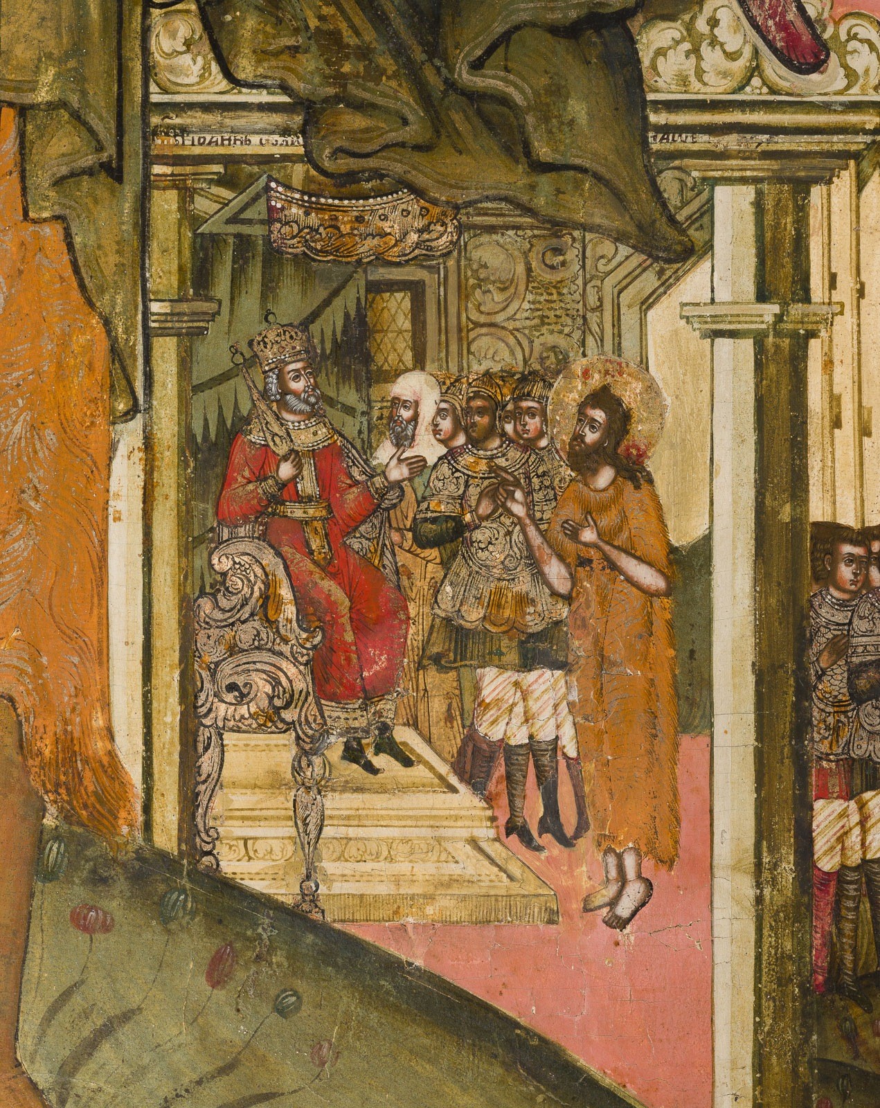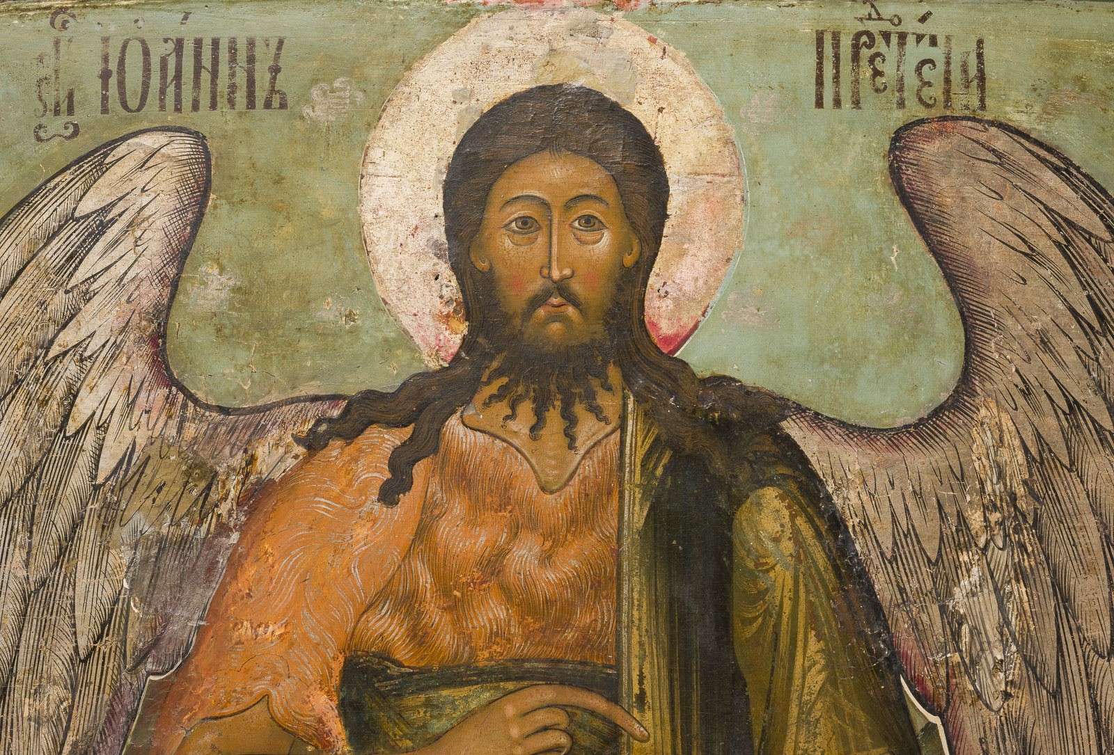 A MONUMENTAL AND VERY FINE ICON OF SAINT JOHN THE FORERUNNER WITH SCENES FROM HIS LIFE, FROM A CHURCH ICONOSTASIS Russian, Yaroslavl, late 17th century Tempera on wood panel with kovcheg. The haloes, wings and details made of gold and silver, covered by a golden lacquer. Very fine modelling of the flesh tones in shades of red and beige. Richly detailed execution of the individual scenes within elaborate architectural settings and tree-filled landscapes. Borders trimmed, minor losses, minimal restoration. 120.3 x 100.5 cm.
