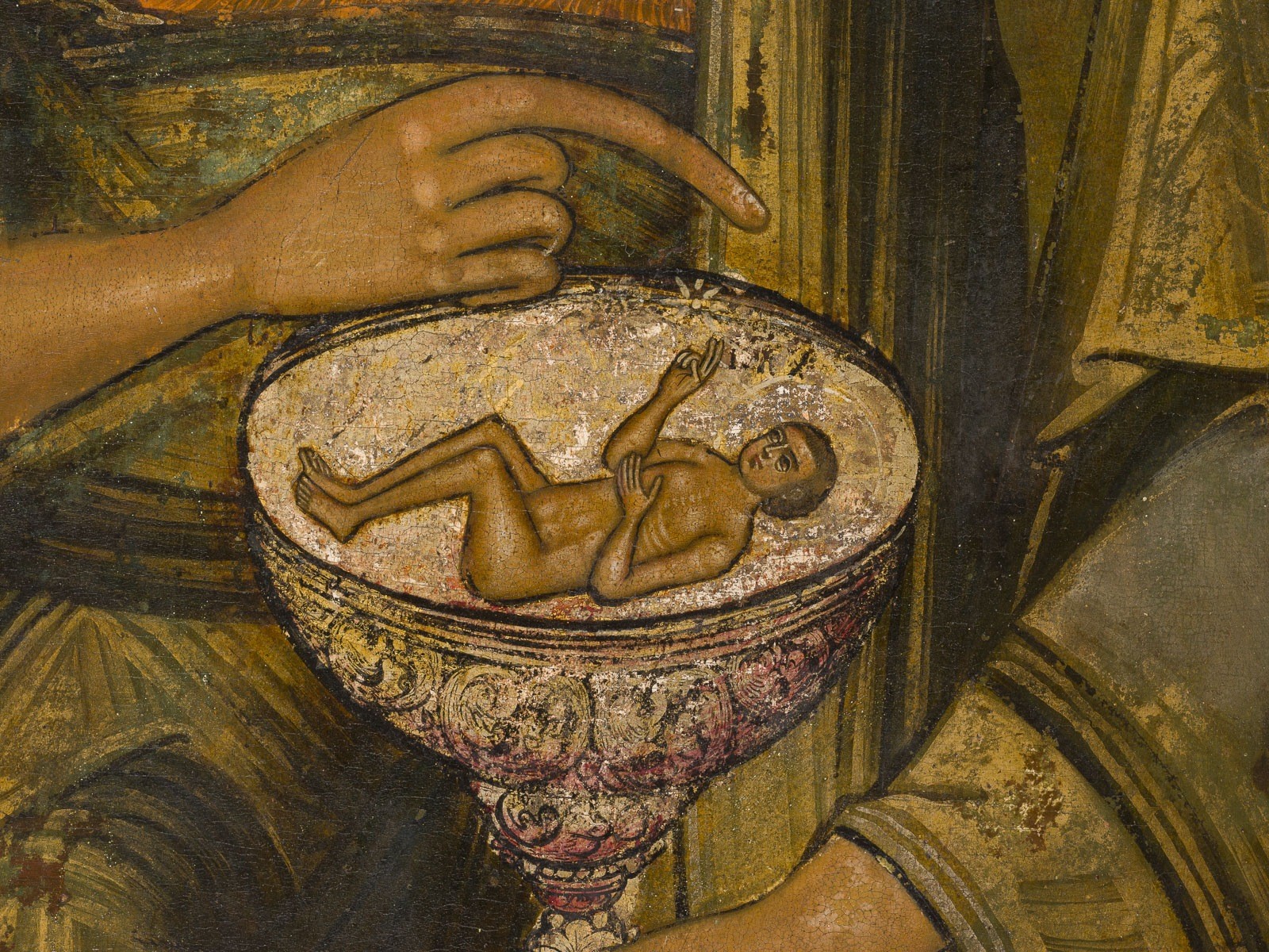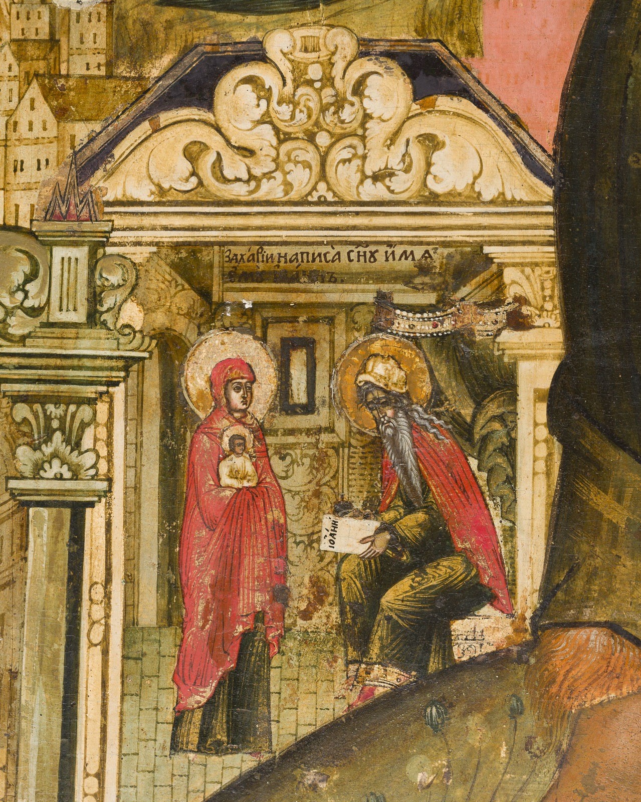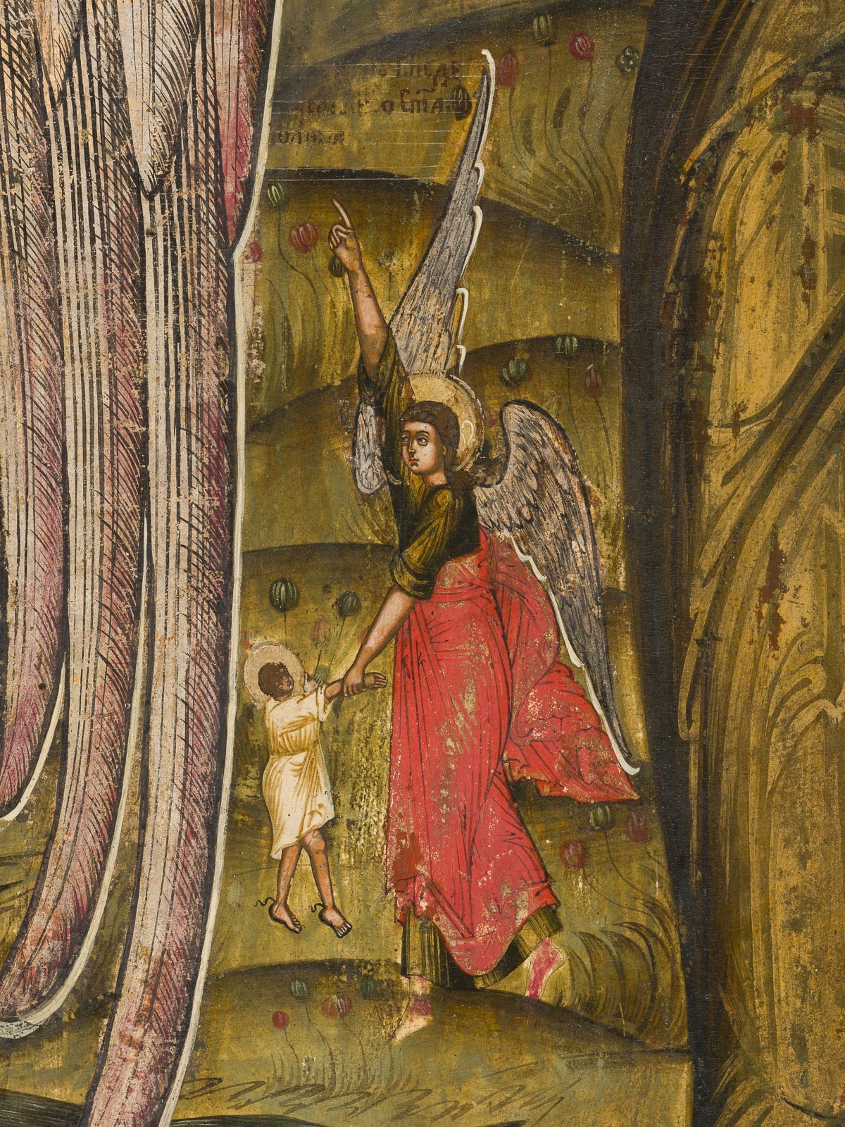 A MONUMENTAL AND VERY FINE ICON OF SAINT JOHN THE FORERUNNER WITH SCENES FROM HIS LIFE, FROM A CHURCH ICONOSTASIS Russian, Yaroslavl, late 17th century Tempera on wood panel with kovcheg. The haloes, wings and details made of gold and silver, covered by a golden lacquer. Very fine modelling of the flesh tones in shades of red and beige. Richly detailed execution of the individual scenes within elaborate architectural settings and tree-filled landscapes. Borders trimmed, minor losses, minimal restoration. 120.3 x 100.5 cm.