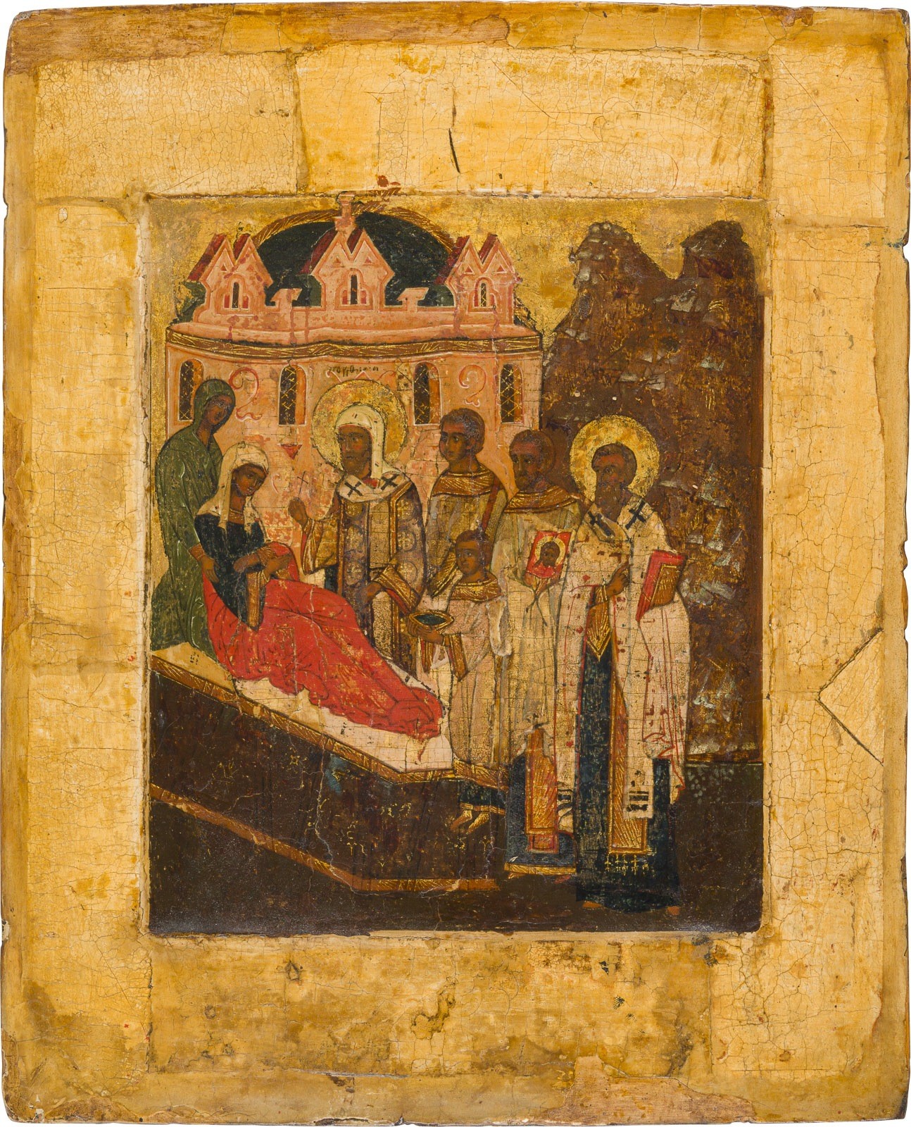 A VERY FINE AND VERY RARE ICON DEPICTING METROPOLITAN ALEXIS HEALING THE TATAR QUEEN TAIDULLa Russian, mid-16th century Tempera on wood panel with double kovcheg, haloes and background gilded. Set into a later panel (vrezka), partially restored. 29.6 × 24.5 cm. Exhibited: Art of the Christian East: Icons and Applied Arts, Jahrhunderthalle Hoechst, 2-31 March 1986, cat. no. 88.