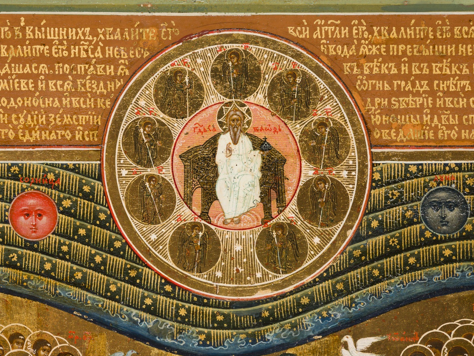 A VERY FINE AND RARE ICON 'LET ALL THAT HAS BREATH PRAISE THE LORD' Russia, Mstera, 19th century Tempera on wood panel with kovcheg. The haloes and background made of gold. A finely executed composition based on Psalm 150:6 ("Let everything that has breath praise the Lord"). In the upper part, God the Father is enthroned in the heavens, surrounded by angels. Below, rows of saints appear, while additional figures - ordinary believers without halos - fill the scene, symbolizing the entire community praising Christ. At the center rises a stylized hill, partly covered with trees; around it birds and animals move, and at its base geese swim in the water. These creatures embody the message that not only humankind, but all living beings give praise to the Lord. The icon unites heaven and earth, the sacred and the everyday, expressing the universality of divine praise - from the highest angels to the smallest creatures. Minor retouching. 30.8 x 26.2 cm.