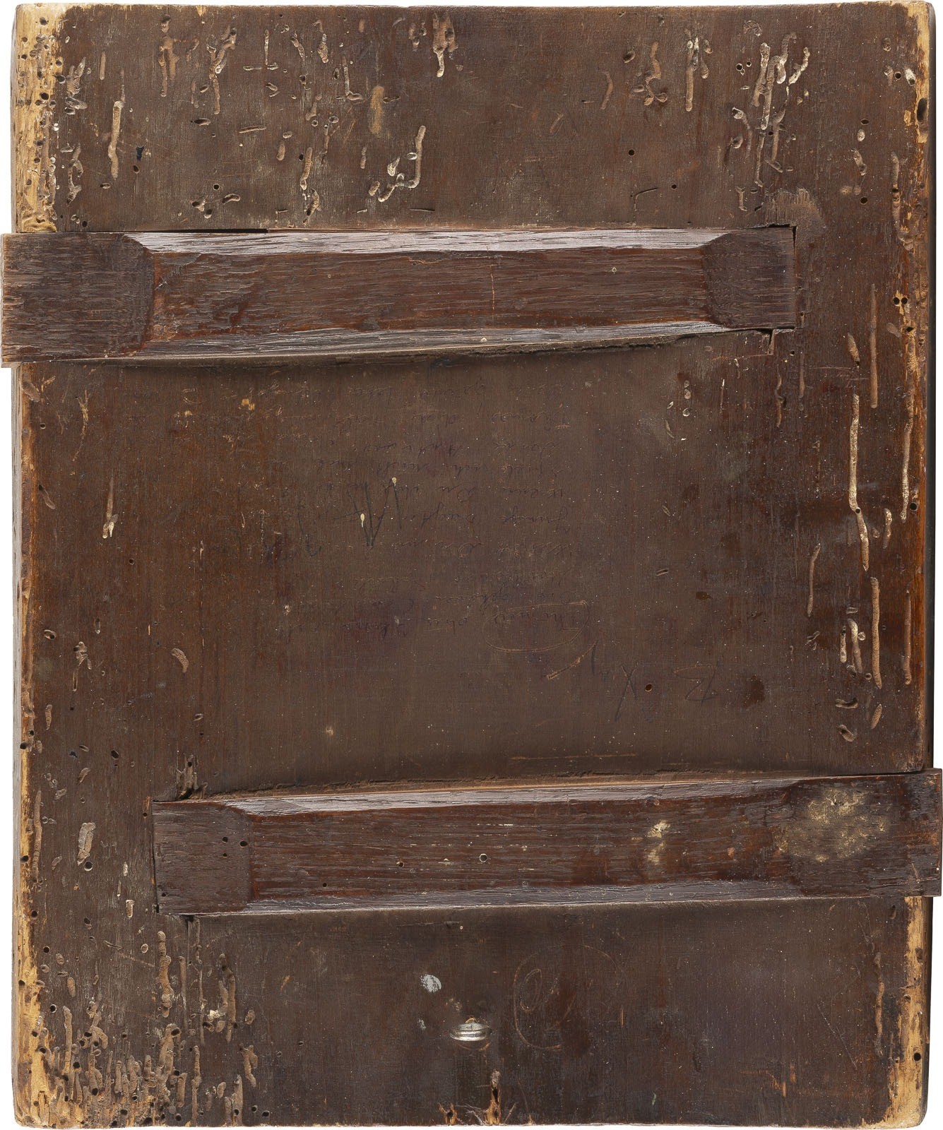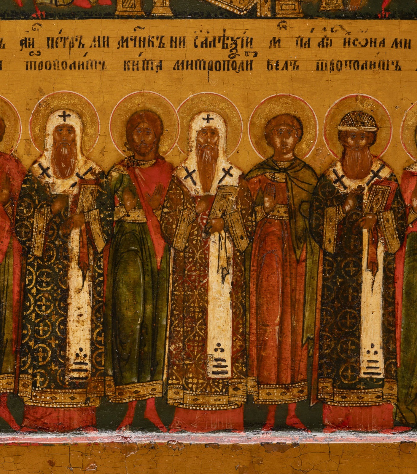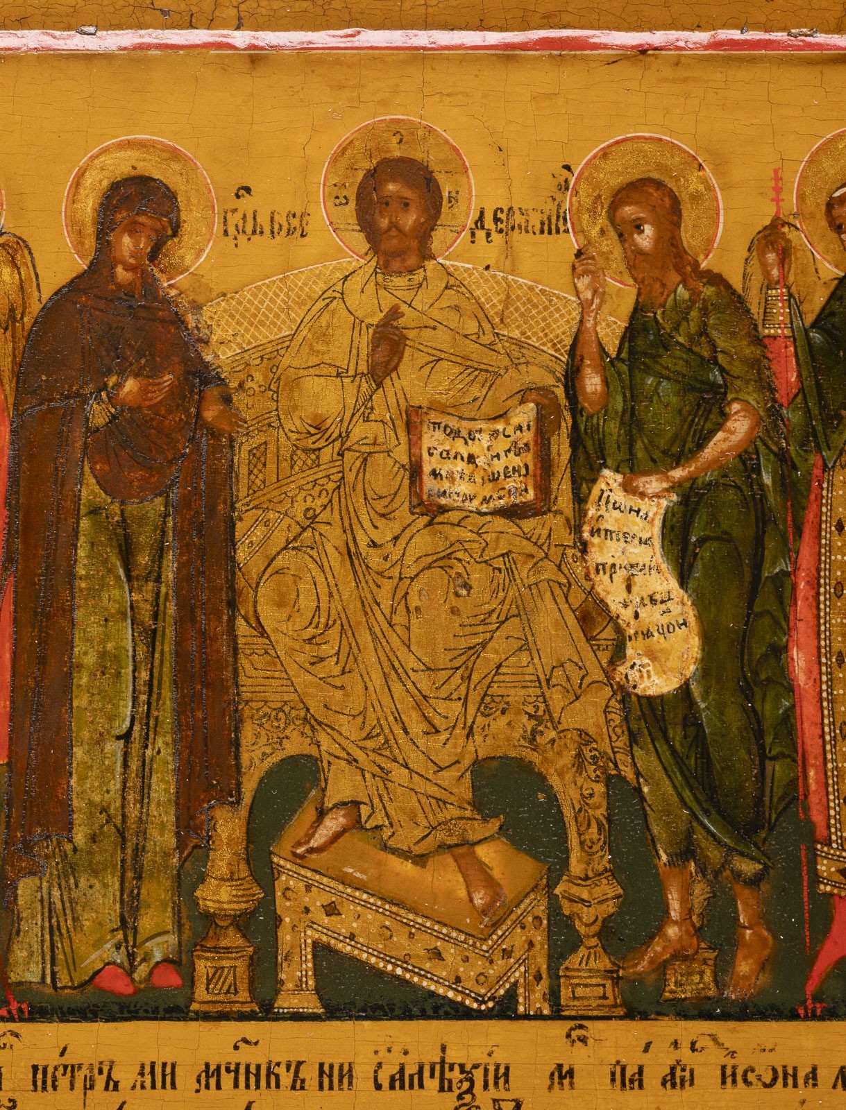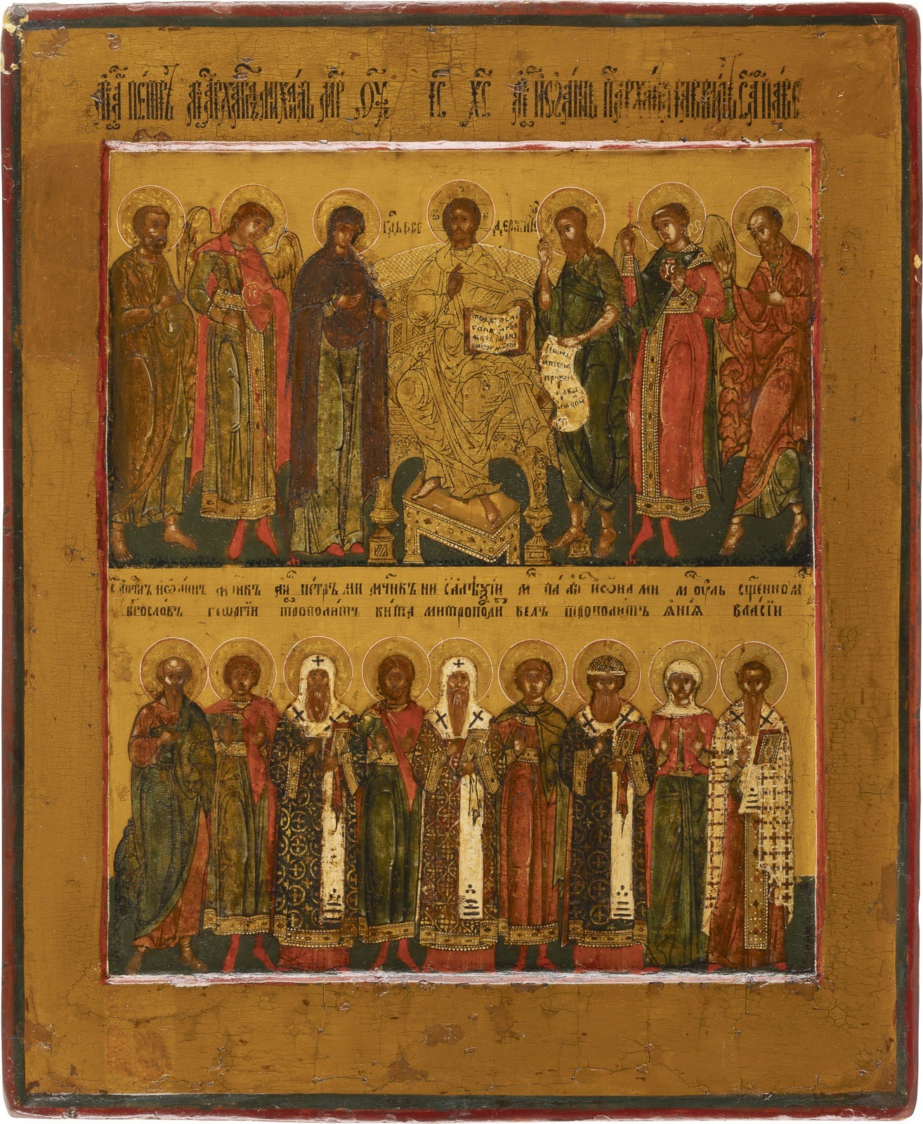 A VERY FINE TWO-PARTITE ICON SHOWING THE EXTENDED DEISIS AND SELECTED SAINTS Russian, early 17th century Tempera on wood panel with double kovcheg. The haloes made of gold. The icon finely painted with extensive ornamental detail. Minor areas of retouching. 31.3 x 26.2 cm.