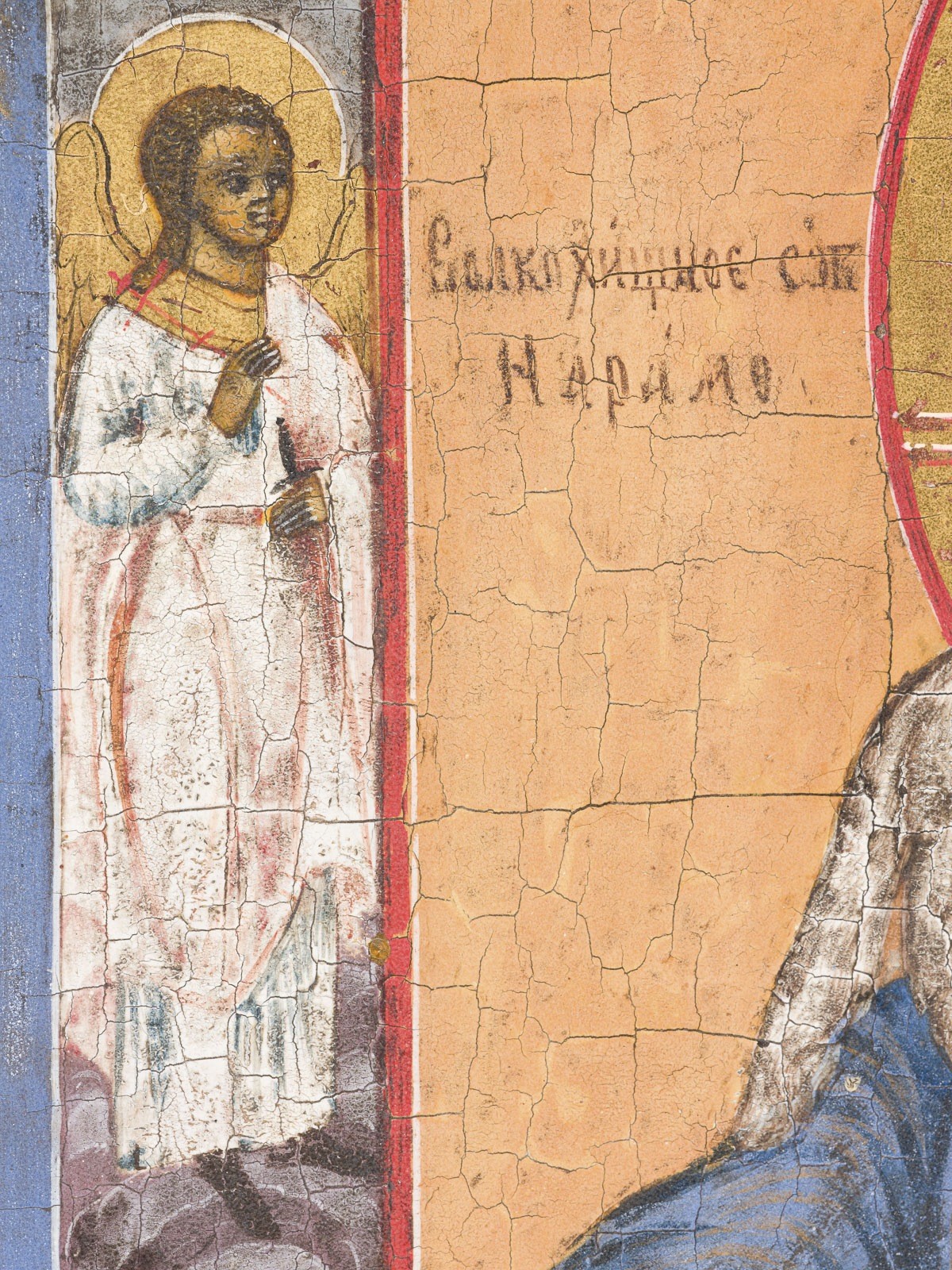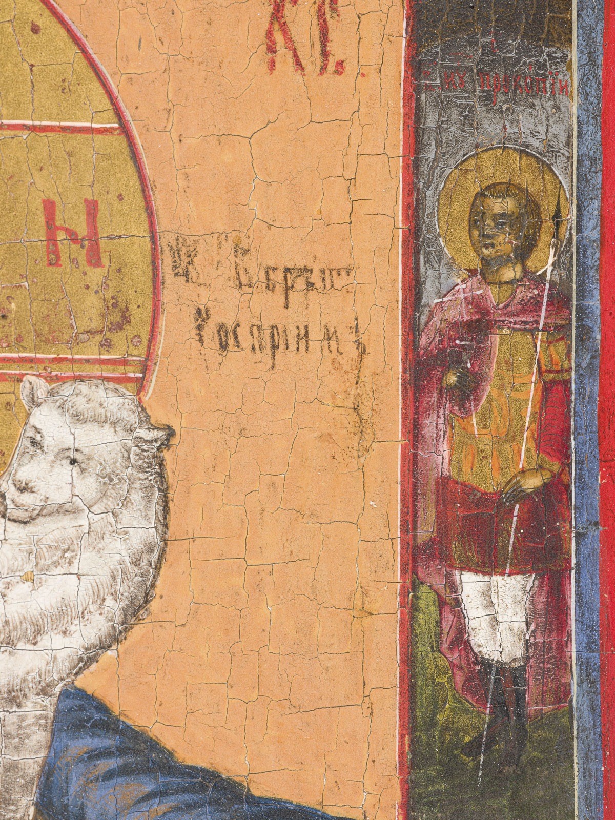 A VERY RARE ICON SHOWING CHRIST THE GOOD SHEPHERD Russian, mid 19th century Tempera on wood panel. The haloes made of gold. Two selected saints on the borders: Guardian Angel and St. Prokopiy. Minor areas of retouching. 31.1 x 24.6 cm.