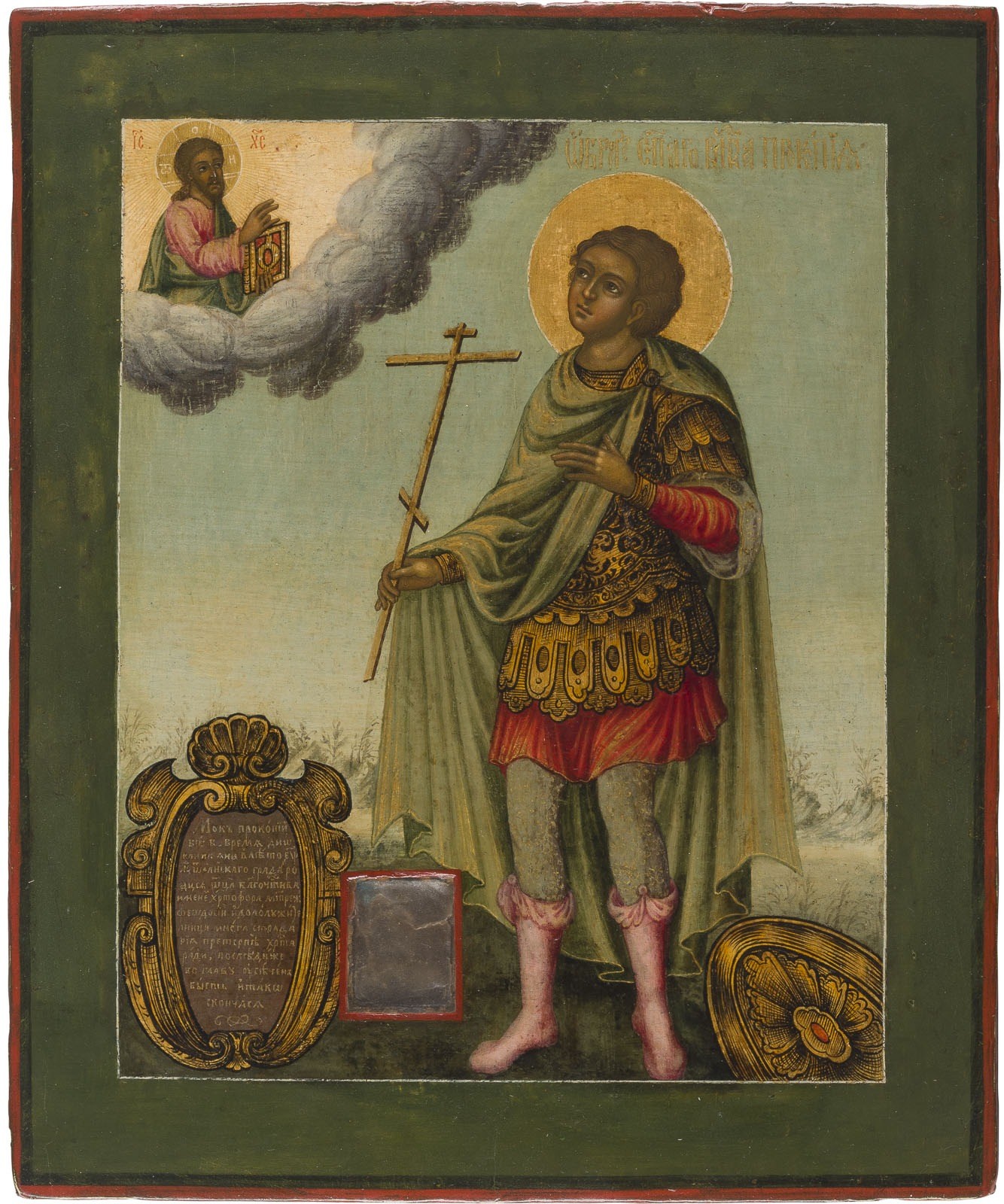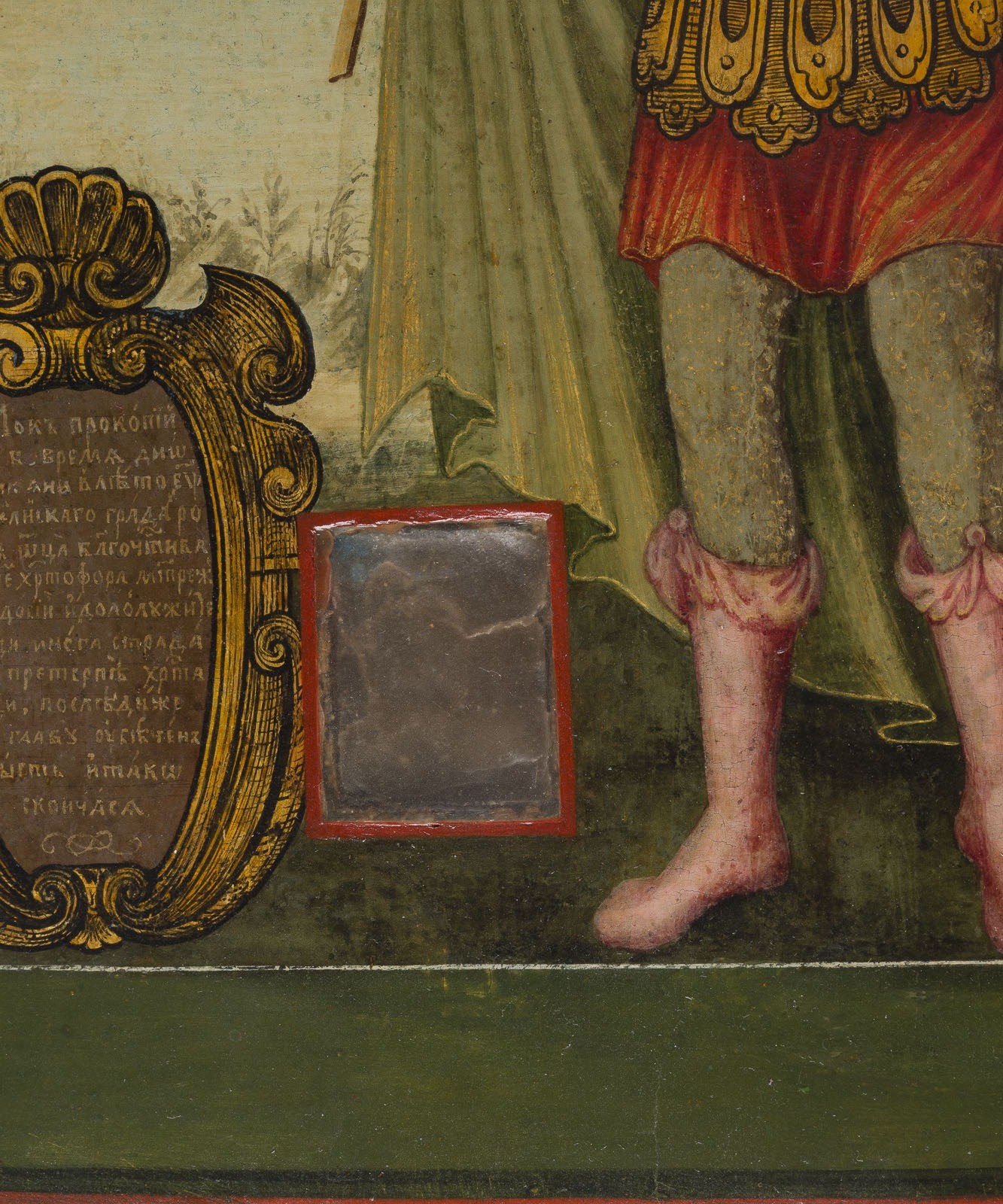 A VERY RARE ICON OF THE GREAT MARTYR PROCOPIUS WITH RELICS Russian, Moscow, Armory Chamber Workshop, circa 1700 Tempera on wood panel, halo and armor of the saint gilded. This icon of the Great Martyr Procopius has a distinctive feature: in the lower part there is a rectangular recess that originally contained relics of the saint. Such reliquary icons not only served for the veneration of the depicted martyr but also functioned as personal "house shrines." They were often brought to Moscow from the Orthodox eastern regions, where they were highly esteemed as miracle-working images. The relics transformed the icon into a sacred object of immediate holy presence, making it a central focus of both private devotion and liturgical practice. Minor restoration. 31.1 x 25.7 cm.