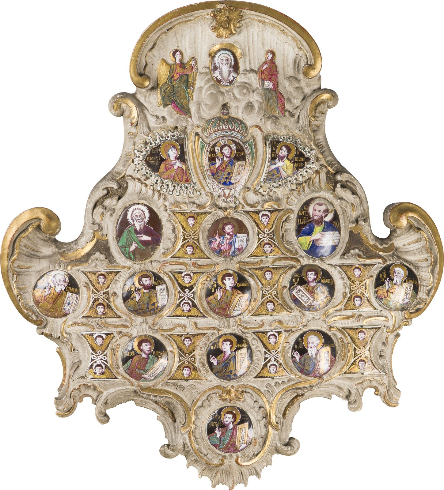 A VERY RARE, LARGE AND VERY FINE WOODEN CARVED RELIEF SHOWING THE DEISIS AND THE TWELVE APOSTLES Balkans, mid-18th century Carved and gilded, inserted finely painted enamel plaques. Enamel minimally chipped, minor losses. 59 x 55 cm.