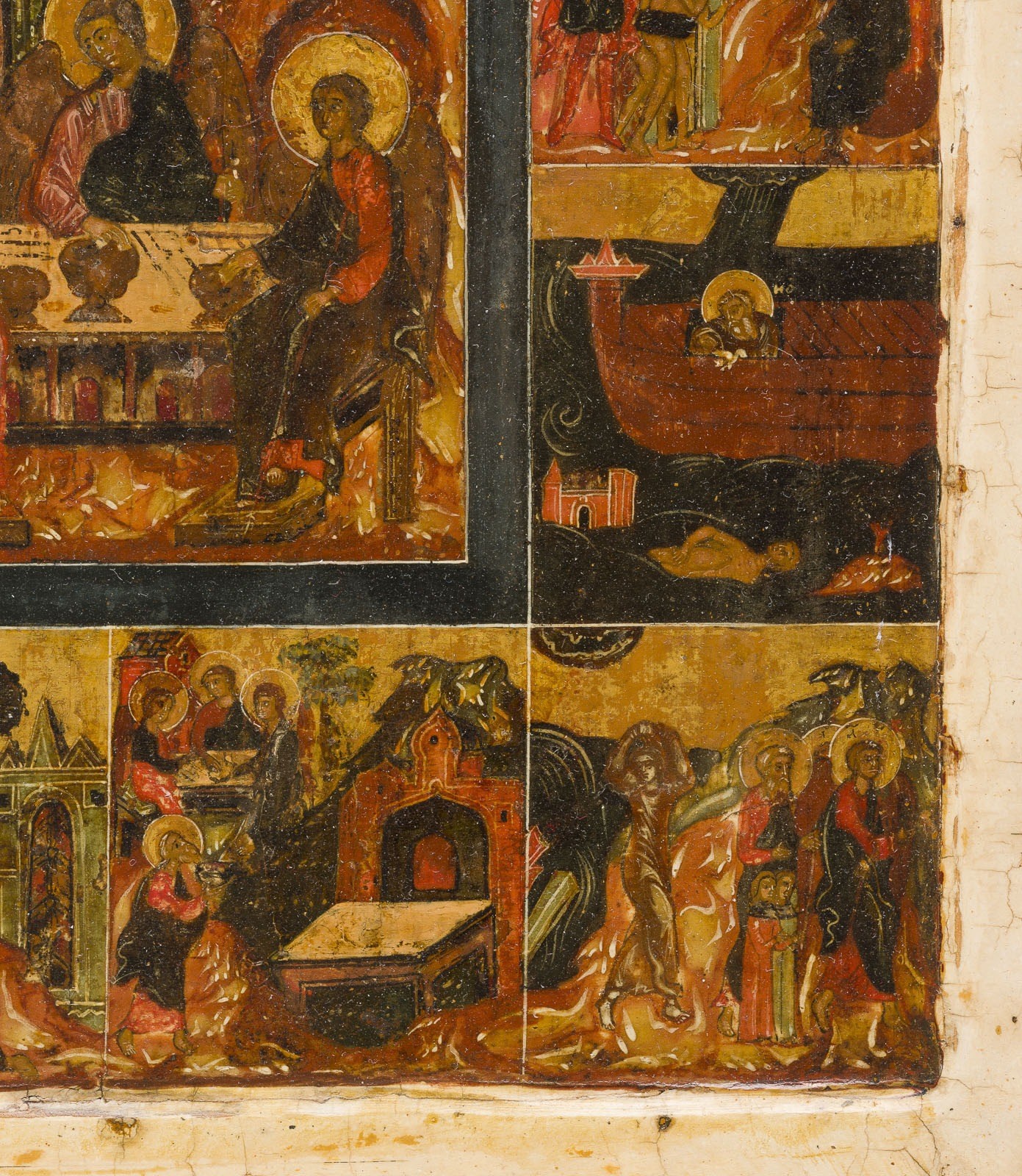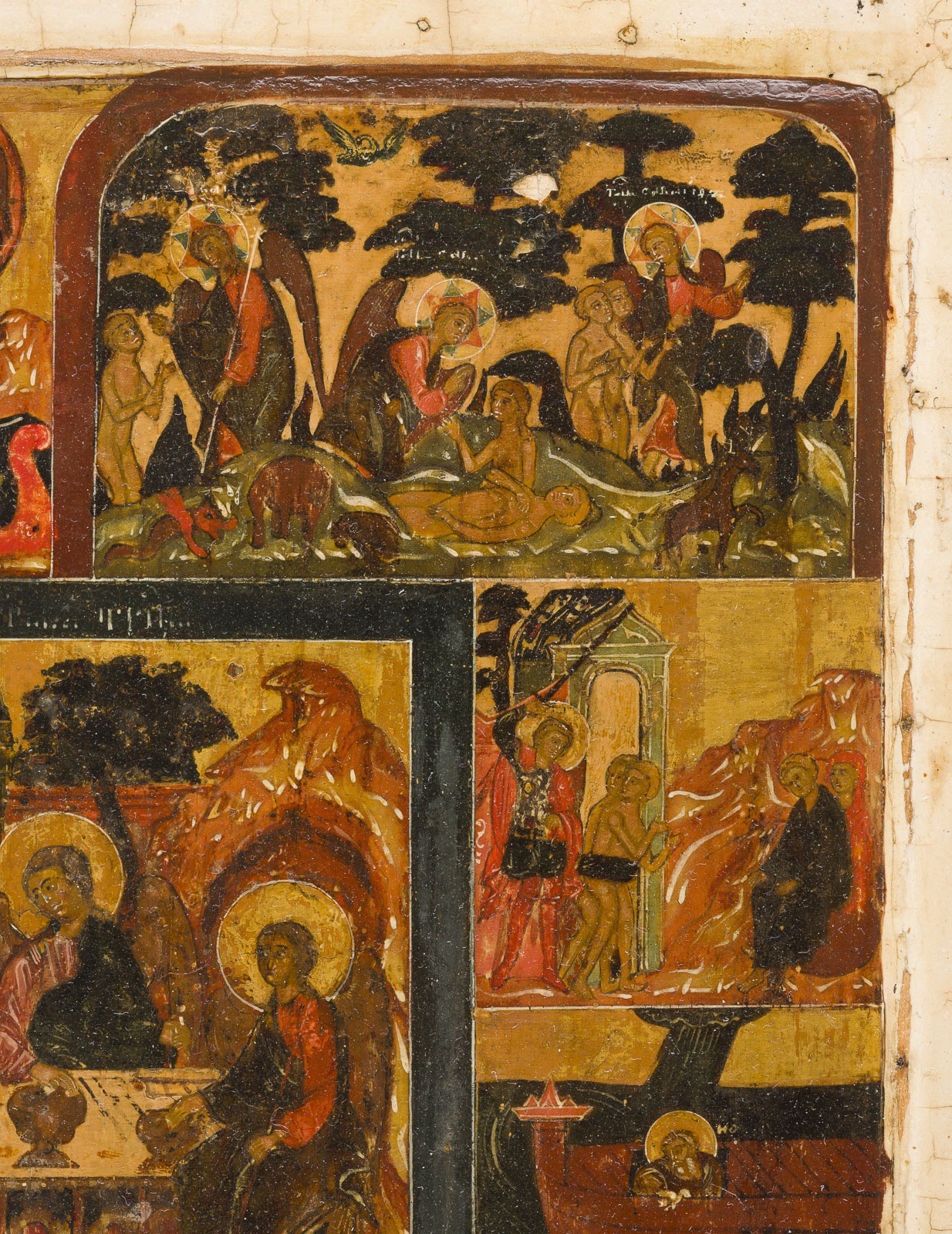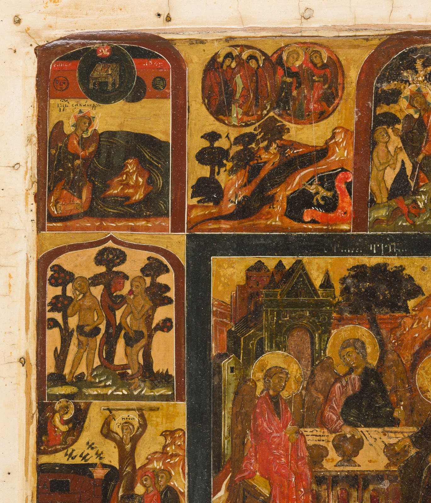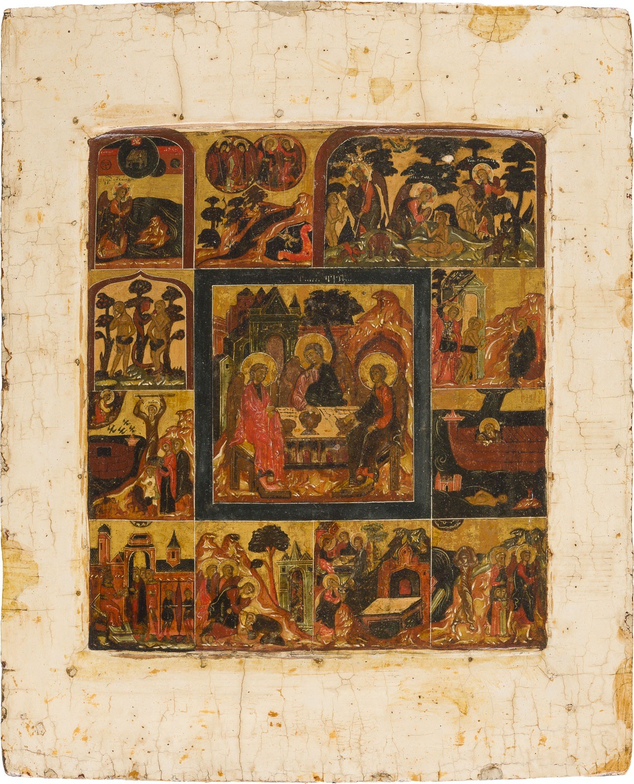 A VERY RARE AND FINE ICON SHOWING THE OLD TESTAMENT TRINITY AND THE CREATION OF THE WORLD Russian, 17th century Tempera on wood panel with kovcheg. The haloes and background made of gold. The center is surrounded by eleven scenes depicting the Creation of the world as well as the creation of Adam and Eve, the Expulsion from Paradise, Noah's Ark, and the Hospitality of Abraham. The border of the icon stripped to the levkas, minimally restored. On the reverse Cyrillic restoration inscription, dated '1825'. 32.4 x 26.7 cm.