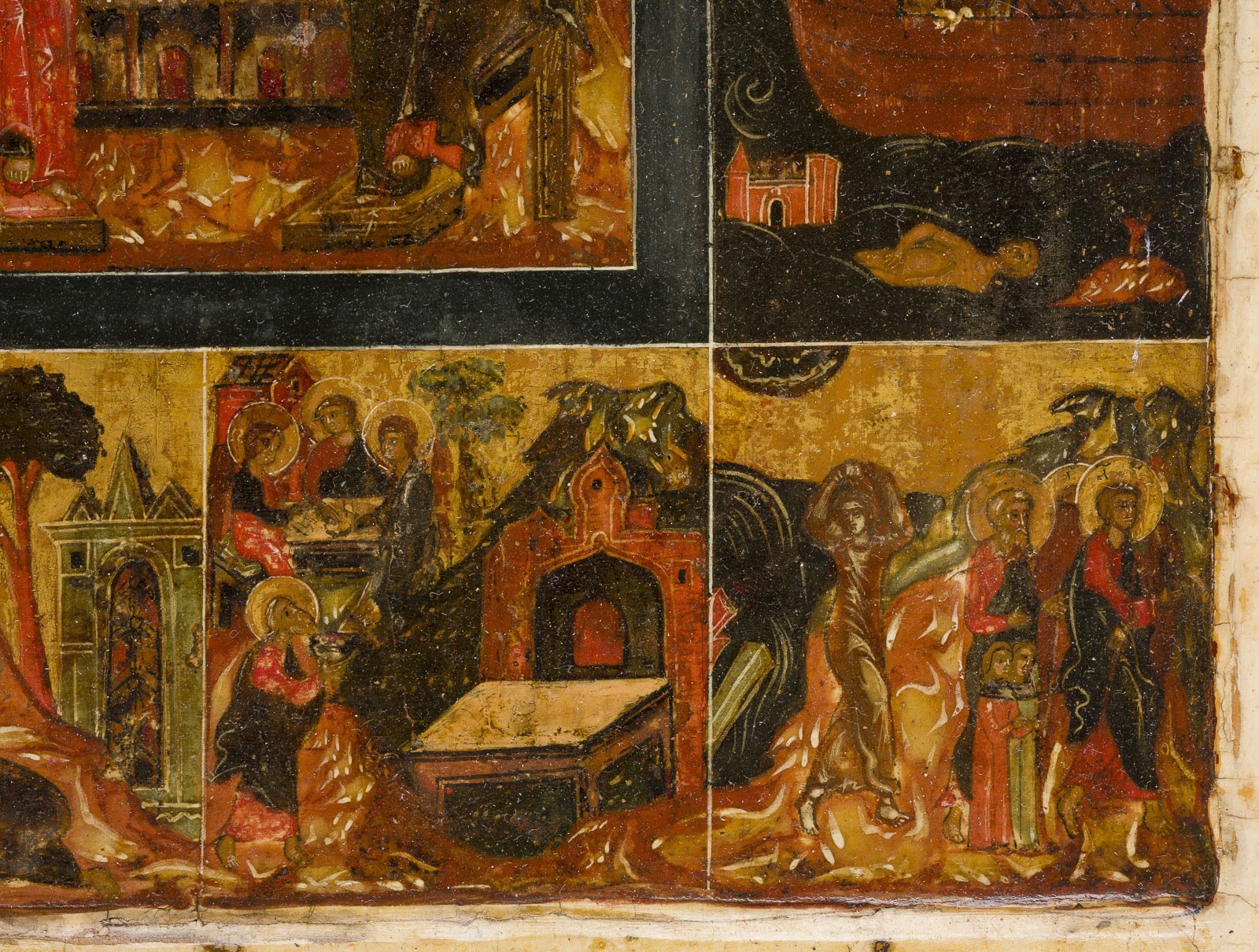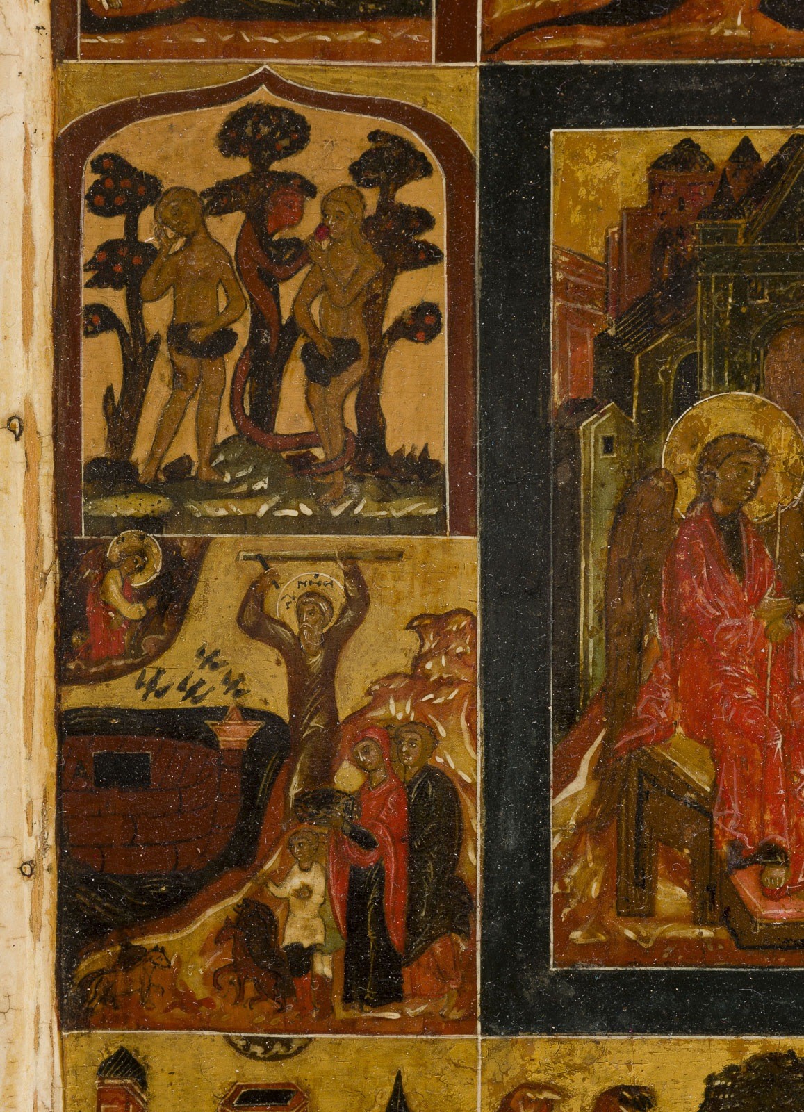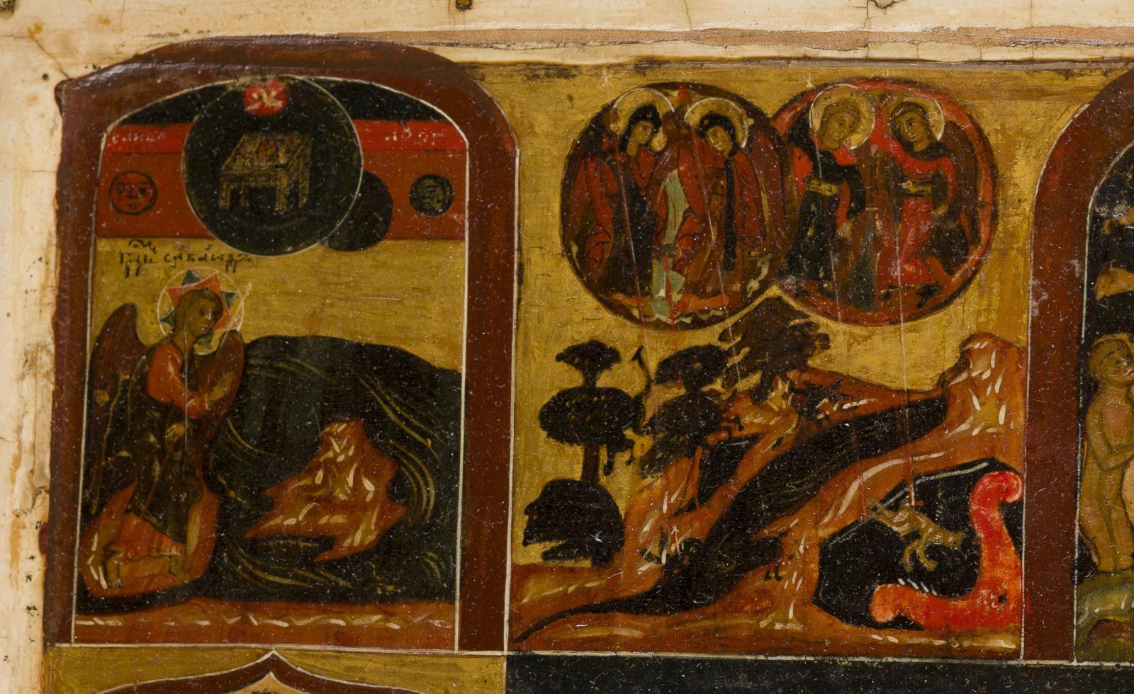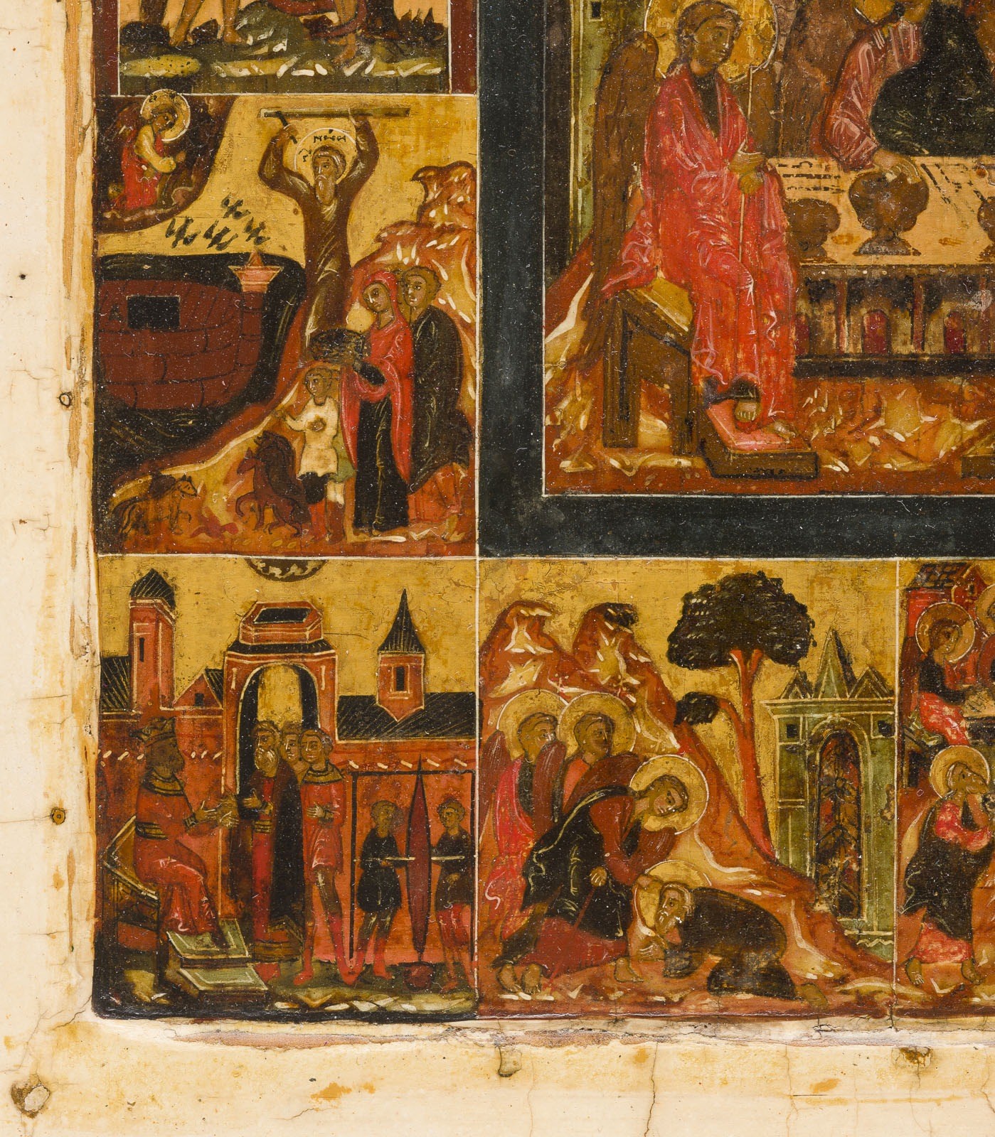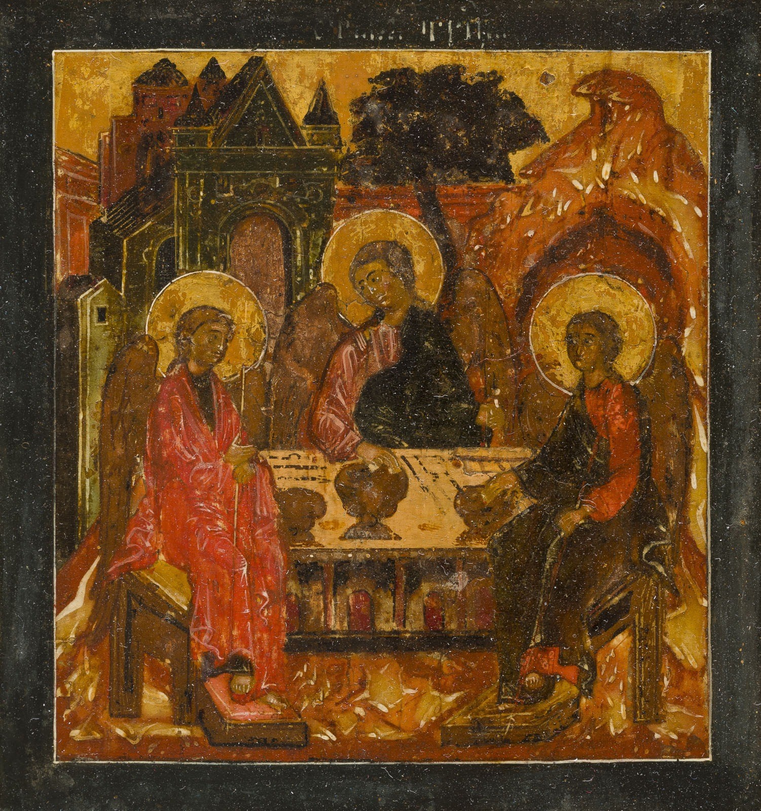 A VERY RARE AND FINE ICON SHOWING THE OLD TESTAMENT TRINITY AND THE CREATION OF THE WORLD Russian, 17th century Tempera on wood panel with kovcheg. The haloes and background made of gold. The center is surrounded by eleven scenes depicting the Creation of the world as well as the creation of Adam and Eve, the Expulsion from Paradise, Noah's Ark, and the Hospitality of Abraham. The border of the icon stripped to the levkas, minimally restored. On the reverse Cyrillic restoration inscription, dated '1825'. 32.4 x 26.7 cm.