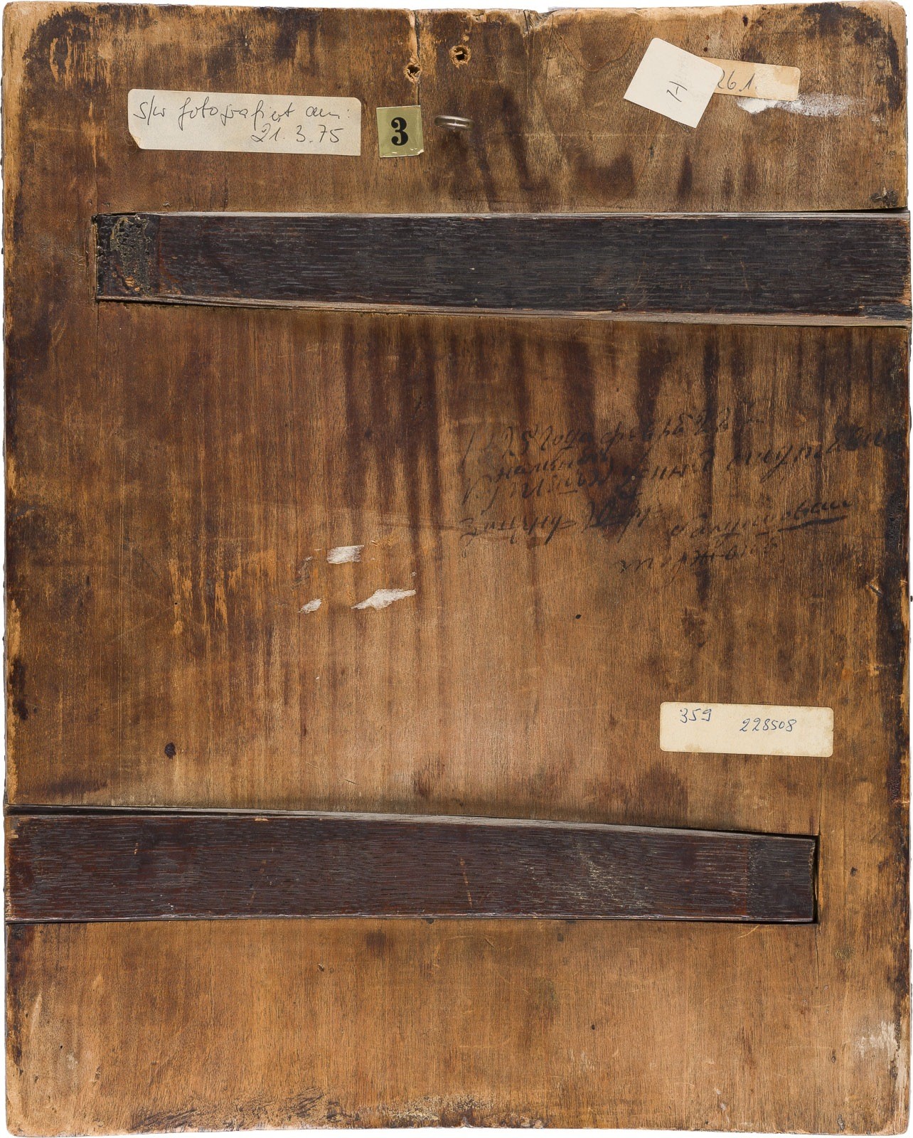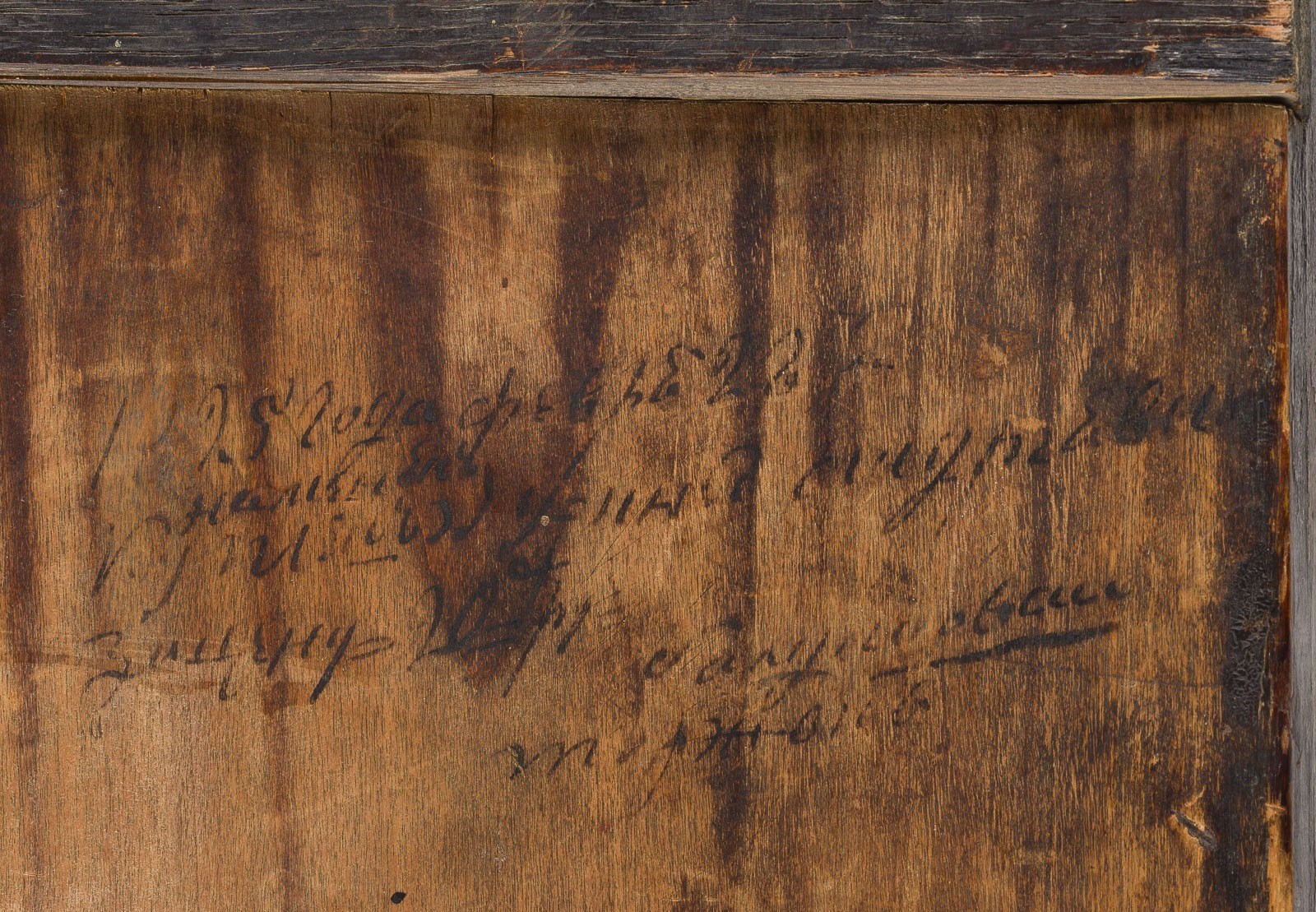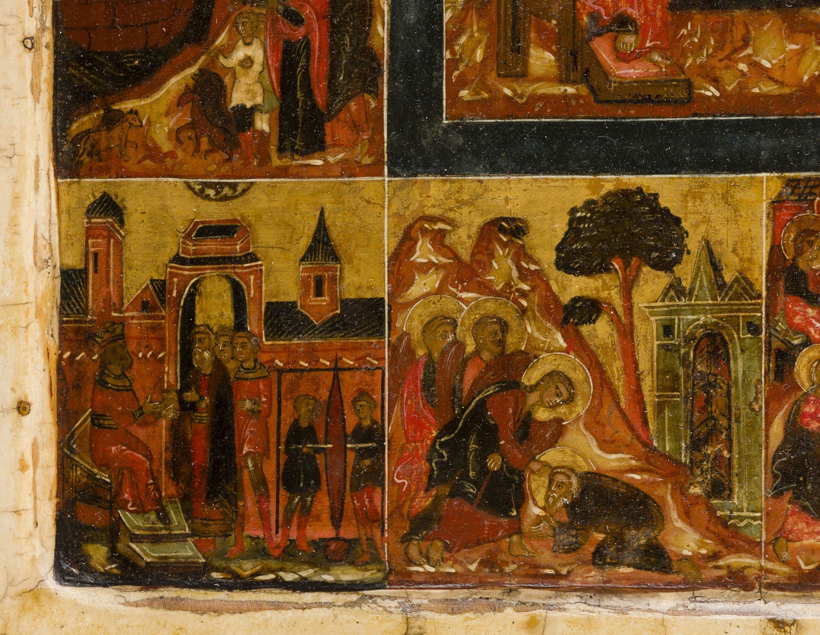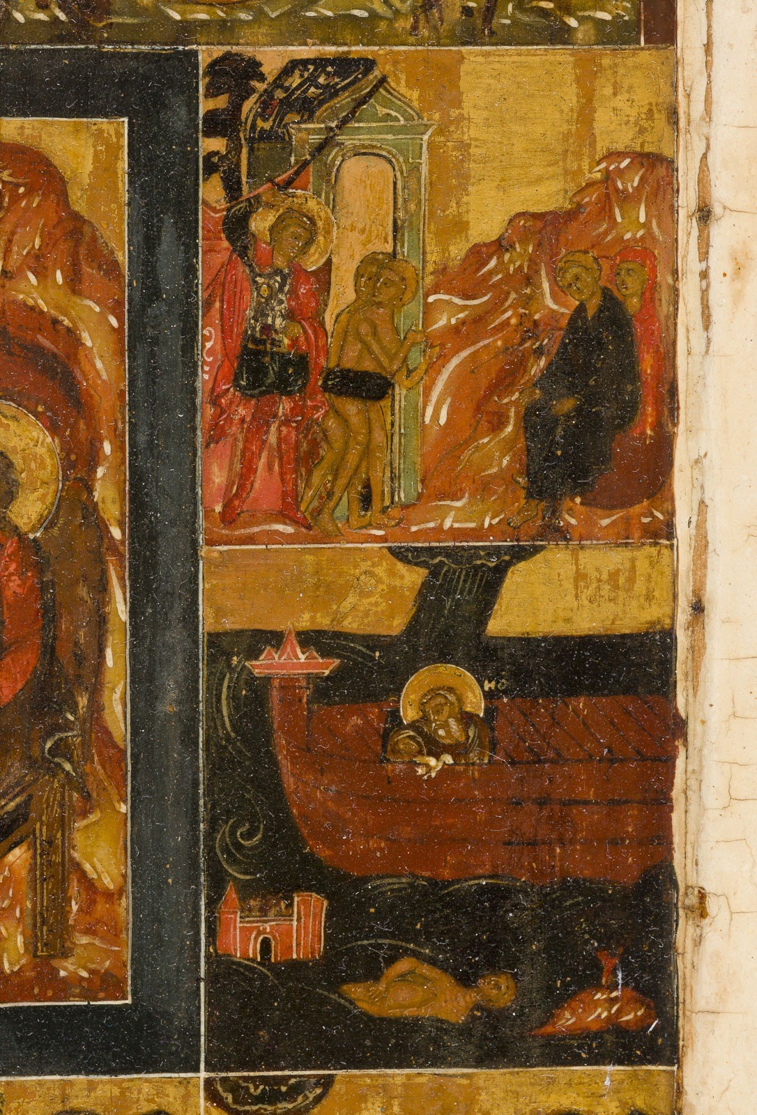 A VERY RARE AND FINE ICON SHOWING THE OLD TESTAMENT TRINITY AND THE CREATION OF THE WORLD Russian, 17th century Tempera on wood panel with kovcheg. The haloes and background made of gold. The center is surrounded by eleven scenes depicting the Creation of the world as well as the creation of Adam and Eve, the Expulsion from Paradise, Noah's Ark, and the Hospitality of Abraham. The border of the icon stripped to the levkas, minimally restored. On the reverse Cyrillic restoration inscription, dated '1825'. 32.4 x 26.7 cm.