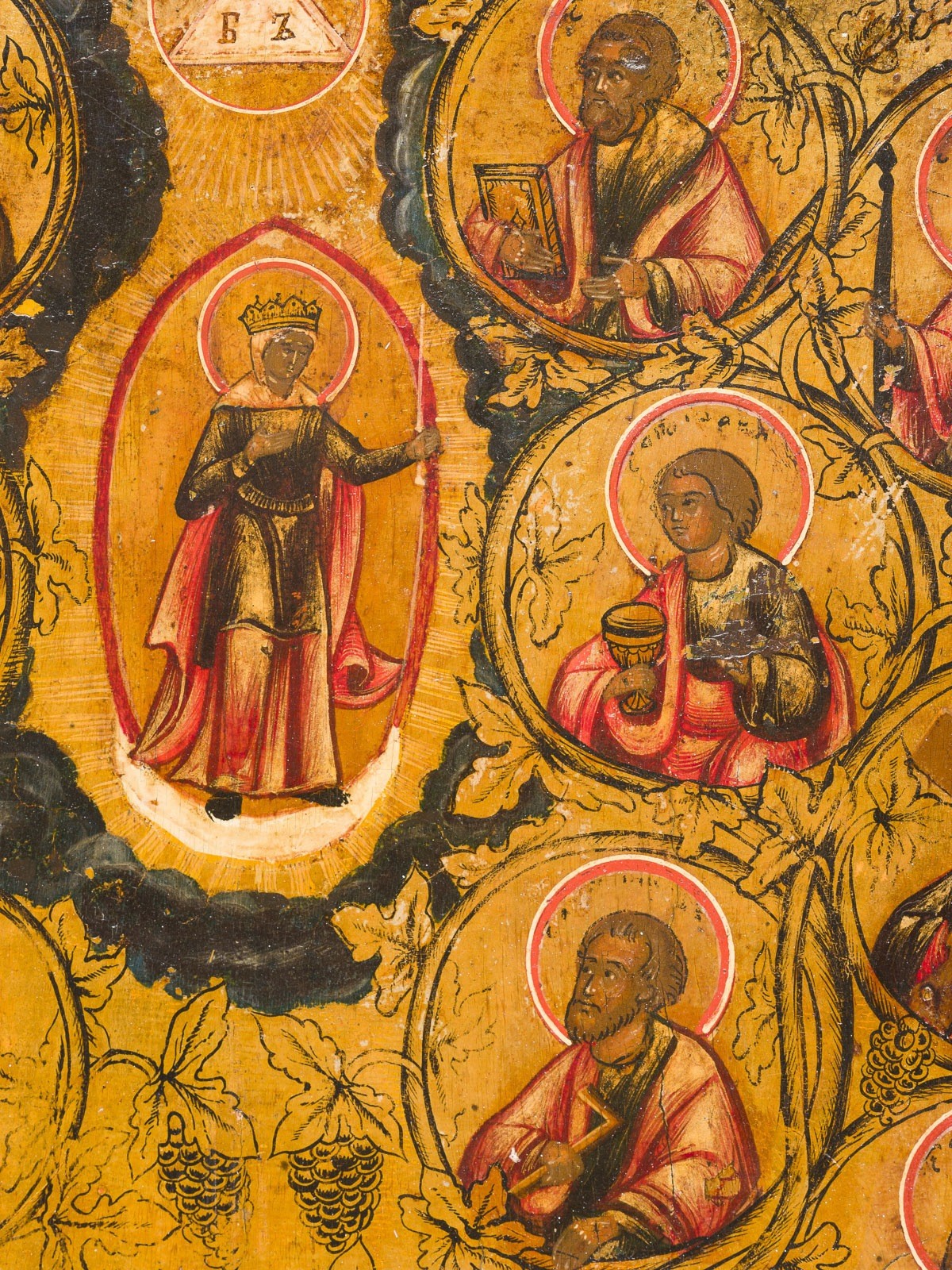 A VERY RARE AND LARGE ICON OF CHRIST WITH THE APOSTLES 'THE VINE AND THE BRANCHES' Russian, 19th century Tempera on wood panel. The background silvered and glazed in gold. The Apostles are shown presenting the instruments of their martyrdom, while in the centre the Mother of God appears above a crescent moon. Minor retouching. 42.6 x 35.3 cm.