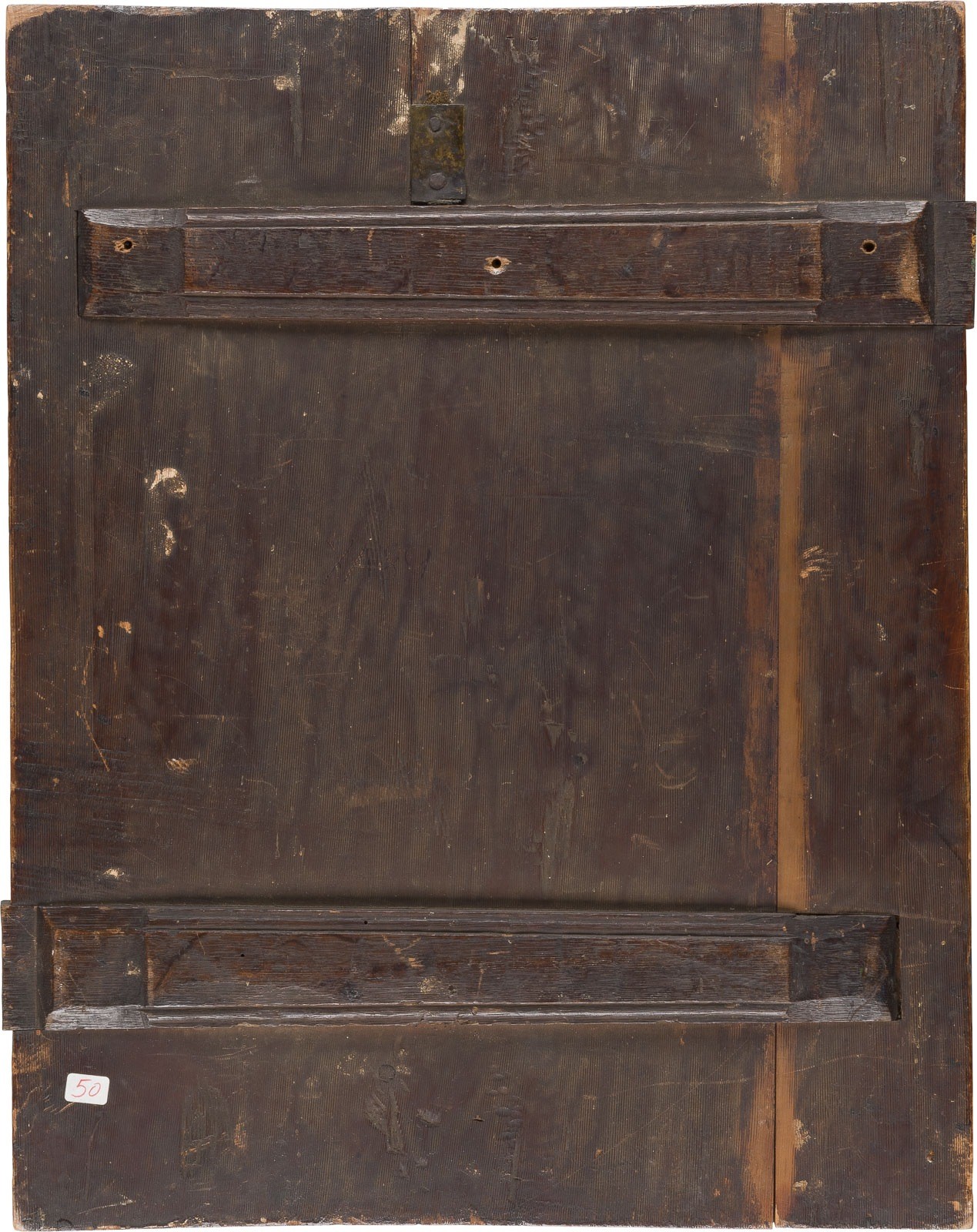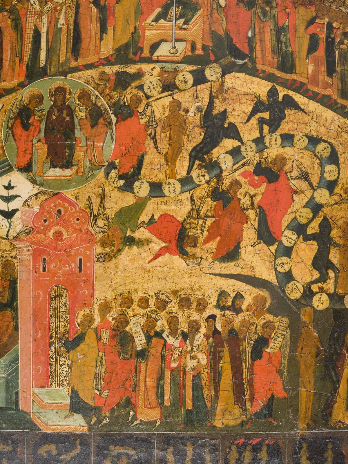 A VERY RARE AND LARGE ICON SHOWING THE LAST JUDGMENT Russian, Palekh, Old Believers' workshop, 18th century Tempera on wood panel. Finely executed on a gold ground. At the center of this complex and richly symbolic composition is the Throne of Preparation (Hetimasia) - an empty altar symbolizing divine justice, flanked by angels, saints, and the righteous. Above it, Christ as the Judge of the World is enthroned within a round aureole, flanked by the Mother of God and John the Baptist in intercessory poses (Deesis). To the left and right, the Twelve Apostles are depicted in seated positions. Above this heavenly tribunal, Christ appears in a mandorla, ascending toward God the Father, who symbolically offers Him the seat at His right hand. Above them hovers the Holy Spirit in the form of a dove. The Holy Trinity, depicted in a Western typology, appears again at the far right within a circular aureole. Angels spread a starry firmament across the uppermost section of the image. At the top left, the Heavenly Jerusalem is shown, filled with the righteous of the Old Testament and Christian saints. At the entrance to paradise, monks assist ascending souls in entering the celestial realm. Beneath this scene, Abraham, Isaac, and Jacob are enthroned in the Garden of Paradise, surrounded by the redeemed; to the far left appears the Good Thief. Next to this, Apostle Peter leads a procession of saints toward the Gate of Heaven, above which the Mother of God in Paradise, flanked by two angels, is portrayed. In striking contrast, the region of Hell unfolds on the right side. The so-called Hellmouth, surrounded by angels and demons, reveals devils dragging the condemned into the abyss. At its center, Satan is enthroned upon a monstrous beast of hell, holding the soul of Judas Iscariot, surrounded by subordinate demons. To the left, devils are shown casting monks and a bishop into damnation. At the right edge, flames of hell rise, where devils are hurled up and down; nearby appear apocalyptic beasts, enclosed in round aureoles. A wide band at the bottom of the composition vividly illustrates the punishments of hell for various sinners, including thieves, the greedy, the avaricious, the lustful, and murderers. This theologically rich icon presents a comprehensive visual rendering of Eastern Orthodox eschatology, serving as an outstanding example of the symbolic visual language and spiritual worldview of the Eastern Church. Vertical crack restored, minor losses. 53.2 x 42 cm.
