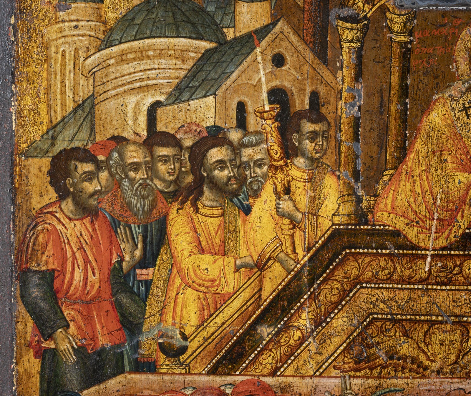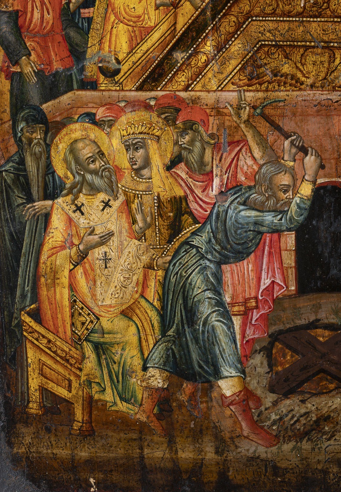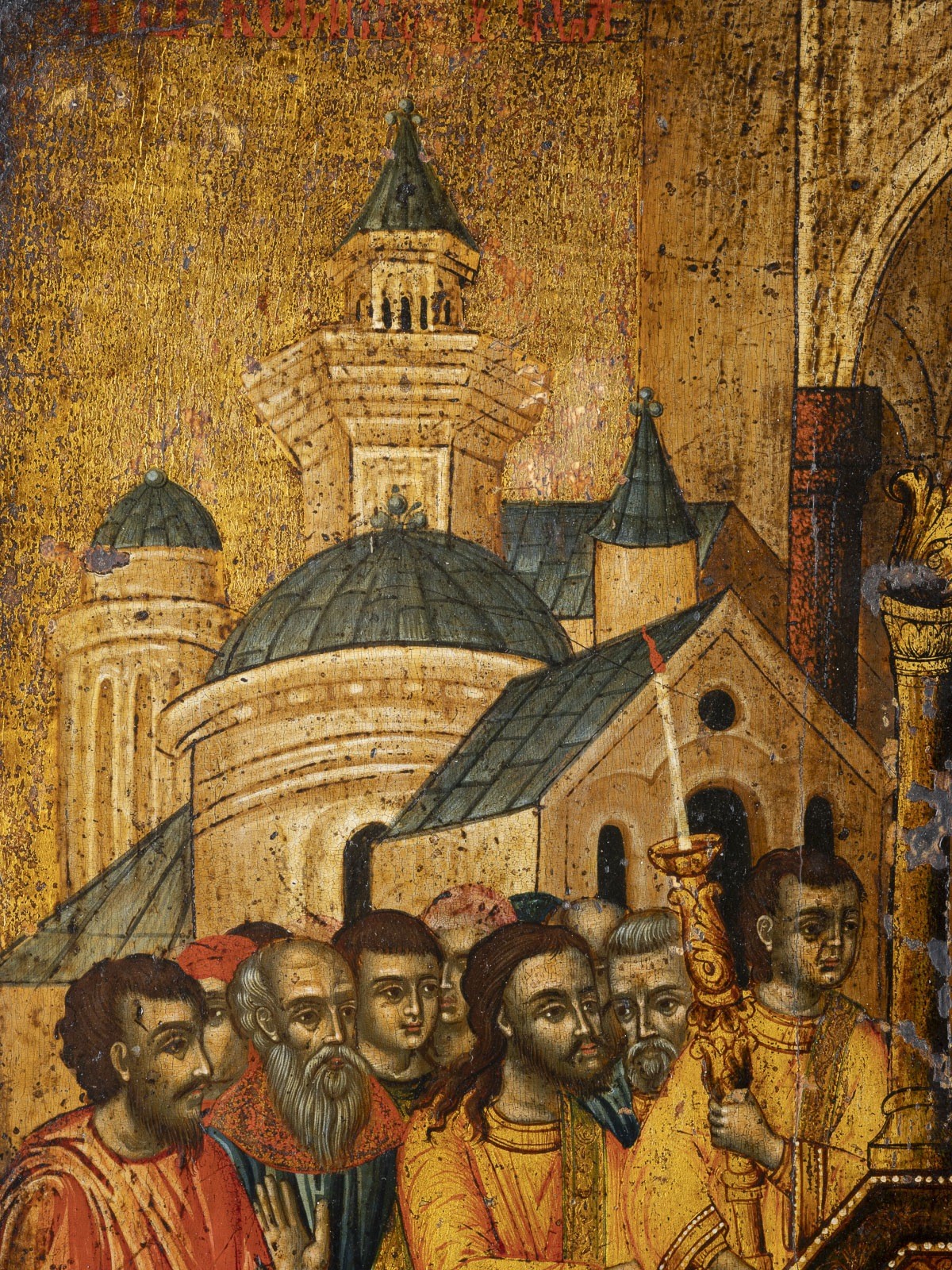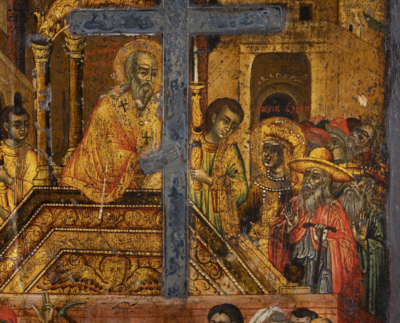 A VERY RARE AND VERY FINE ICON SHOWING THE PROCESSION OF THE PRECIOUS AND LIFE-GIVING CROSS Greek, 18th century Tempera on wood panel. Finely executed in great detail. The finely painted garments made of gold. The cross applied with silver. Minor paint blisterings, minor losses. 49.7 x 36 cm. This type originated in a yearly ritual that took place in Constantinople, originally the chief center of Orthodoxy. The cross of Christ was carried out of the Church of Holy Wisdom and through the city. Then a spring was blessed with it to which the ill could come for healing. A chapel stood beside the spring.