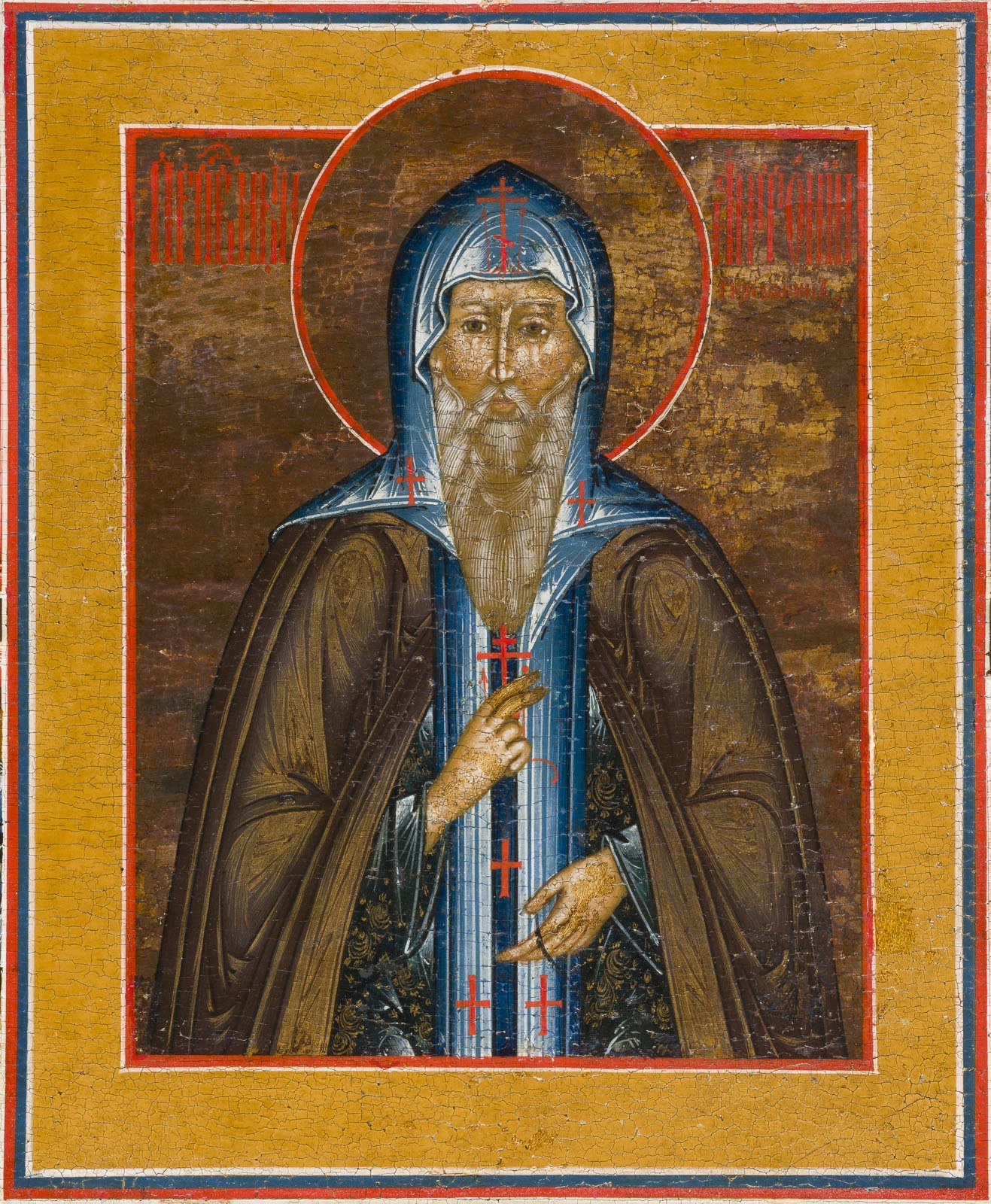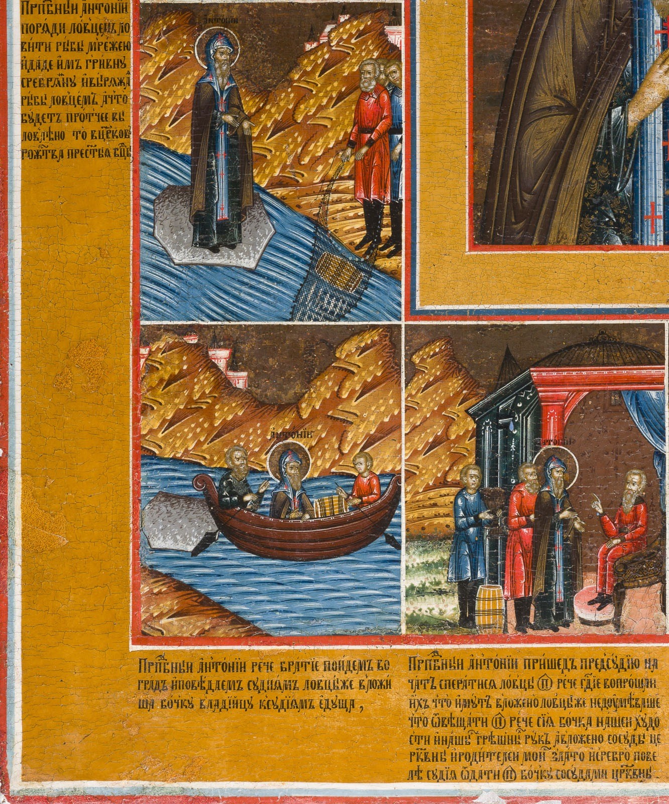 A VERY RARE AND LARGE VITA ICON OF ST. ANTHONY THE ROMAN Russian, circa 1800 Tempera on wood panel. The haloes and background made of gold. The twelve scenes depicting the life of the saint. Born in Rome to a wealthy family, Anthony renounced his inheritance and devoted himself to the ascetic life. According to tradition, he was miraculously carried across the sea on a stone, eventually arriving in Novgorod, where he founded the Monastery of the Nativity of the Mother of God. Venerated as a saint in the Russian Orthodox Church, Anthony the Roman is remembered as a symbol of piety, humility, and steadfast faith. His cult became especially strong in Novgorod, where he is regarded as one of the city's heavenly protectors. The edges minimally chipped, partially restored. 61.6 x 51.4 cm.