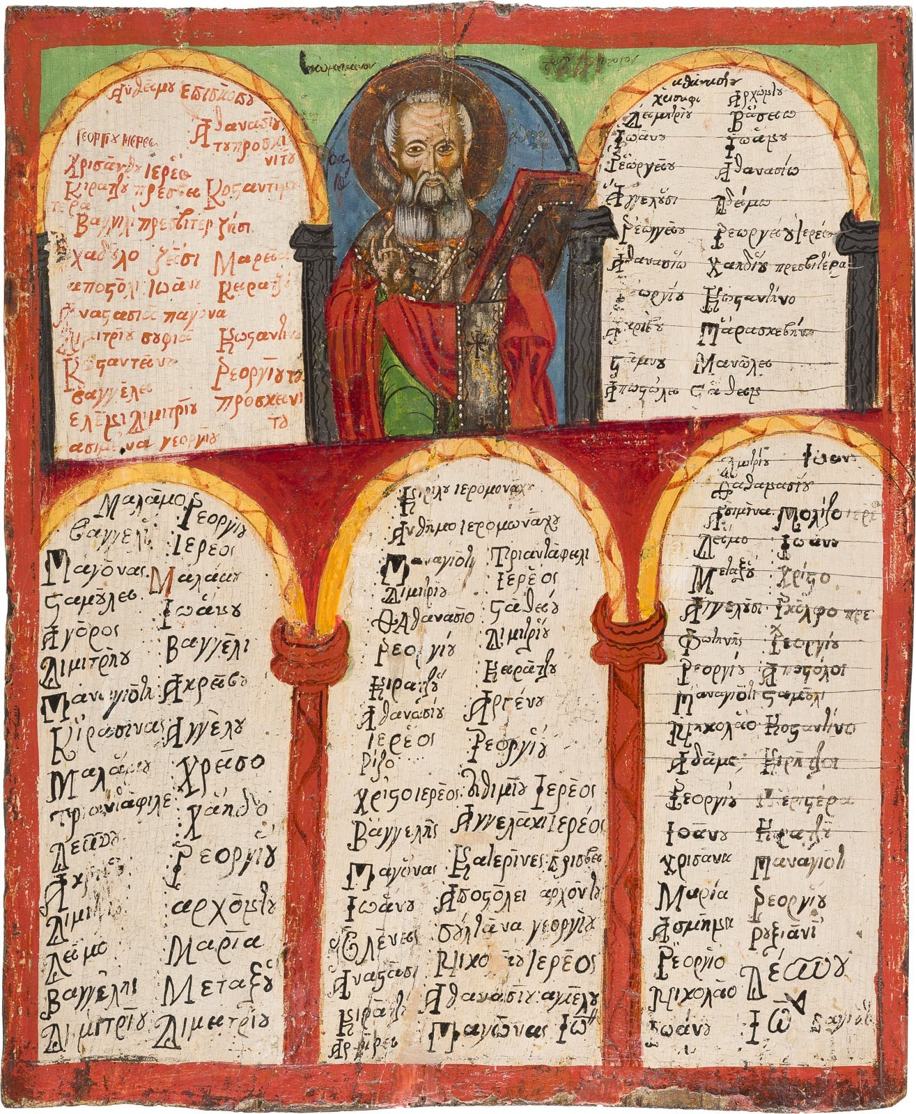 A RARE DATED LITURGICAL ICON Greek, dated 1841 Oil on wood panel. The fields of the composition bear the names of the faithful for whom prayers were offered during the Divine Liturgy. Vertical crack, minor restorations. 37.2 x 31.4 cm.