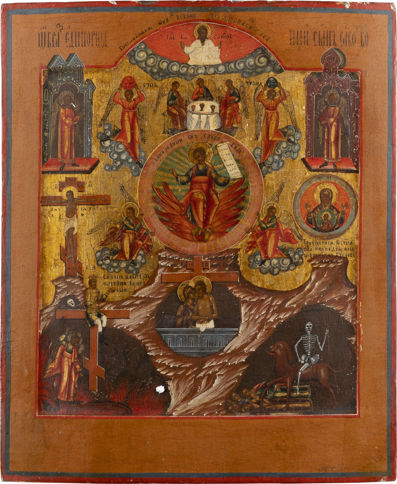 A RARE ICON SHOWING CHRIST 'ONLY BEGOTTEN SON' Russian, Old Believers' workshop, 19th century Tempera on wood panel with kovcheg. The panel depicting Christ Emmanuel enthroned in the centre, surrounded by a large aureole borne up by two angels, above are the Trinity and God Sabaoth with two angels to the left and to the right. At left and right are structures in which stand angels. Two flying angels hold the sun and the moon. In the lower right a triumphant skeleton holding a scythe astride an apocalyptic beast symbolising Death, a victorious Christ dressed in armour opposite. On the borders two selected saints: St. John the Forerunner and St. Ionna. This icon illustrates the second antiphon of the Liturgy of Saint John Chrysostom which begins 'Only Begotten Son and Word of God...'. Minimally restored. 35.3 x 29.5 cm.