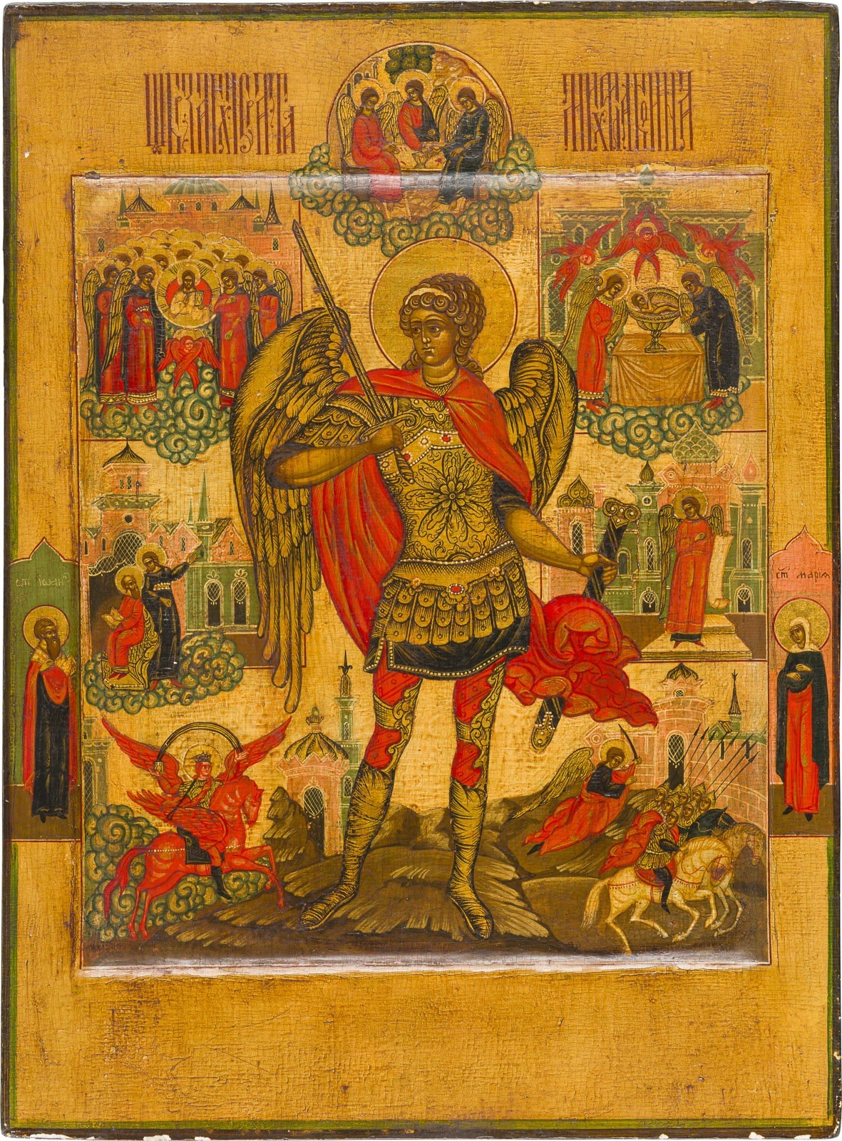 A RARE ICON OF THE ARCHANGEL MICHAEL Recent Tempera on wood panel with kovcheg, partly gilded. With two saints on the borders. Edges slightly consolidated. 34.9 x 26 cm.