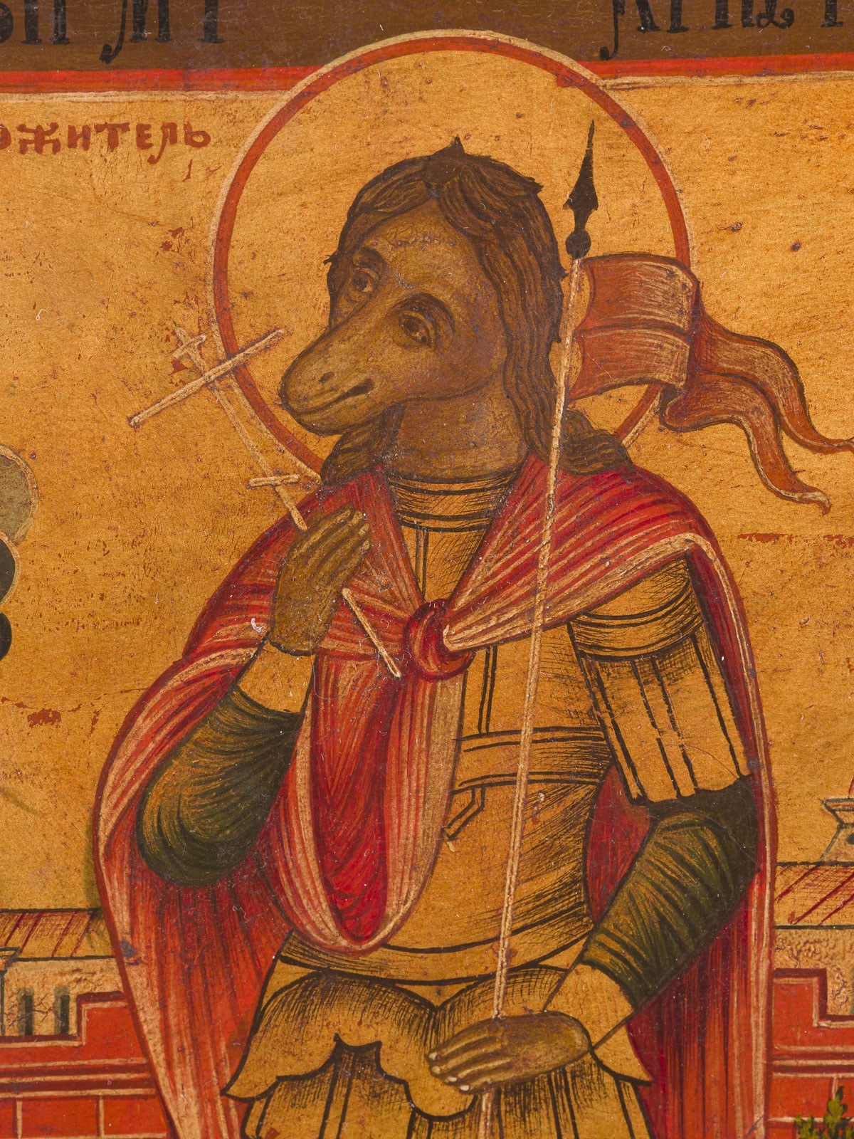 A RARE ICON SHOWING THE DOG-HEADED CHRISTOPHER 20th century Tempera on wood panel. On gold ground. 26 x 20.9 cm.