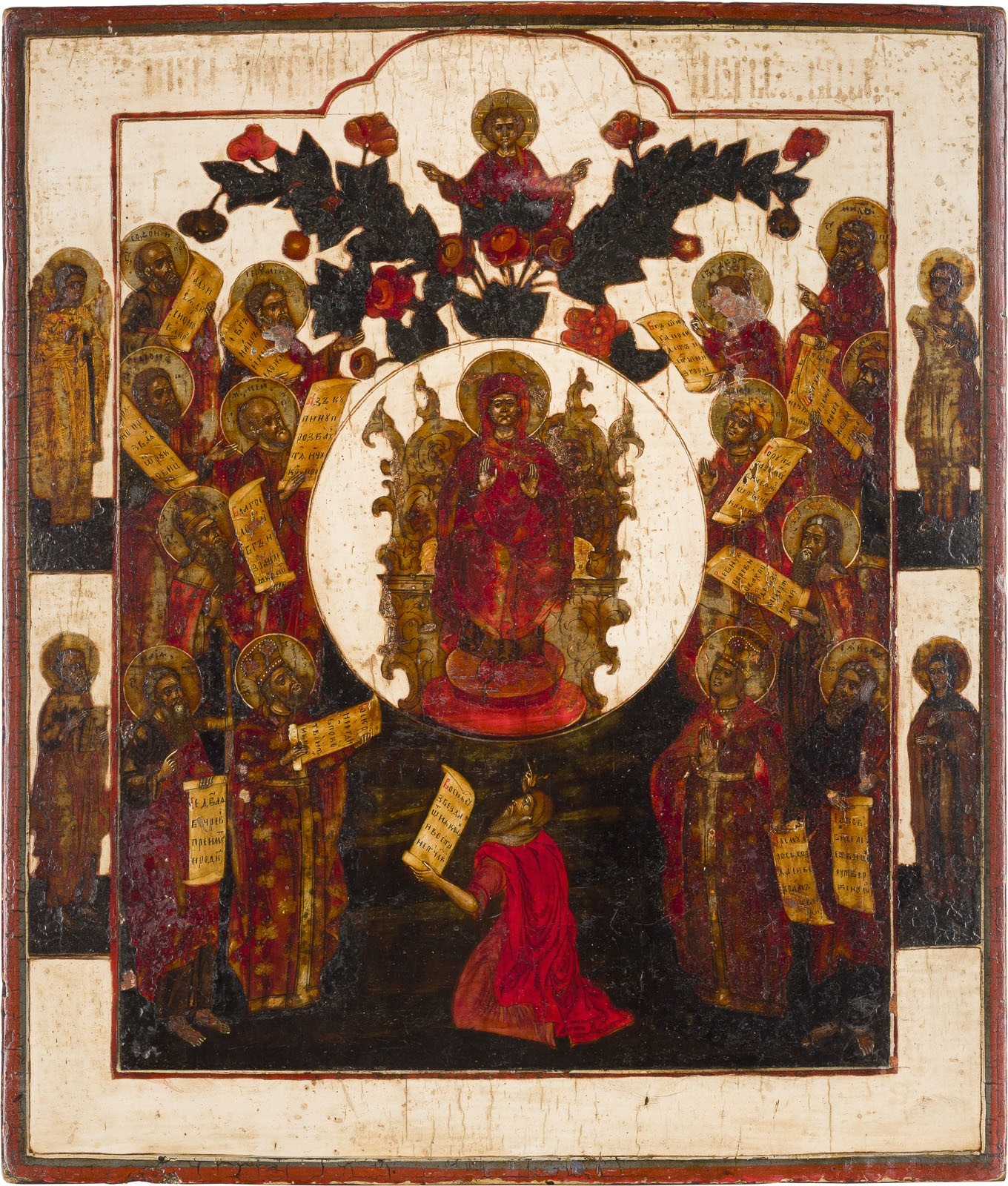 A RARE ICON SHOWING THE PRAISE OF THE MOTHER OF GOD (THE PROPHETS FORETOLD YOU) Russian, 18th century Tempera on wood panel. The haloes made of silver, covered by a golden lacquer. Four selected saints on the borders, the Guardian Angel among them. Damages to the reverse, the background stripped to gesso, partially restored. 35.8 x 31.1 cm.