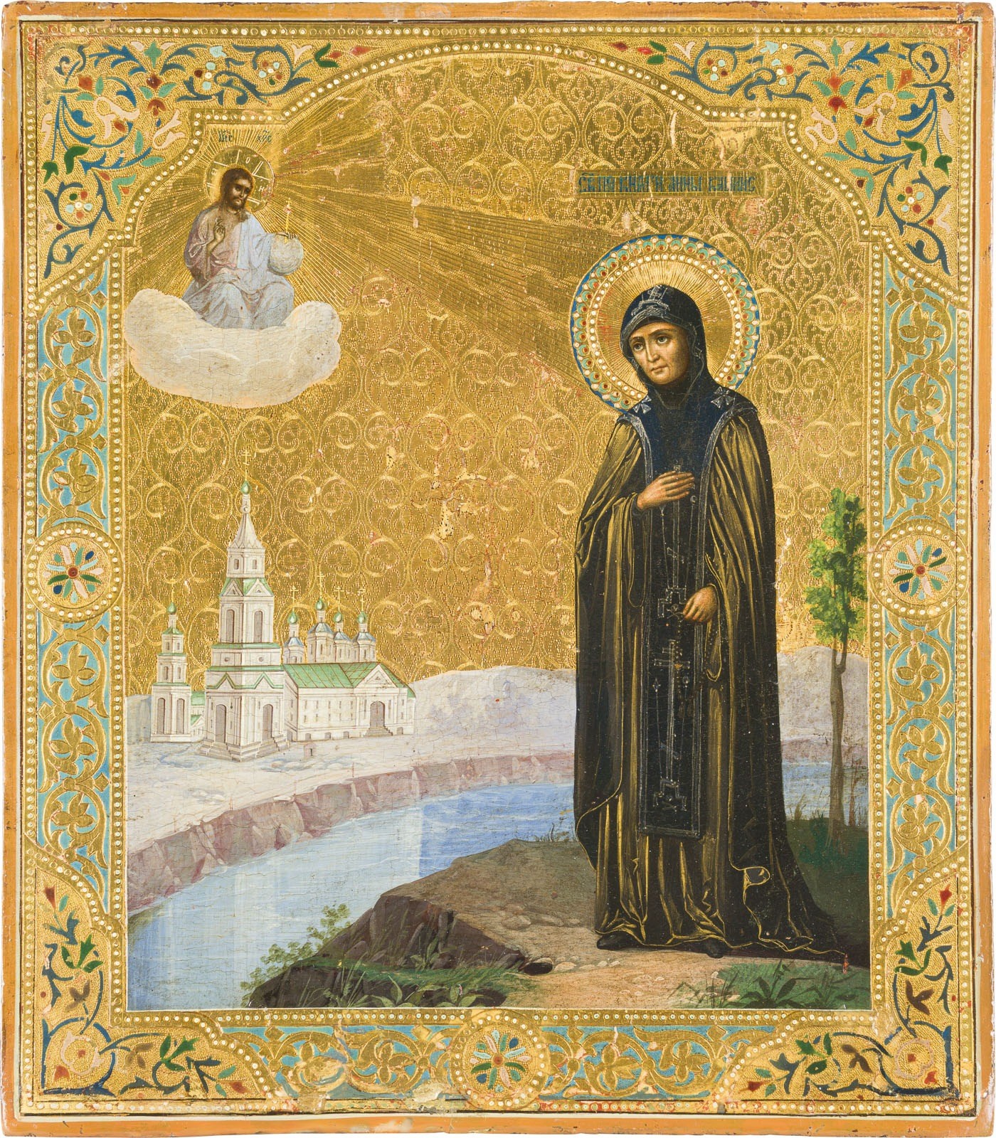 A RARE ICON SHOWING ST. ANNA OF KASHIN Russian, Moscow, after 1909 Tempera on wood panel. The monastic saint standing on the bank of a lake in front of the monastery of Kashin. She is wearing the Great Schema. The background ornately incised and the border painted in faux enameling. Minor losses. 35.2 x 30.5 cm. The Holy Right-believing Princess Anna of Kashin, a daughter of Rostov Prince Demetrius Borisovich, became the wife of the holy Great Prince Michael Yaroslavich of Tver in 1294. After the death of her husband by Mongol Tartars, Anna withdrew into Tver's Sophia monastery and accepted tonsure with the name Euphrosyne. She later transferred to the Kashin Dormition Monastery, and became a schema-nun with the name Anna. She fell asleep in the Lord on October 2, 1338. Commemorated on October 2.