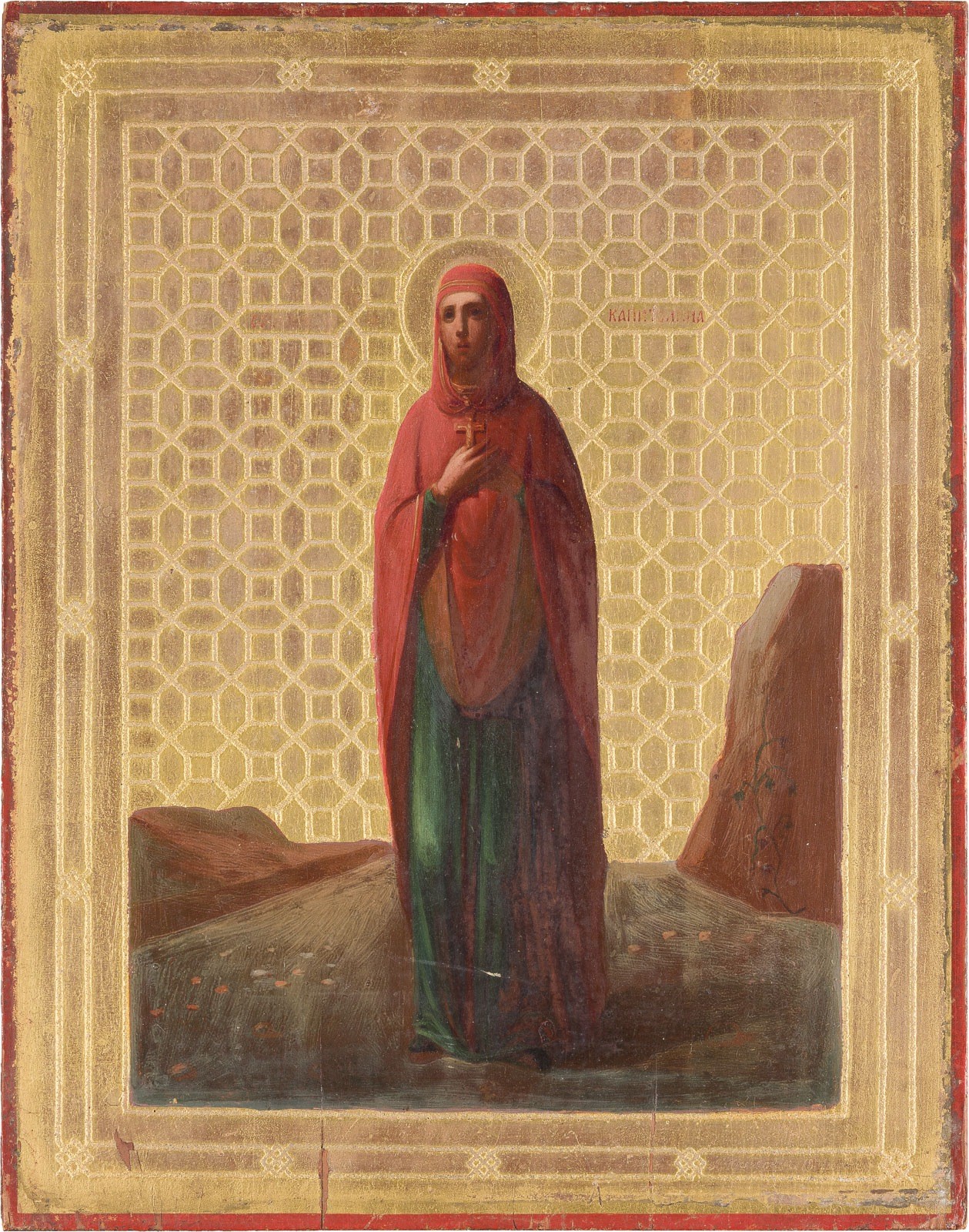 A RARE ICON SHOWING ST. CAPITOLINA Russian, 2nd half of the 19th century Oil on wood panel. Painted with bright colours against a gold background. The background decorated with geometric motifs. 35.5 x 28 cm.