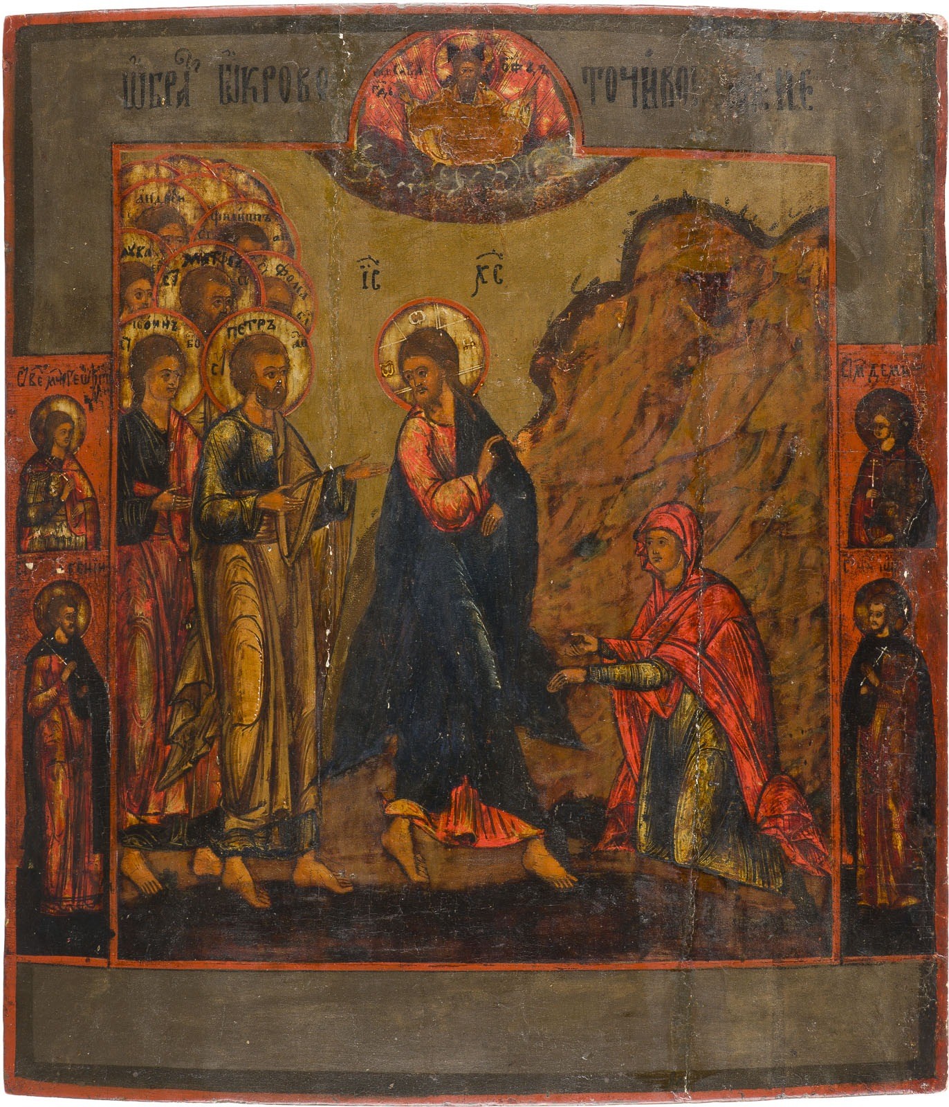 A RARE ICON SHOWING CHRIST HEALING THE BLEEDING WOMAN Russian, 19th century Tempera on wood panel. The haloes made of silver, covered by a golden lacquer. Four selected saints on the borders, St. George among them. Vertical cracks restored. 35 x 31.1 cm.