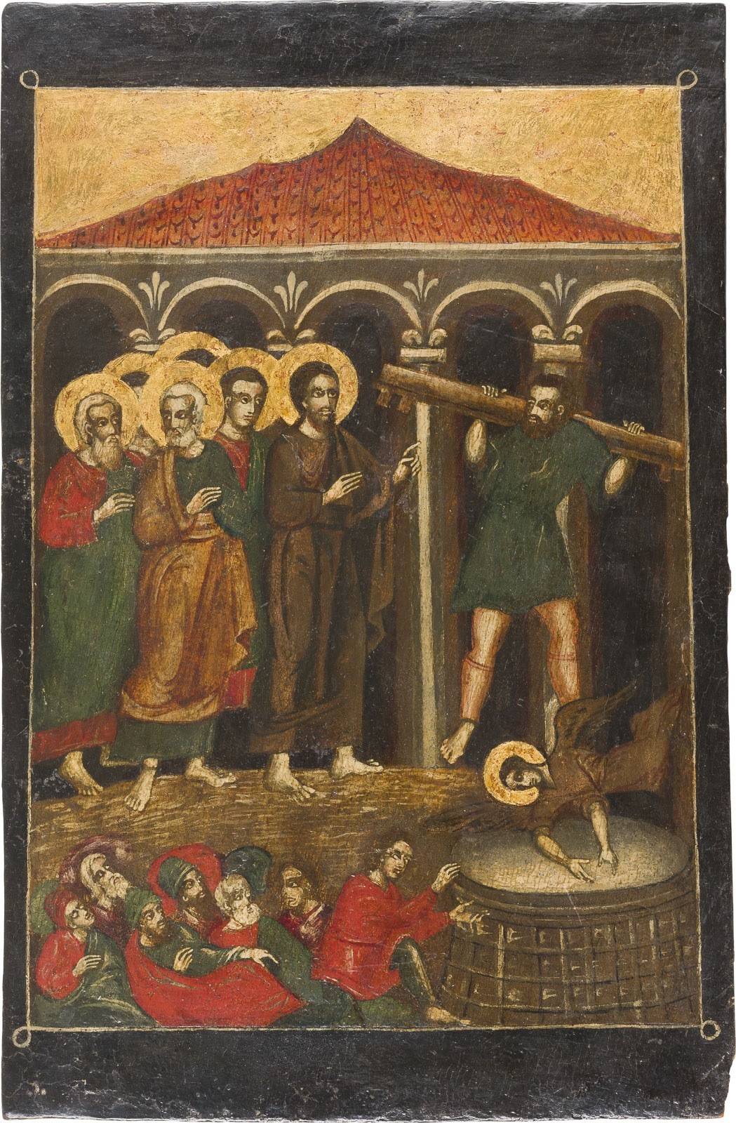 A RARE ICON SHOWING THE HEALING OF THE LAME MAN Greek, 19th century Oil on wood panel. The haloes and background made of gold. Restorations. 38.5 x 24.5 cm.