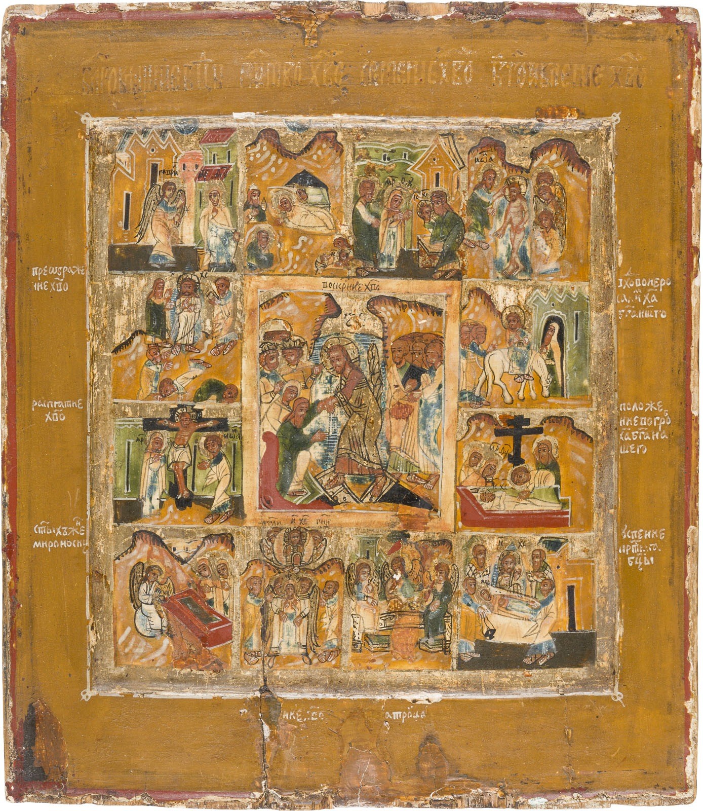 SELTENE IKONE MIT DER HÖLLENFAHRT CHRISTI MIT ZWÖLF HOCHFESTEN DES ORTHODOXEN KIRCHENJAHRES
