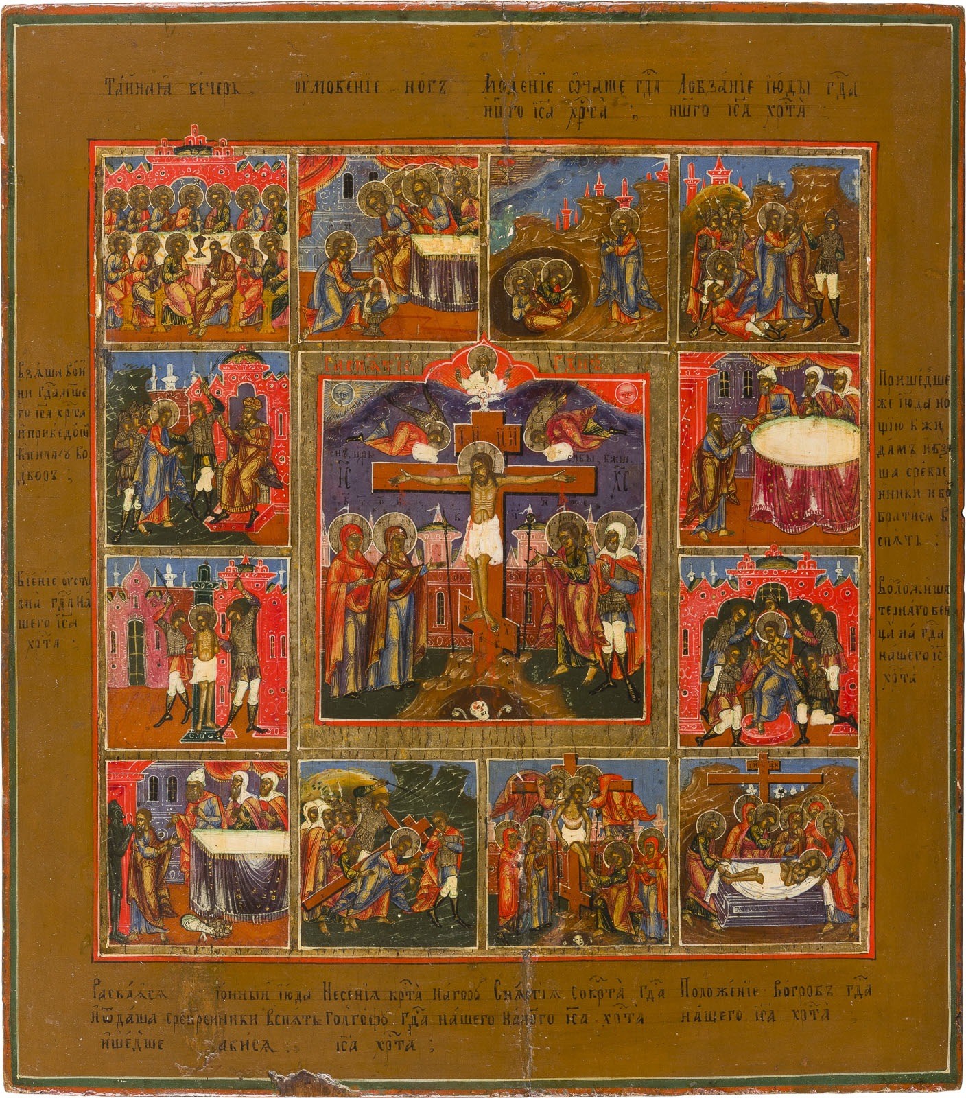A RARE ICON SHOWING THE CRUCIFIXION OF CHRIST SURROUNDED BY THE NARRATIVE OF HIS PASSION Russian, 19th century Tempera on wood panel with kovcheg. The haloes made of silver, covered by a golden lacquer. Vertical crack minimally restored, the edges minimally chipped. 35.1 x 31 cm.