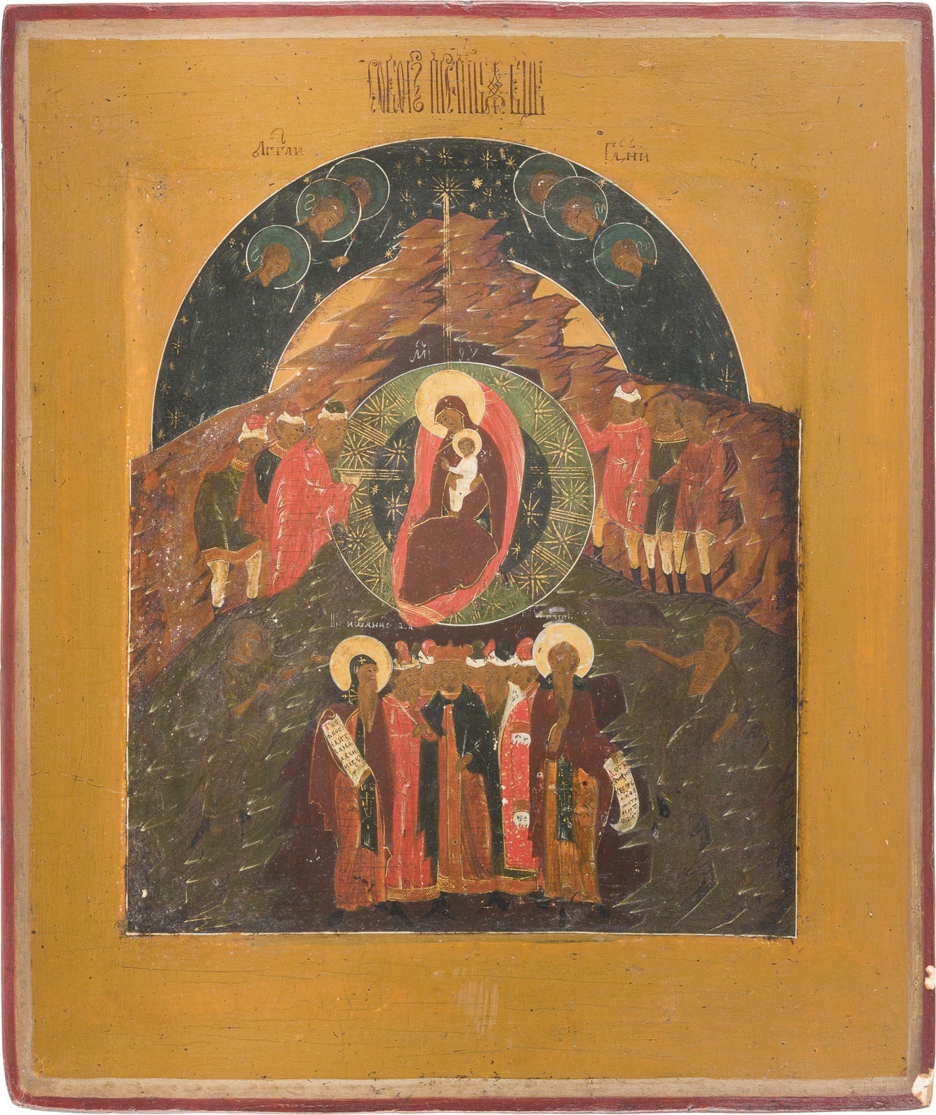 A VERY RARE ICON SHOWING THE ASSEMBLY OF THE MOST HOLY MOTHER OF GOD Russian, 19th century (in the style of the 17th century) Tempera on wood panel with kovcheg. The haloes made of gold. The Mother of God and Christ flanked by the three Magi to the left and three sheperds to the right. On the upper part of the composition two groups of angels appearing in the open heavens, kneeling in front of the star of Bethlehem. Below the Mother of God a group of saints flanked by St. John of Damascus and Euthymius the Great bearing open scrolls. The lower corners showing the personification of the Earth and the Desert. 30.8 x 25.5 cm.