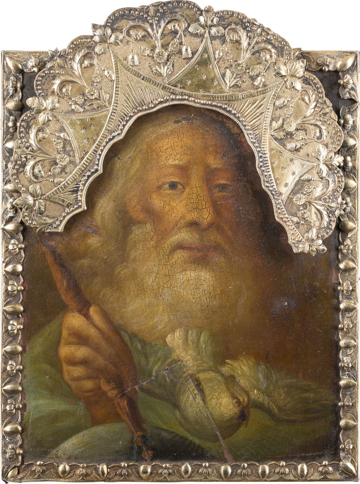 A RARE ICON SHOWING LORD SABAOTH WITH SILVER-GILT BASMA Russian, late 18th century Oil on wood panel. The borders and the silver-gilt halo chased and repoussé with scrolls, vases, swags, and floral ornament. Partially restored. 29.4 x 22.1 cm.