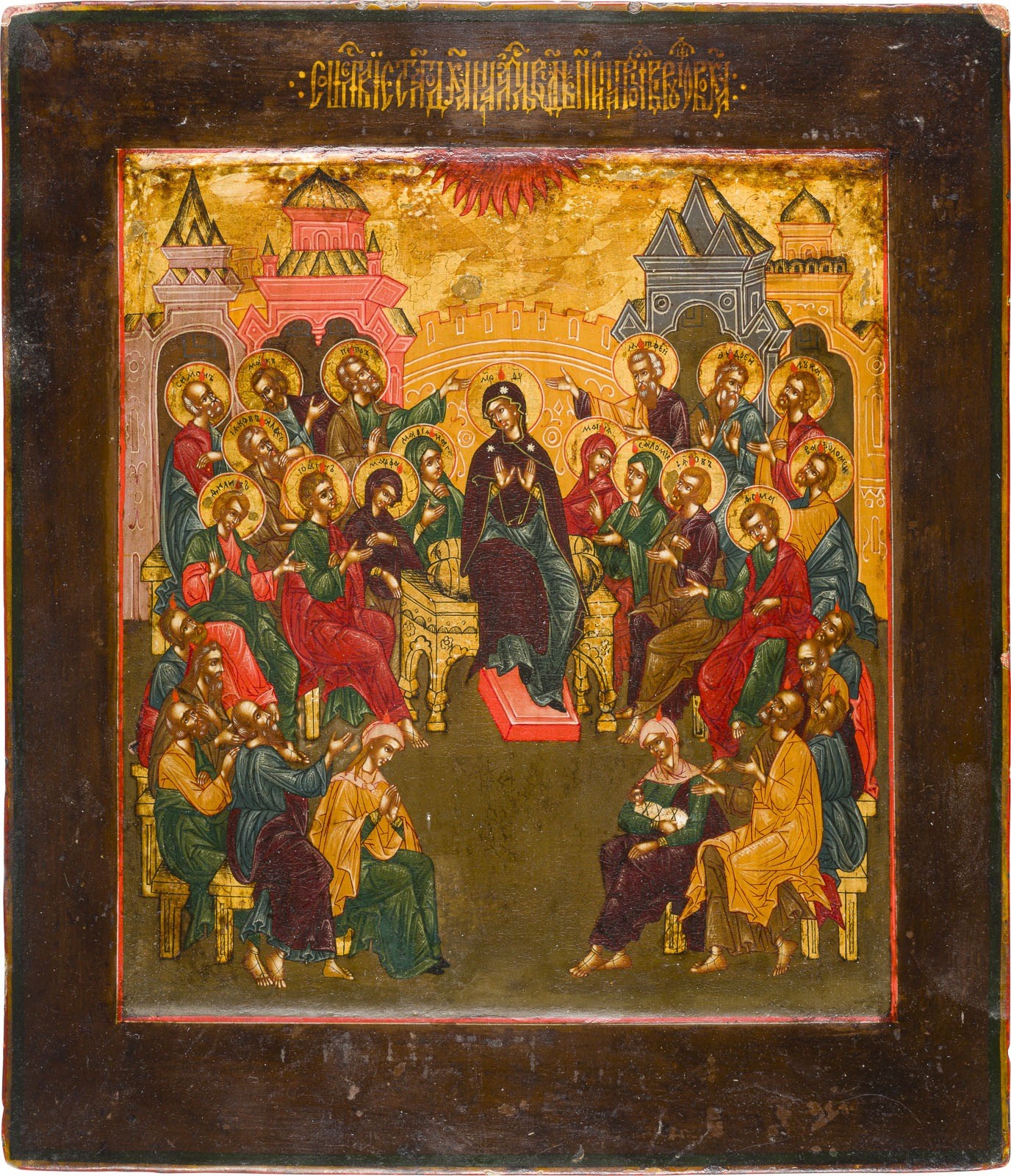 A RARE ICON OF PENTECOST Russian, probably Syzran, Feodor Arkhipovich Bochkarev, late 19th century Tempera on wood panel with kovcheg, with gilded haloes and background. Depicting the Mother of God enthroned amidst the Apostles and saints, with tongues of fire descending from above. Edges slightly consolidated. 35.5 x 31 cm.