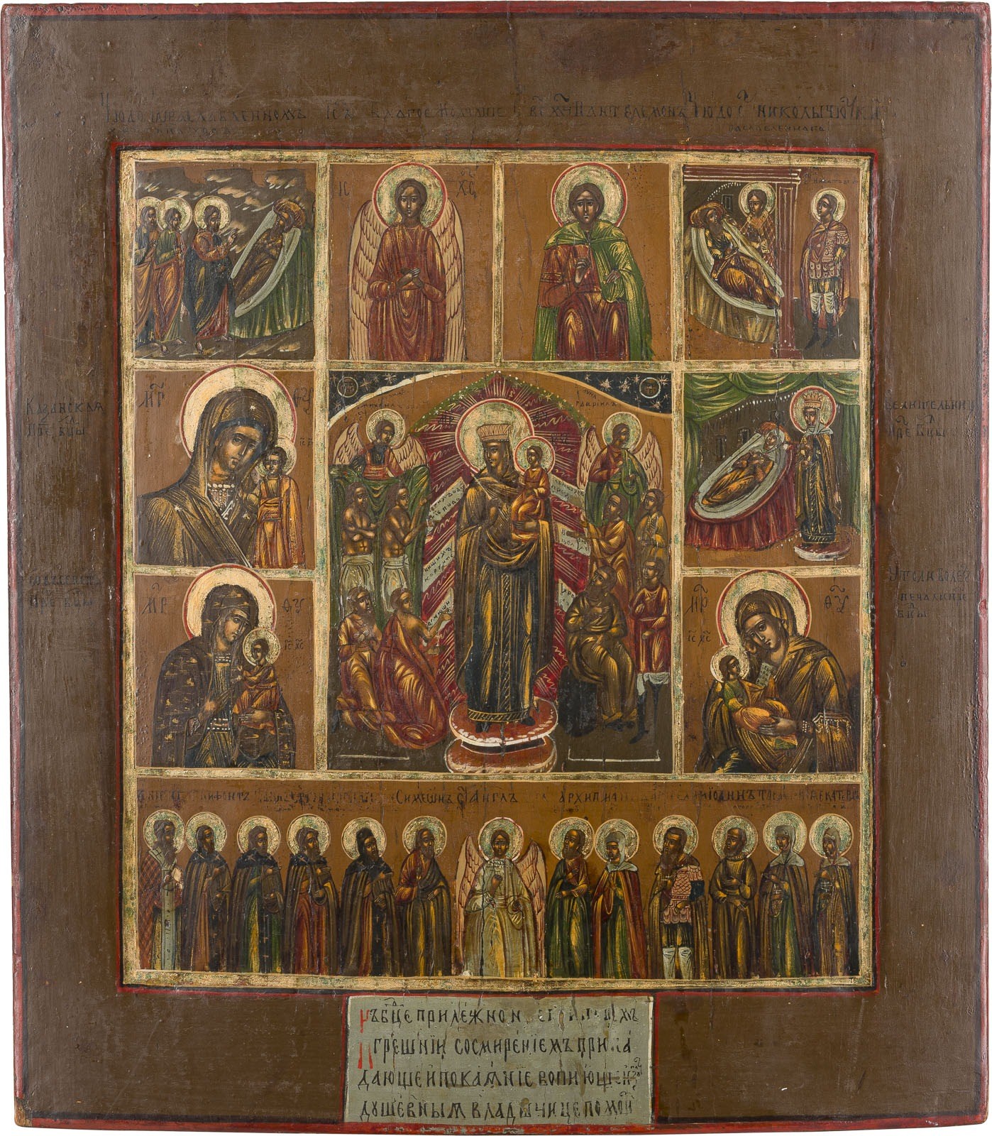 A RARE MULTI-PARTITE ICON SHOWING THE MOTHER OF GOD 'JOY TO ALL WHO GRIEVE', IMAGES OF THE MOTHER OF GOD AND SAINTS Russian, Old Believers Workshop, 19th century Tempera on wood paenl with kovcheg. The haloes made of gold. Restored. 35 x 30.7 cm.