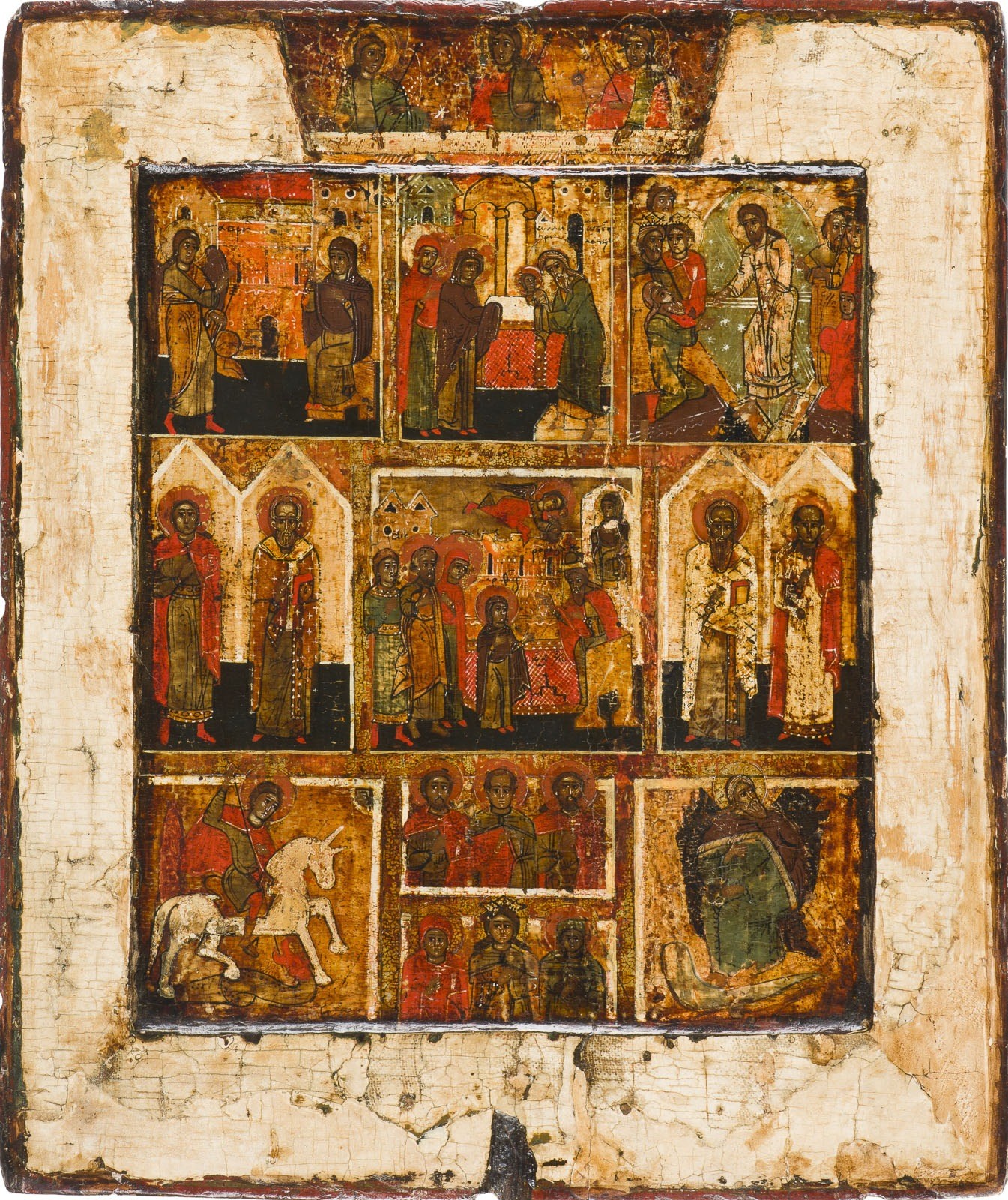 A RARE MULTI-PARTITE ICON WITH MAJOR FEASTS AND SELECTED SAINTS Russian, circa 1600 Tempera on wood panel with double kovcheg over canvas, partly gilded. Depicting in three registers the Annunciation, the Presentation in the Temple, the Harrowing of Hades, and the Entry of the Mother of God into the Temple. Border stripped to gesso, partly restored. 31.1 x 26.6 cm.