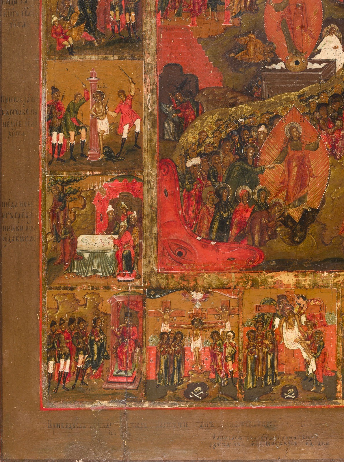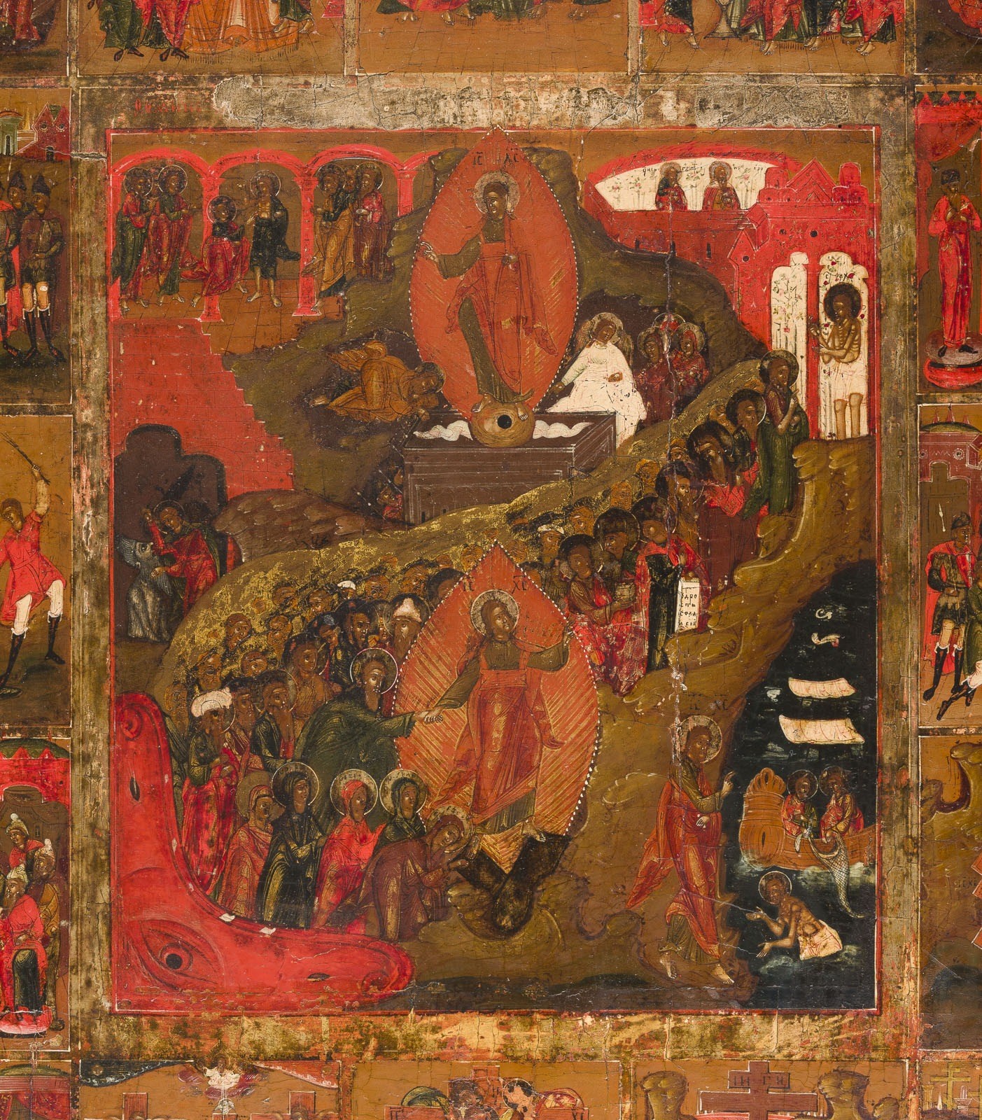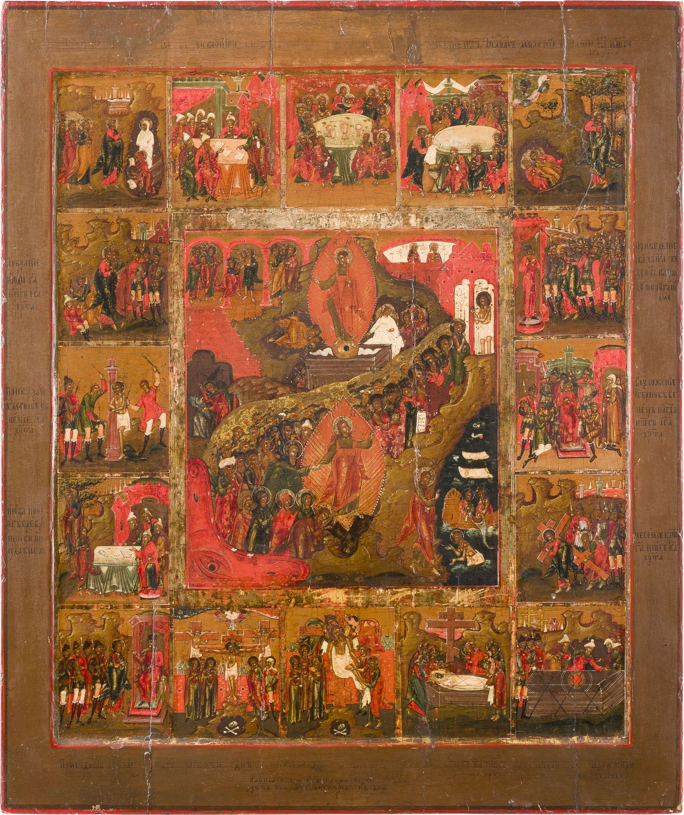 SELTENE UND GROSSFORMATIGE IKONE MIT DER HÖLLENFAHRT UND AUFERSTEHUNG CHRISTI MIT 16 SZENEN DER PASSION CHRISTI