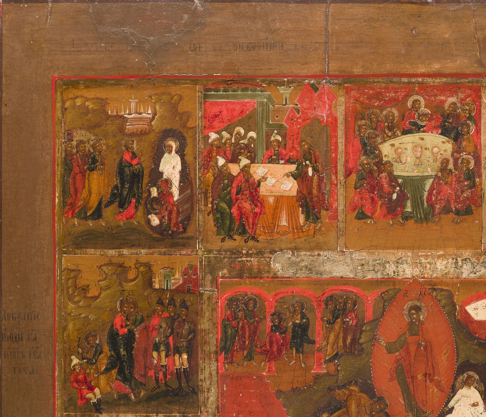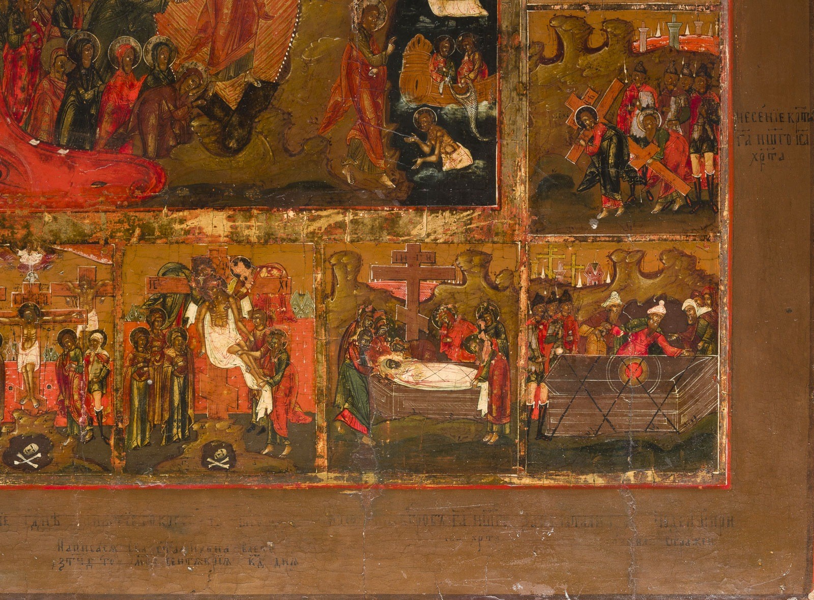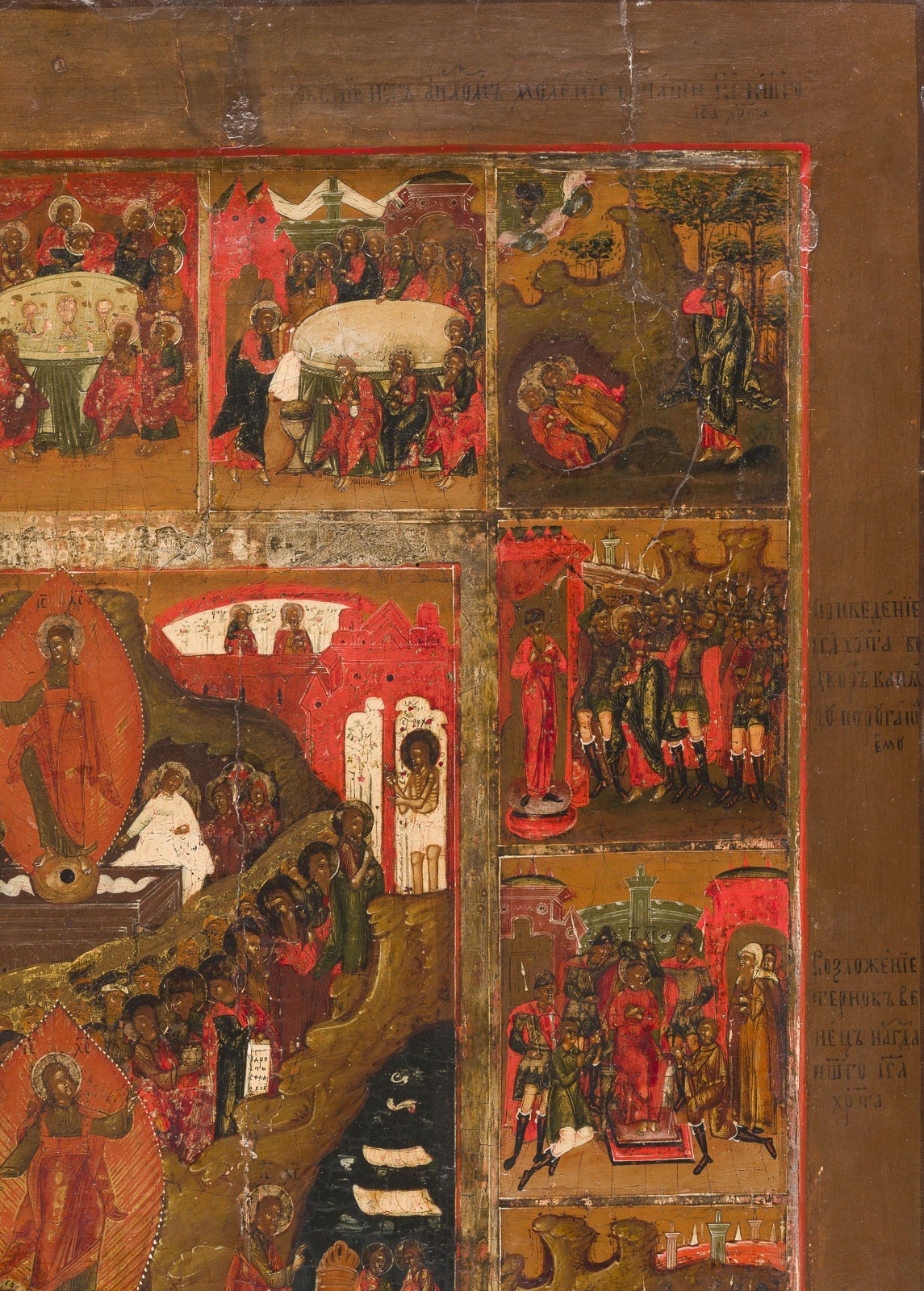 A RARE AND VERY LARGE ICON SHOWING THE RESURRECTION AND THE DESCENT INTO HELL SURROUNDED BY THE NARRATIVE OF HIS PASSION Russian, late 18th century Tempera on wood panel with kovcheg. The haloes and borders made of silver, covered by a golden lacquer. Minor vertical cracks, partially restored. 60 x 50.3 cm.