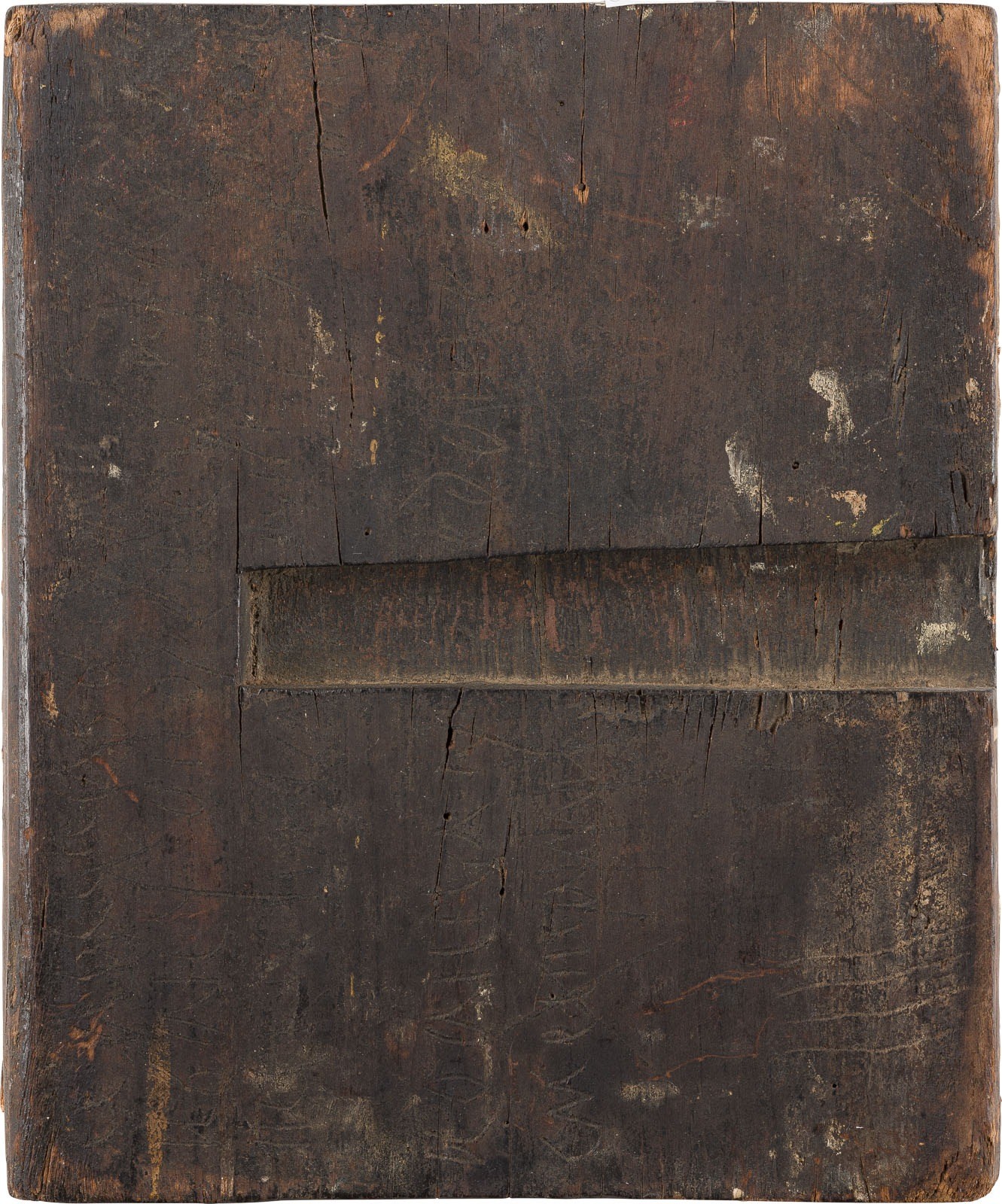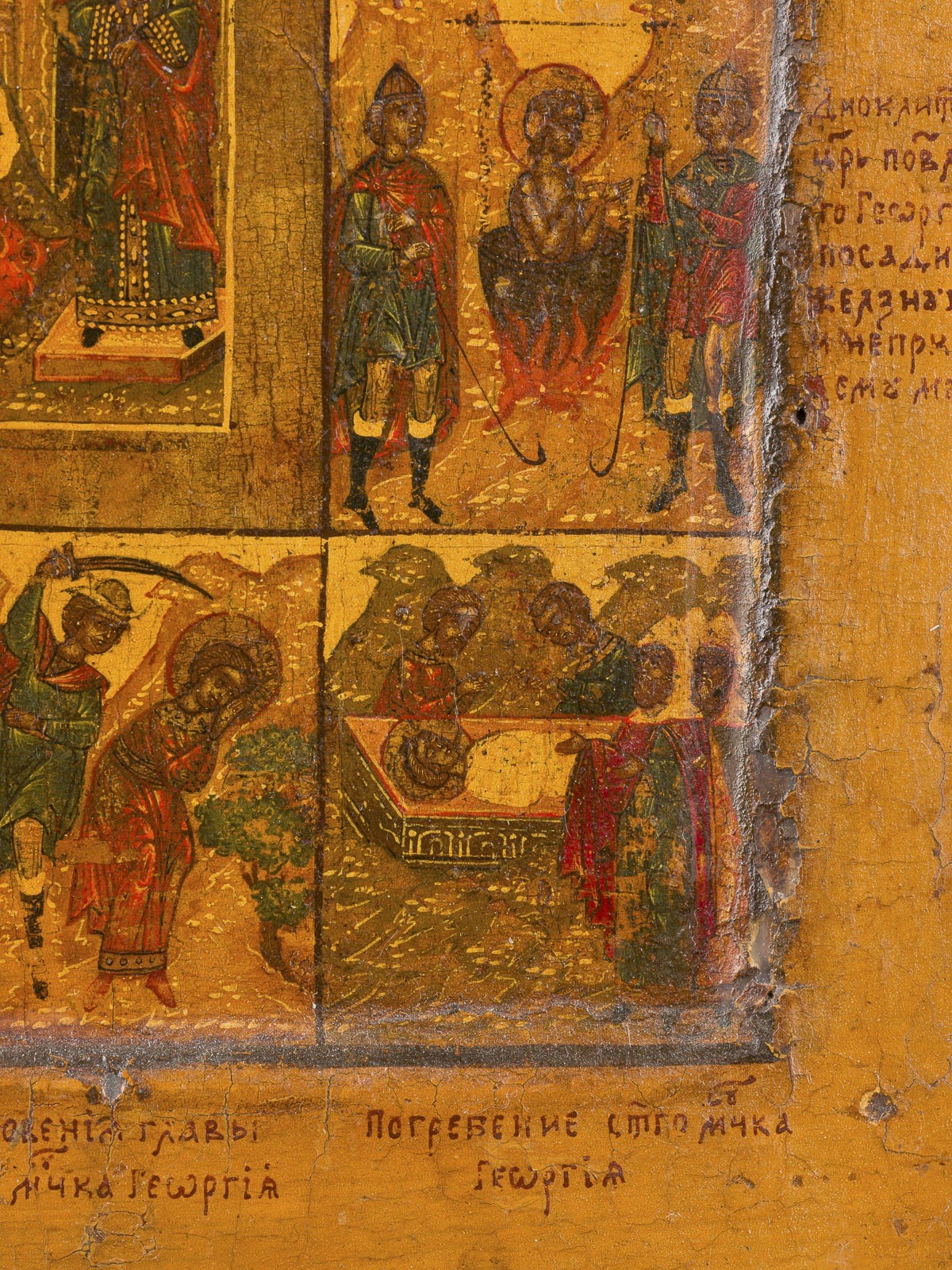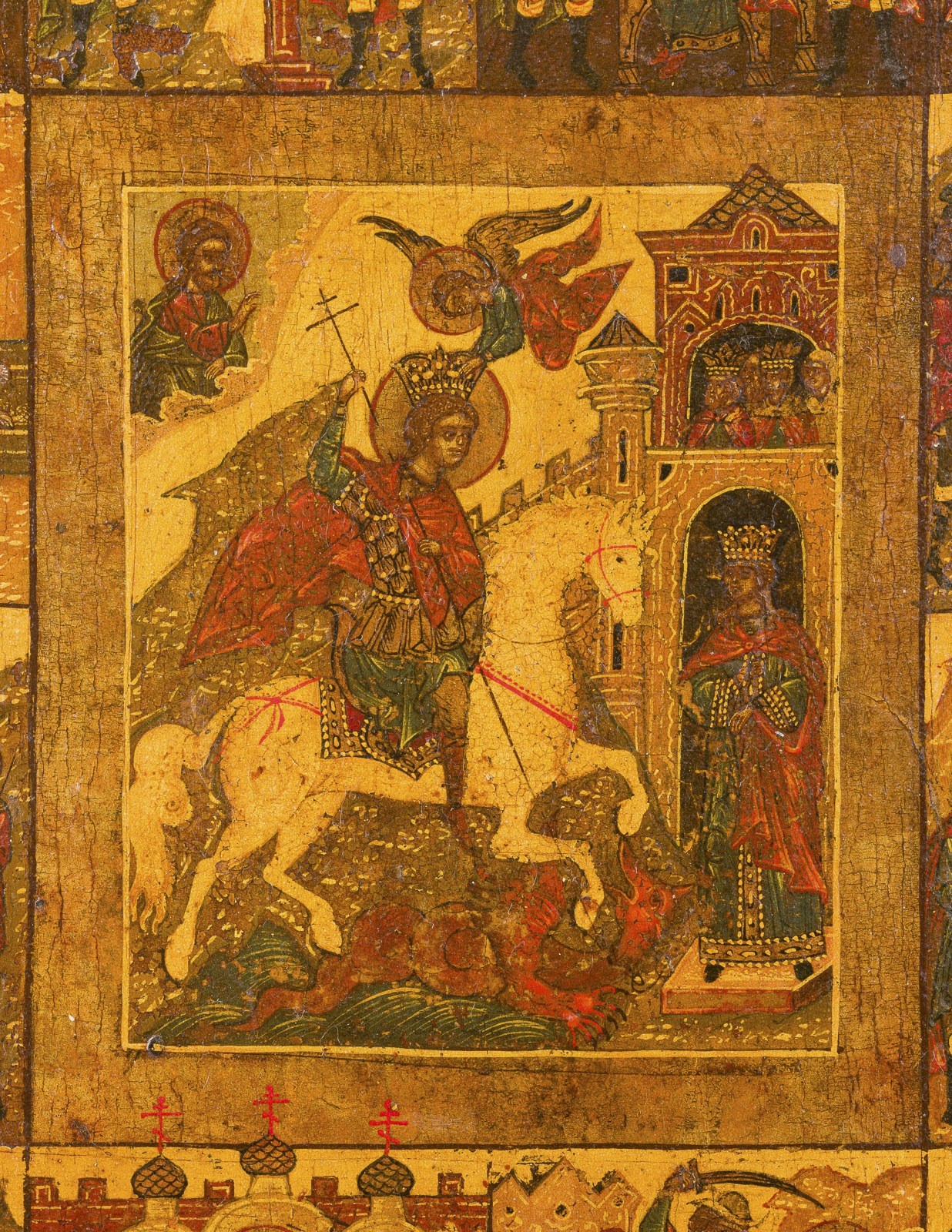 A RARE VITA ICON OF ST. GEORGE KILLING THE DRAGON Russian, 19th century Tempera on wood panel with kovcheg. The haloes made of gold. The edges partially restipped, partially restored. 27.3 x 23 cm.