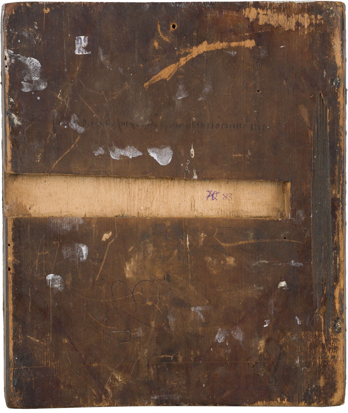 A SIGNED ICON WITH THE MOTHER OF GOD OF VLADIMIR (VLADIMIRSKAYA) Russina, Ostashkovo, signed by Mikhail Potapov, circa 1700 Tempera on wood panel with double kovcheg. On the reverse, Cyrillic inscription: 'This depiction [.] (Christ?) Mikh[a]lo Potapov, son'. Partially restored. 27.3 x 23.5 cm. The icon painter Mikhail Potapov was mentioned in 1702 in the inscription on an icon of the Mother of God Hodegetria from the Trinity-Makaryev Monastery in Kalyazin near Tver. He may also have been related to the renowned dynasty of icon painters from Ostashkovo, whose roots go back to the mid-17th century.