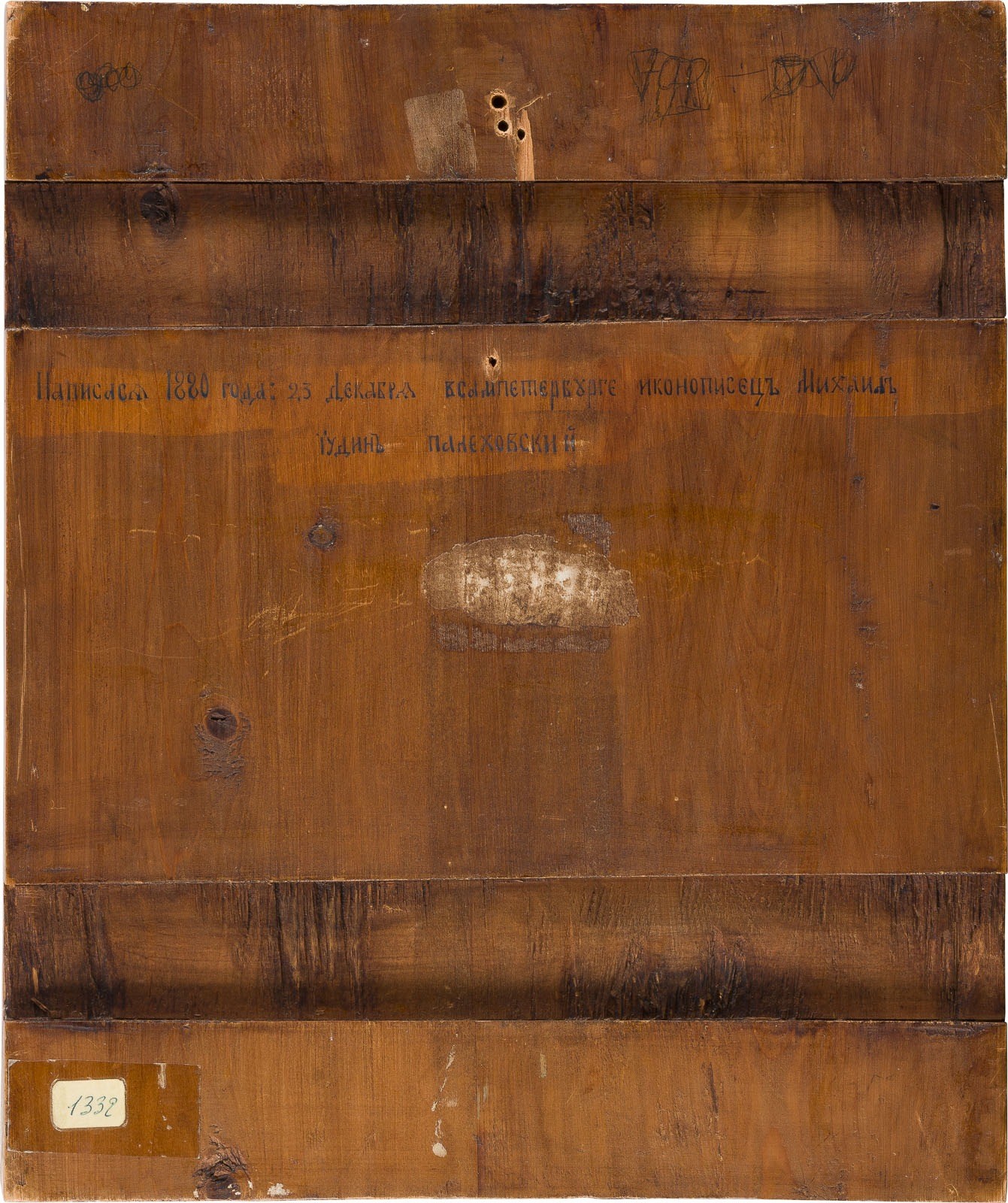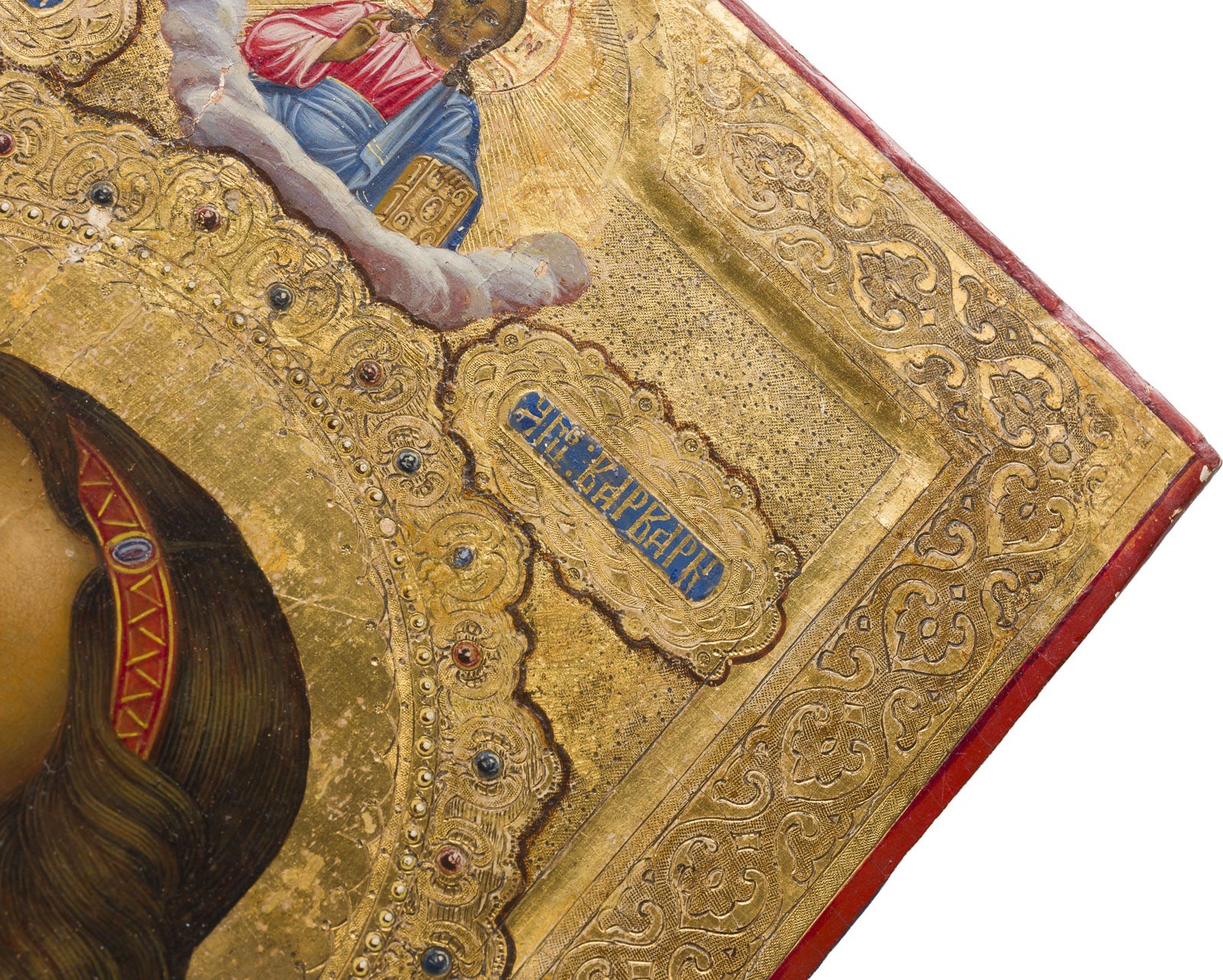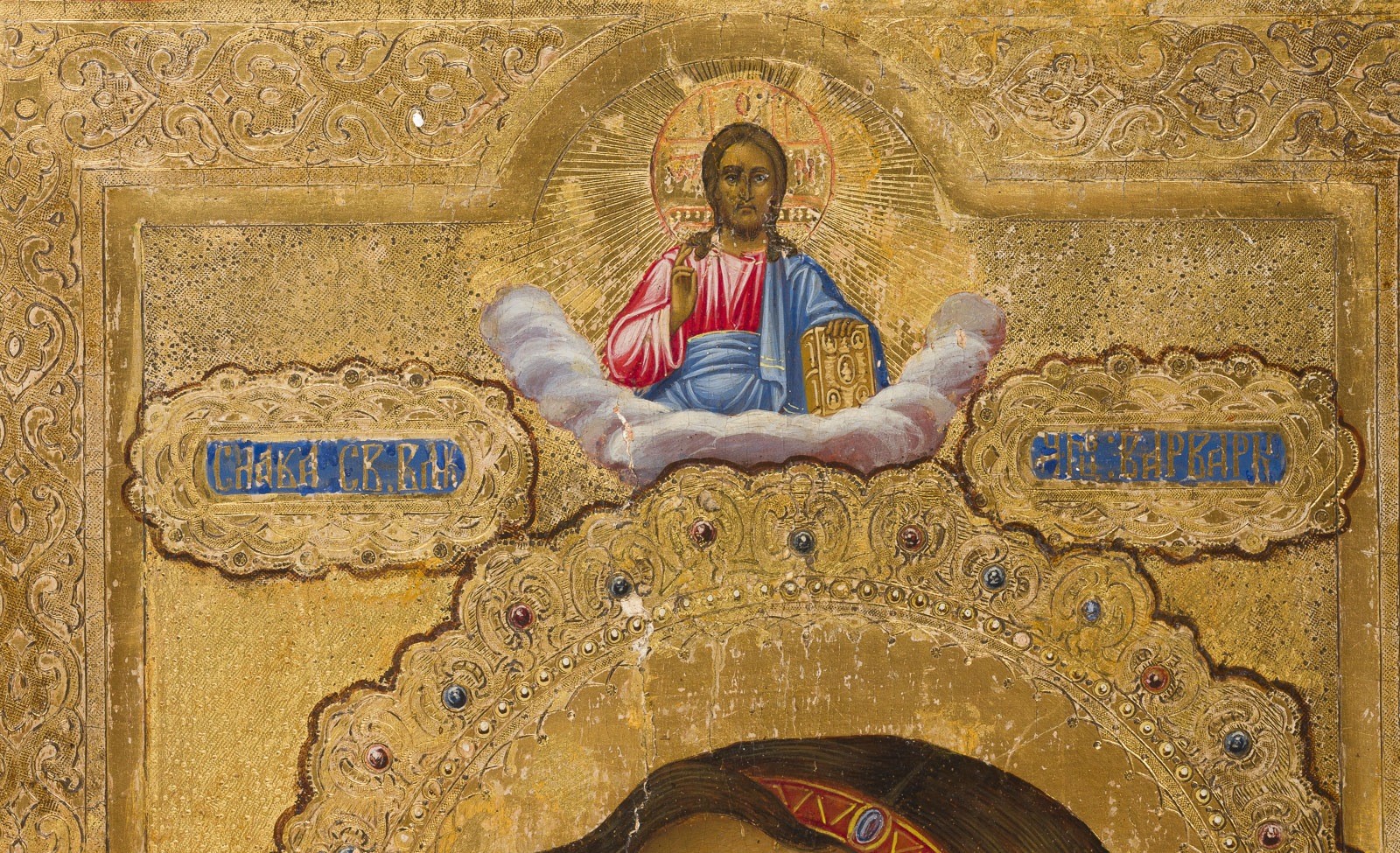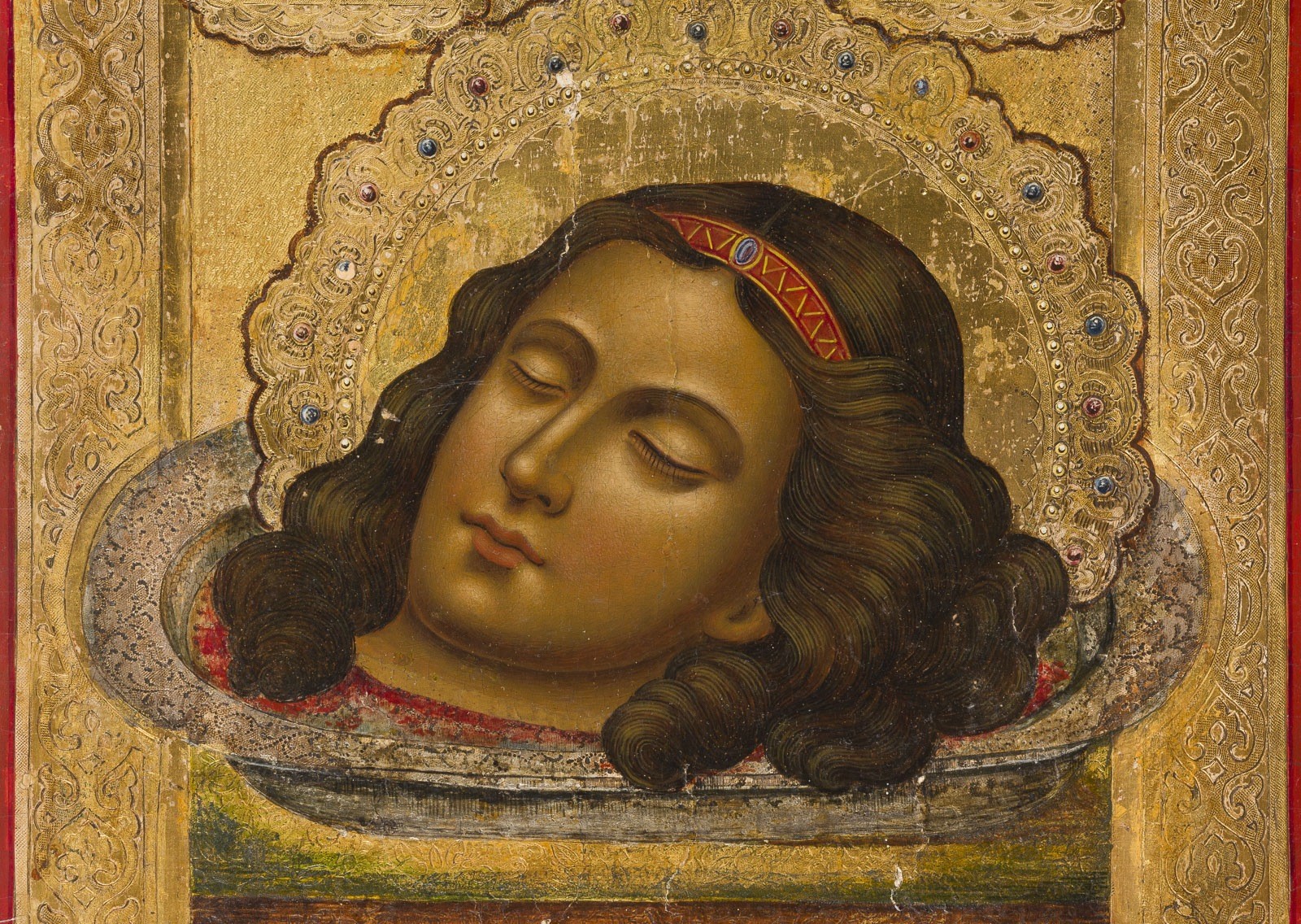 A SIGNED AND DATED ICON SHOWING THE HEAD OF ST. VARVARA Russian, Palekh, Mikhail Yudin (1818-1900), dated 1880 Tempera on wood panel with kovcheg. The halo, background and border gilded and ornately incised and painted in faux enameling. The reverse signed and dated in Cyrillic. The border minimally restored. 30.7 x 26 cm.