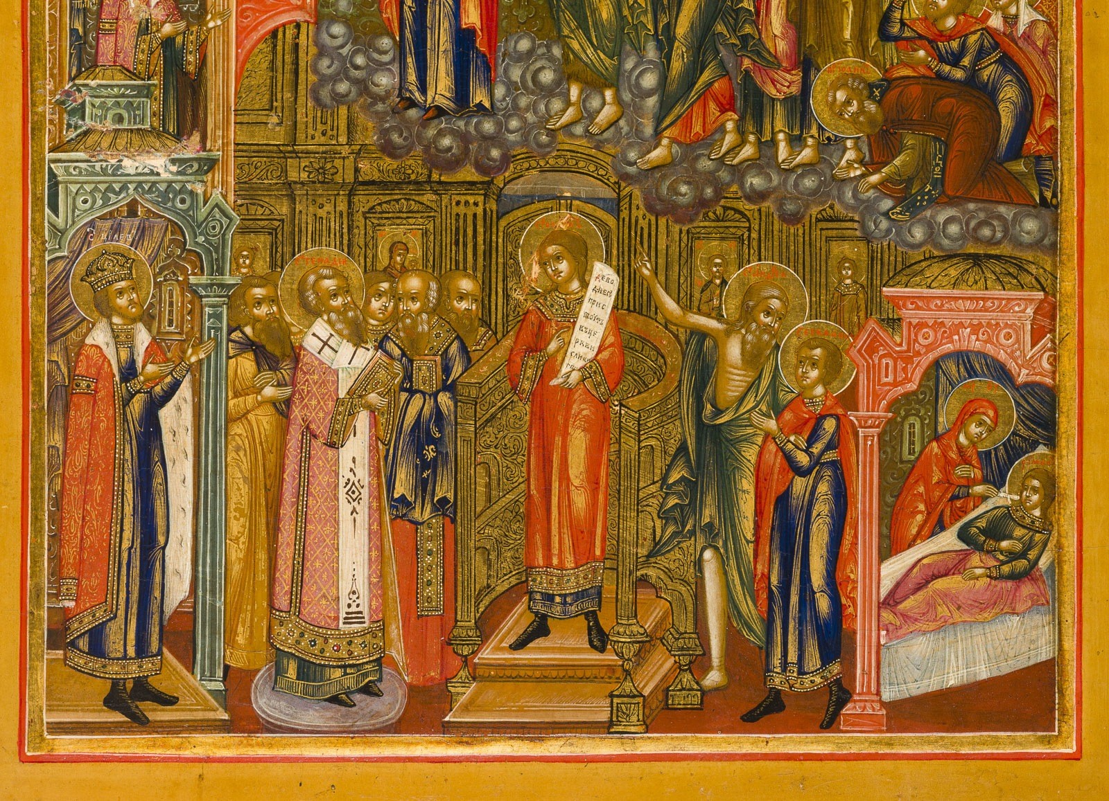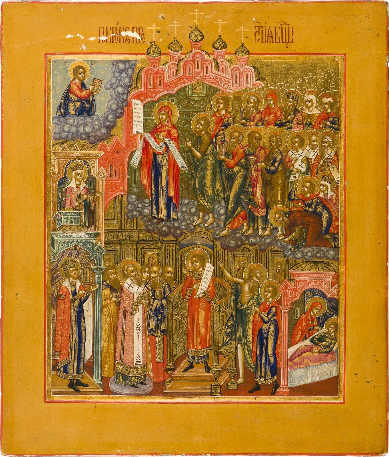 A SIGNED AND DATED ICON SHOWING THE PROTECTING VEIL OF THE MOTHER OF GOD (POKROV) Russian, Moscow, Leontiy Popov, dated 1853 Tempera on wood panel with kovcheg. Finely painted in great detail on gold ground. Minor paint losses. On the reverse signed, dated and inscribed in Cyrillic. 31.2 x 26.4 cm.