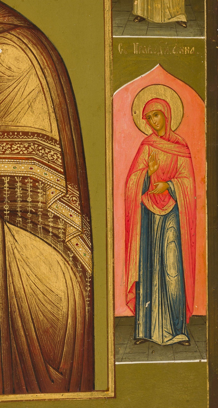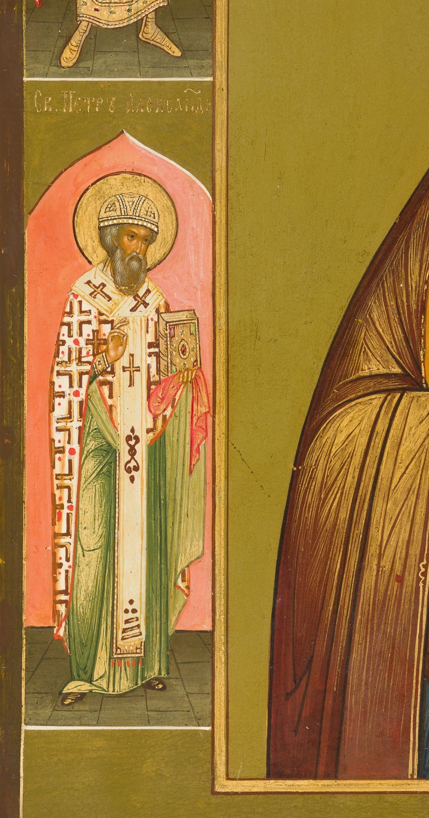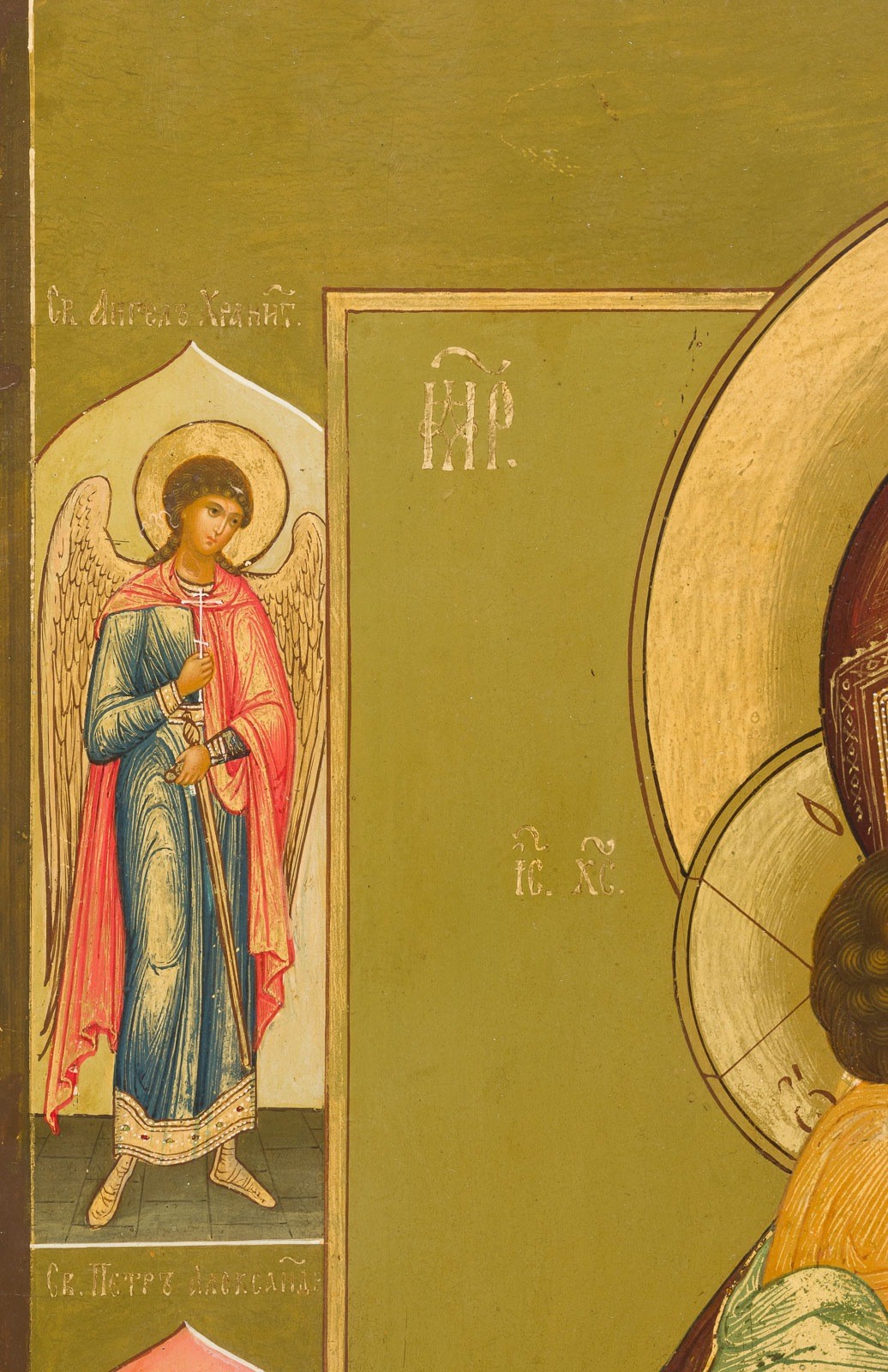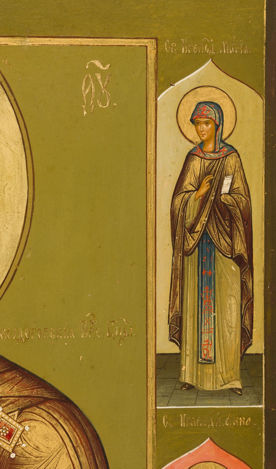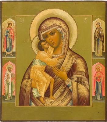 A SIGNED AND VERY FINE ICON SHOWING THE FEODOROVSKAYA MOTHER OF GOD Russian, Moscow, Vasily Guryanov, circa 1900 Tempera on wood panel. The haloes made of gold. The drapery heightened with chrysography. Four selected saints on the borders: Guardian Angel, Sts. Alexander, Mary and Anna. Stamp of Vasily Guryanov on the reverse. Minor areas of retouching. 35.5 x 31.1 cm.