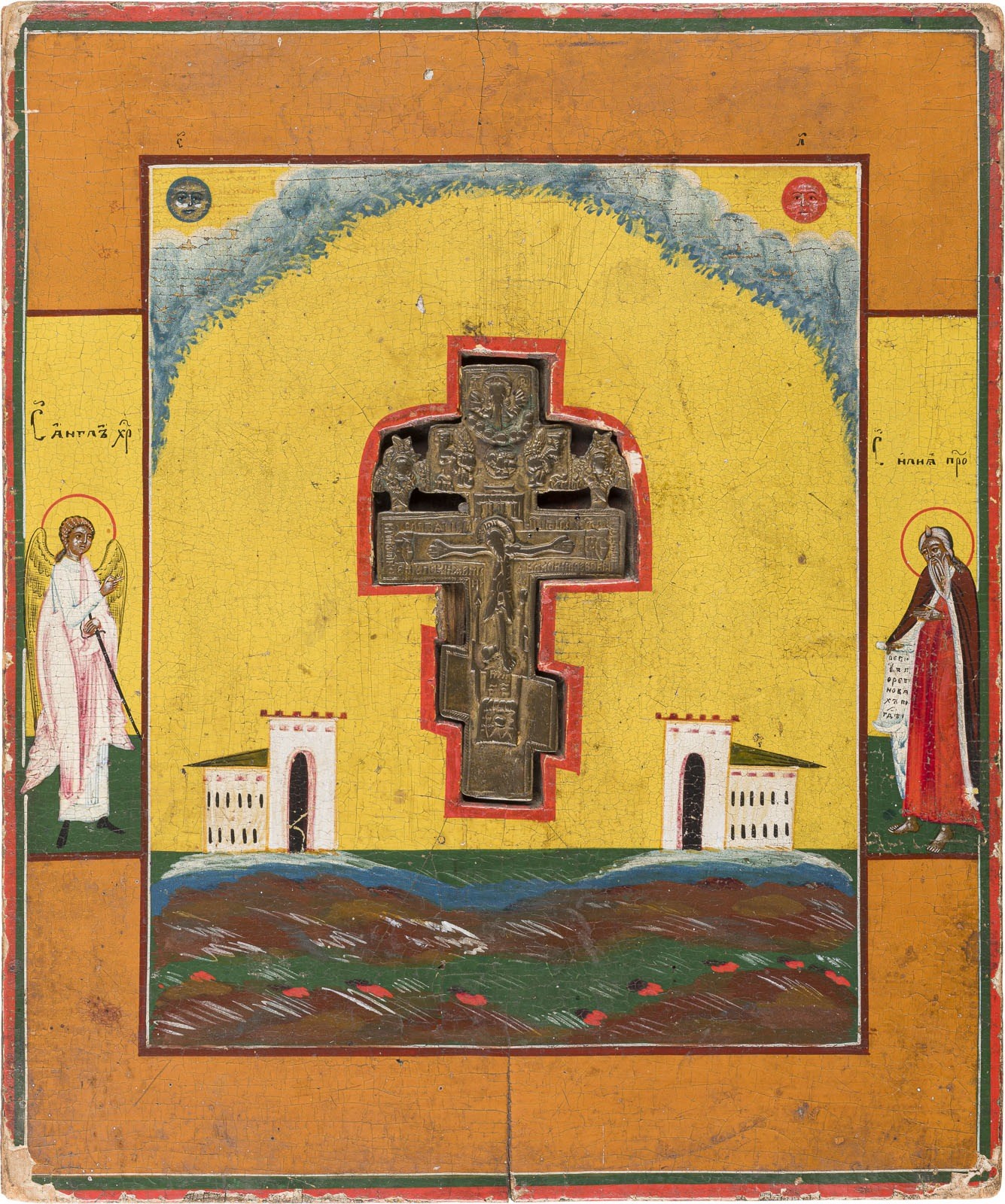 A STAUROTHEK ICON Russian, late 19th century Tempera on wood panel. A brass crucifix inserted in the panel. Two selected saints on the borders: Guardian Angel and the prophet Elijah. Minor losses. 31.1 x 26 cm.