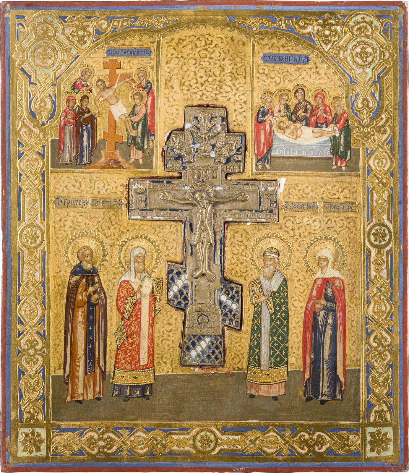 A STAUROTHEK ICON SHOWING THE CRUCIFIXION OF CHRIST, THE DEPOSITION AND THE ENTOMBMENT AND FOUR SAINTS Russian, circa 1880 Tempera on wood panel. Painted against a golden background, ornamental incised background and borders. The corners painted with ornate strapwork and faux cloisonné enameling. A brass and enamel crucifix inserted in the panel. Minor losses. 35.7 x 31 cm.