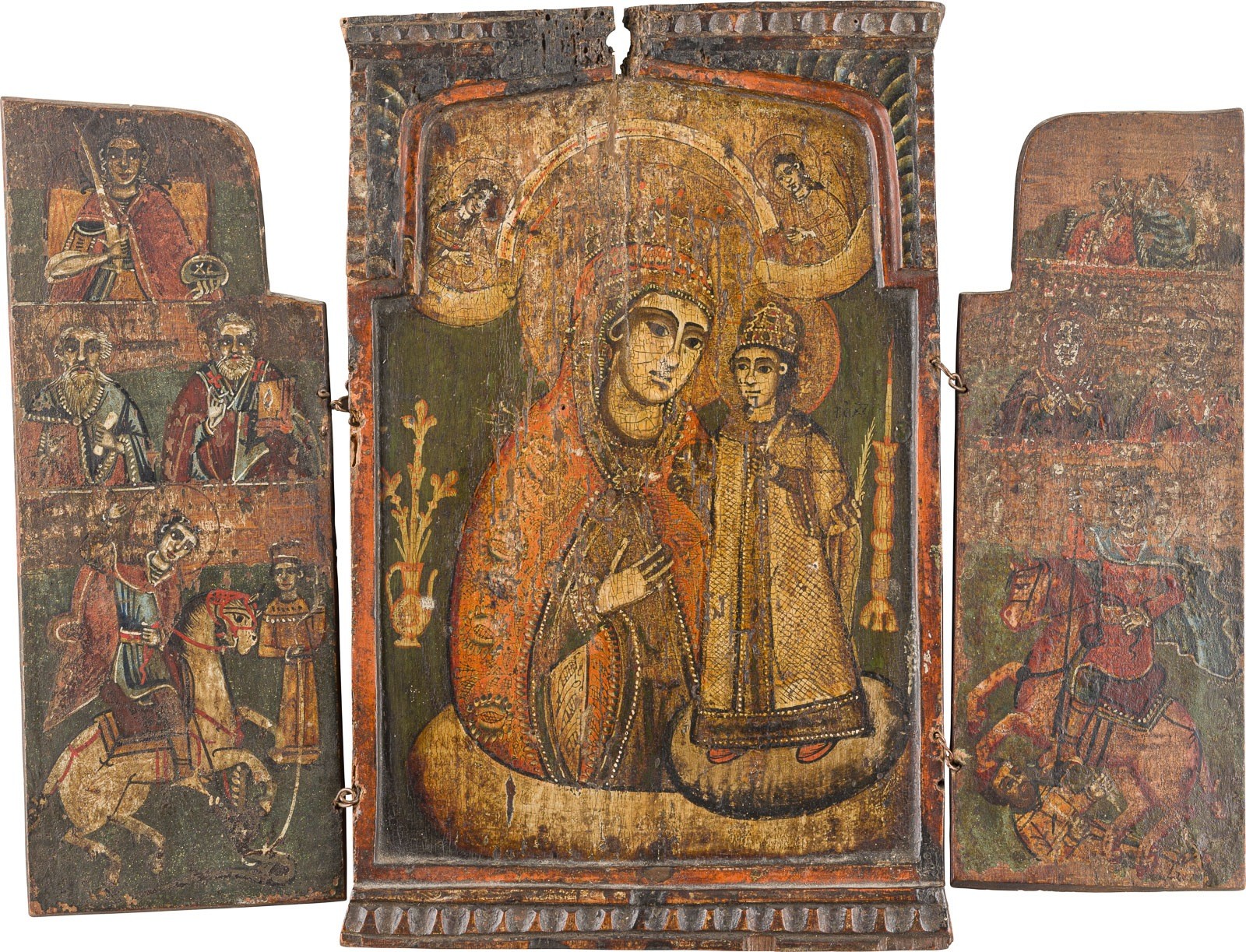 A TRIPTYCH SHOWING THE MOTHER OF GOD 'THE UNFADING ROSE' AND SELECTED SAINTS Bulgarian, 18th century Tempera on wood panels. Minor losses. 31.8 x 41.4 cm (extended).