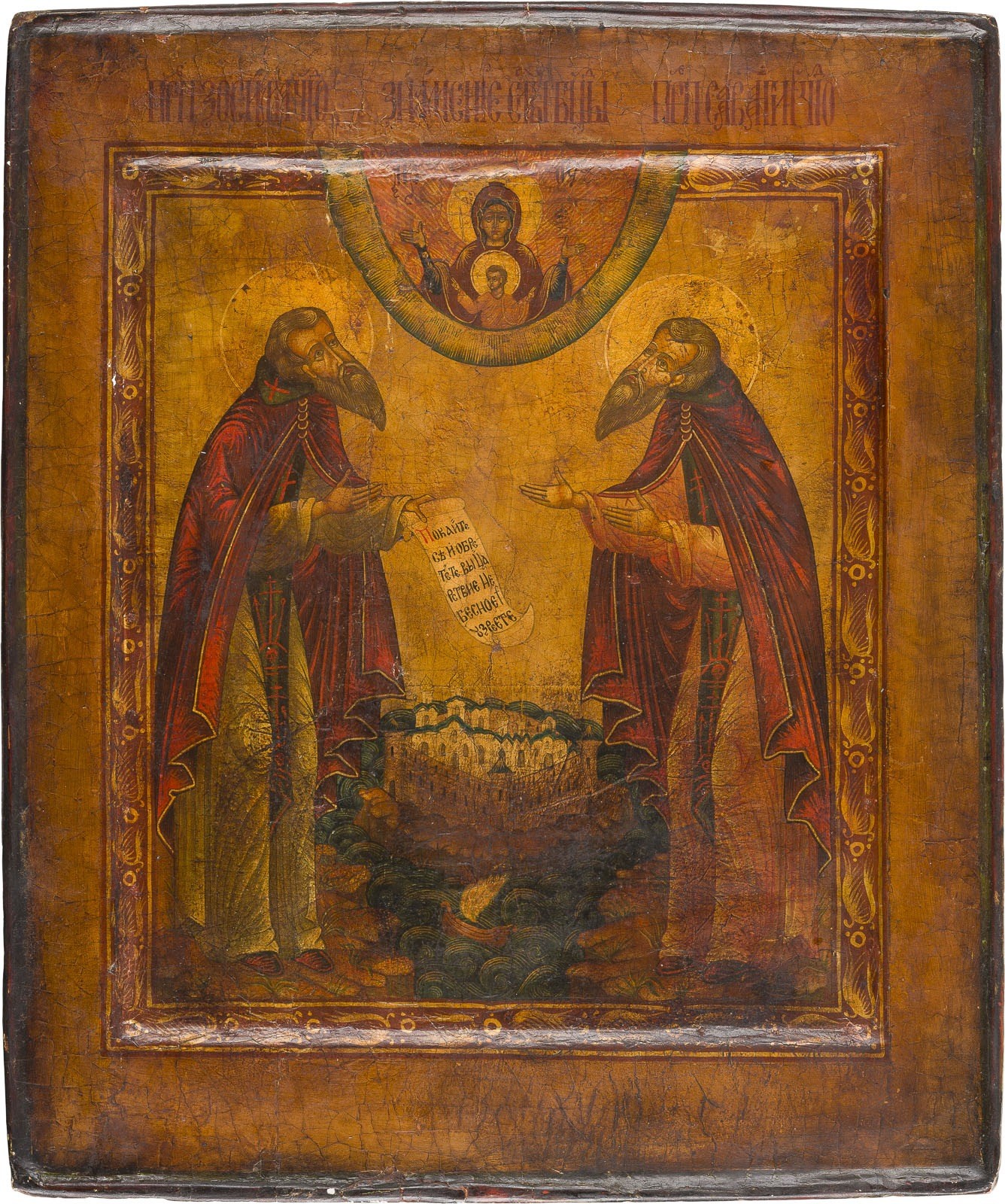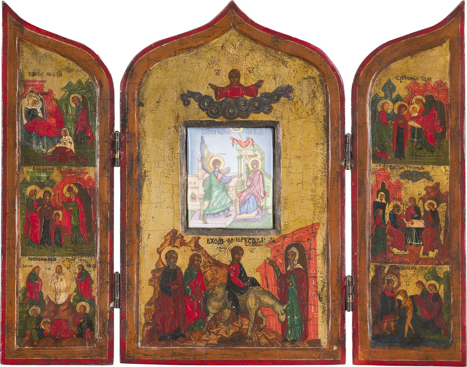 A TRIPTYCH WITH A FINIFT SHOWING THE ANNUNCIATION FLANKED BY MAIN FEASTS AND AN ICON OF STS. ZOSIMA AND SAVATIY 20th century Tempera / oil on wood panels, on gold ground. 25.2 x 32.6 cm (extended) / 30.3 x 25.4 cm.