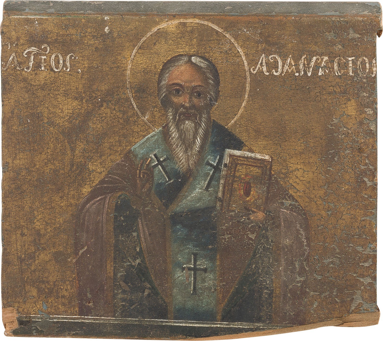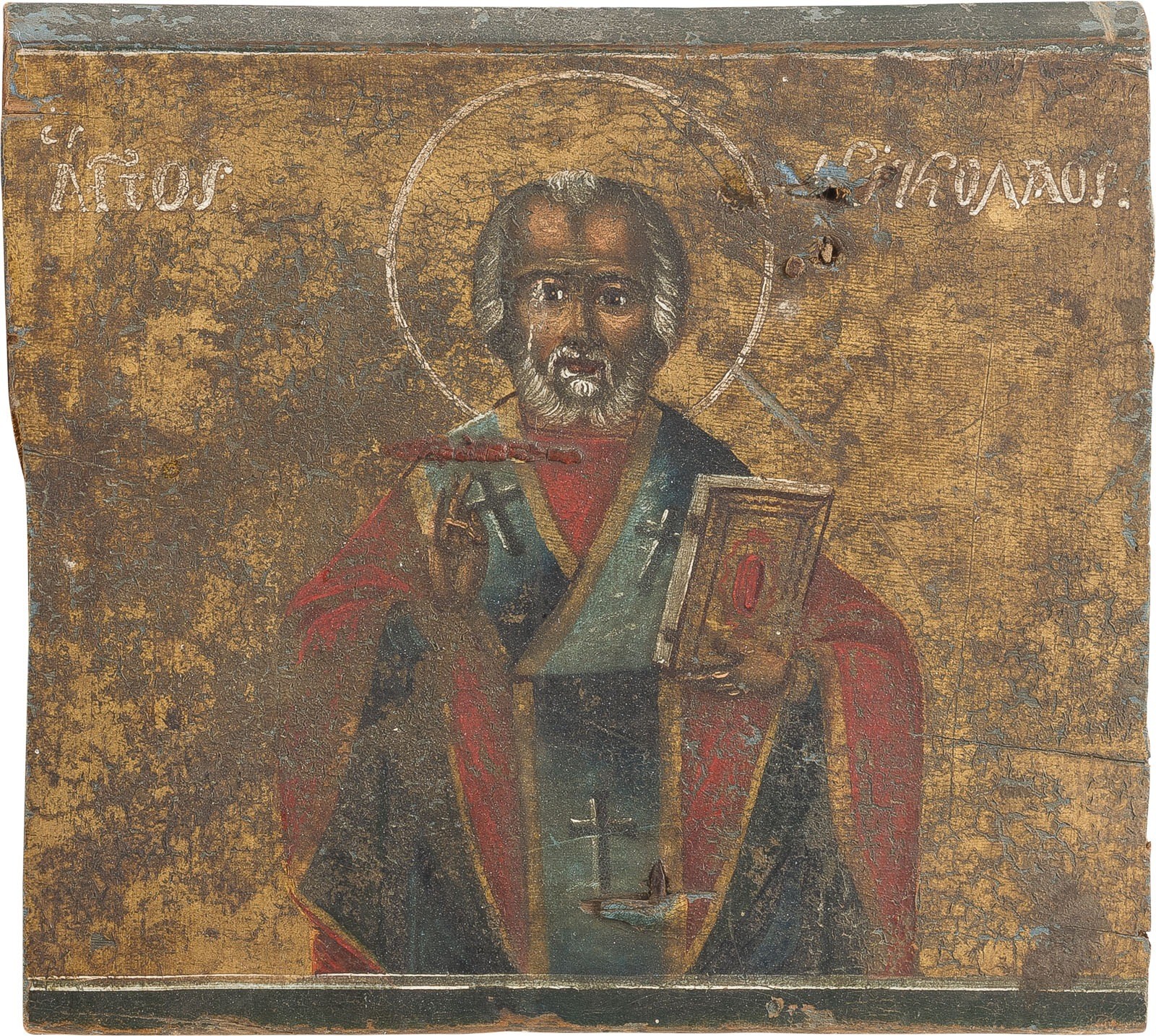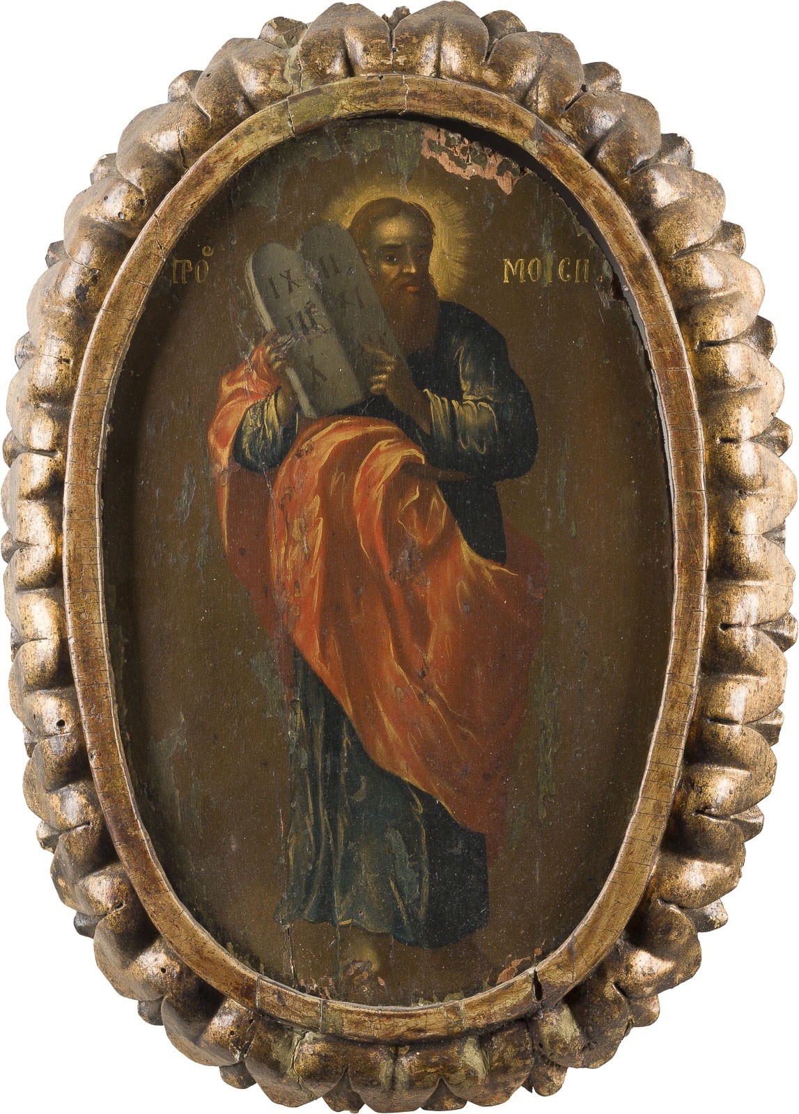 FOUR ICONS SHOWING THE PROPHET MOSES, STS. NICHOLAS OF MYRA AND ATHANASIOS AND ST. MARK THE EVANGELIST Russian / Romanian, 18th/19th century Tempera / oil on wood panels. The background made of gold. Minor losses. 14.2 x 37 cm high.