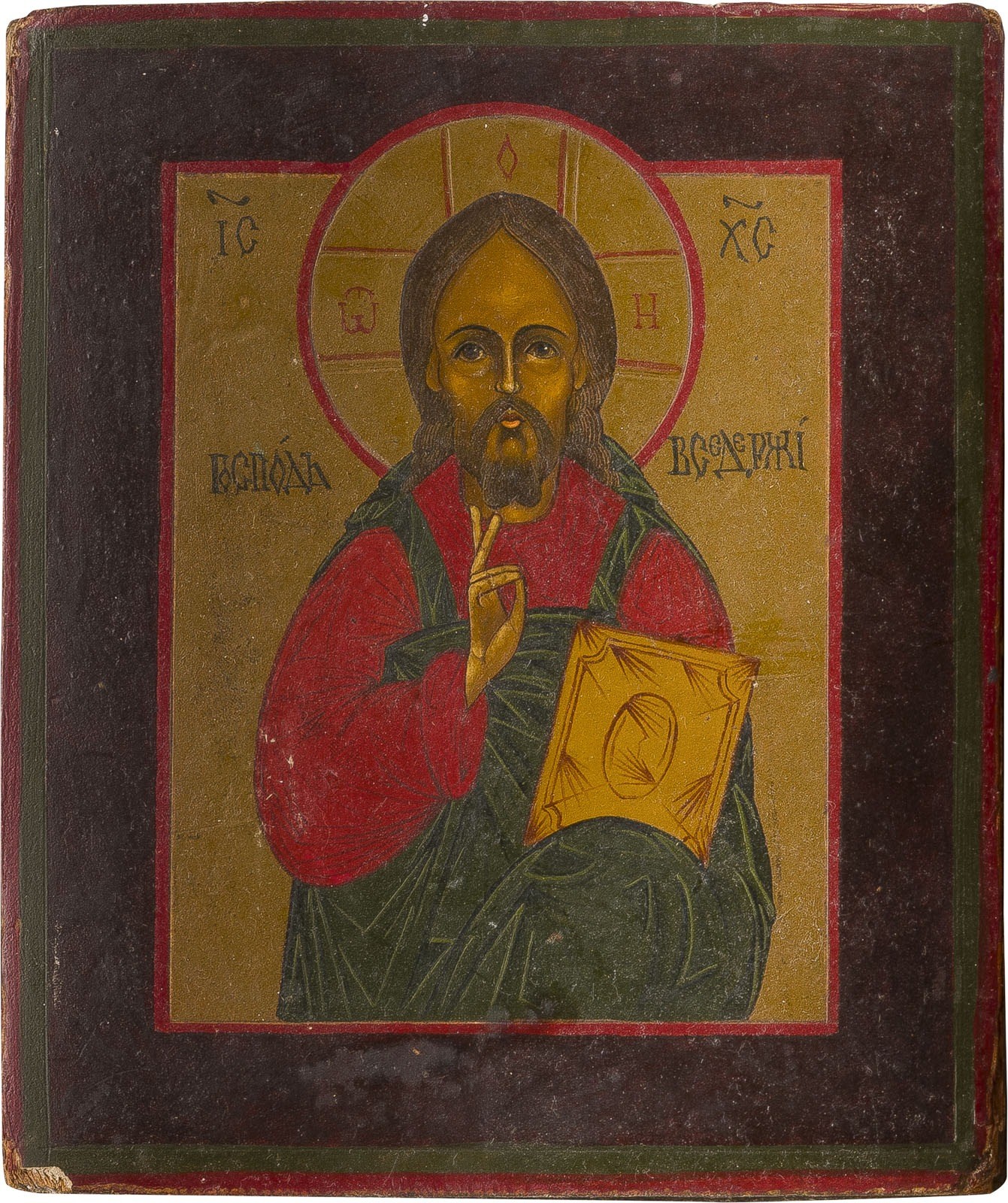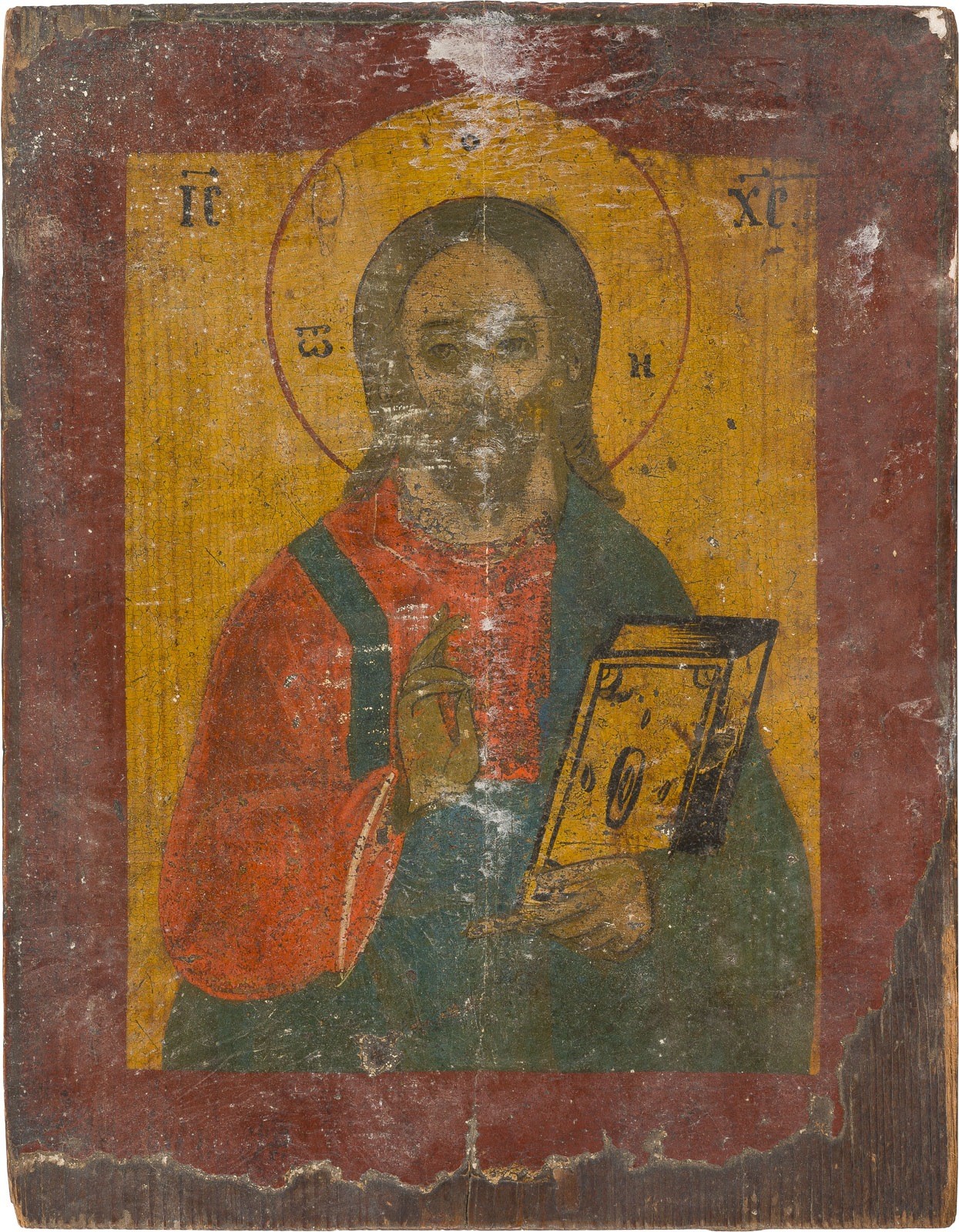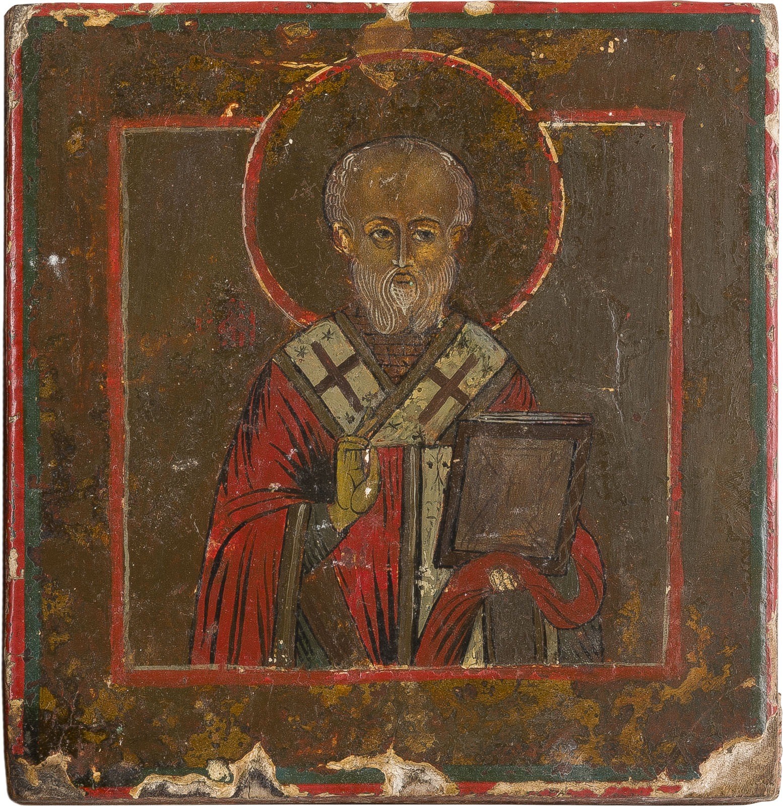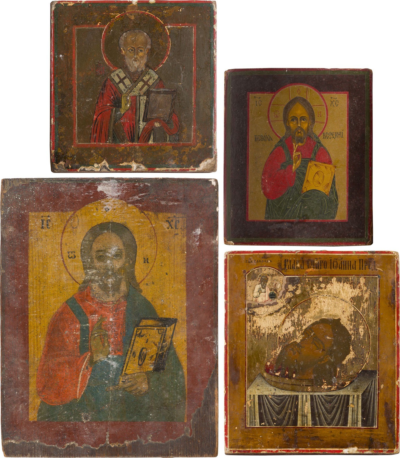 FOUR SMALL ICONS SHOWING CHRIST PANTOKRATOR, ST. NICHOLAS OF MYRA AND THE HEAD OF ST. JOHN THE FORERUNNER Russian, 19th / 20th century Tempera on wood panels. The background made of silver, covered by a golden lacquer. Losses, damages. 16.2-27.4 cm high.